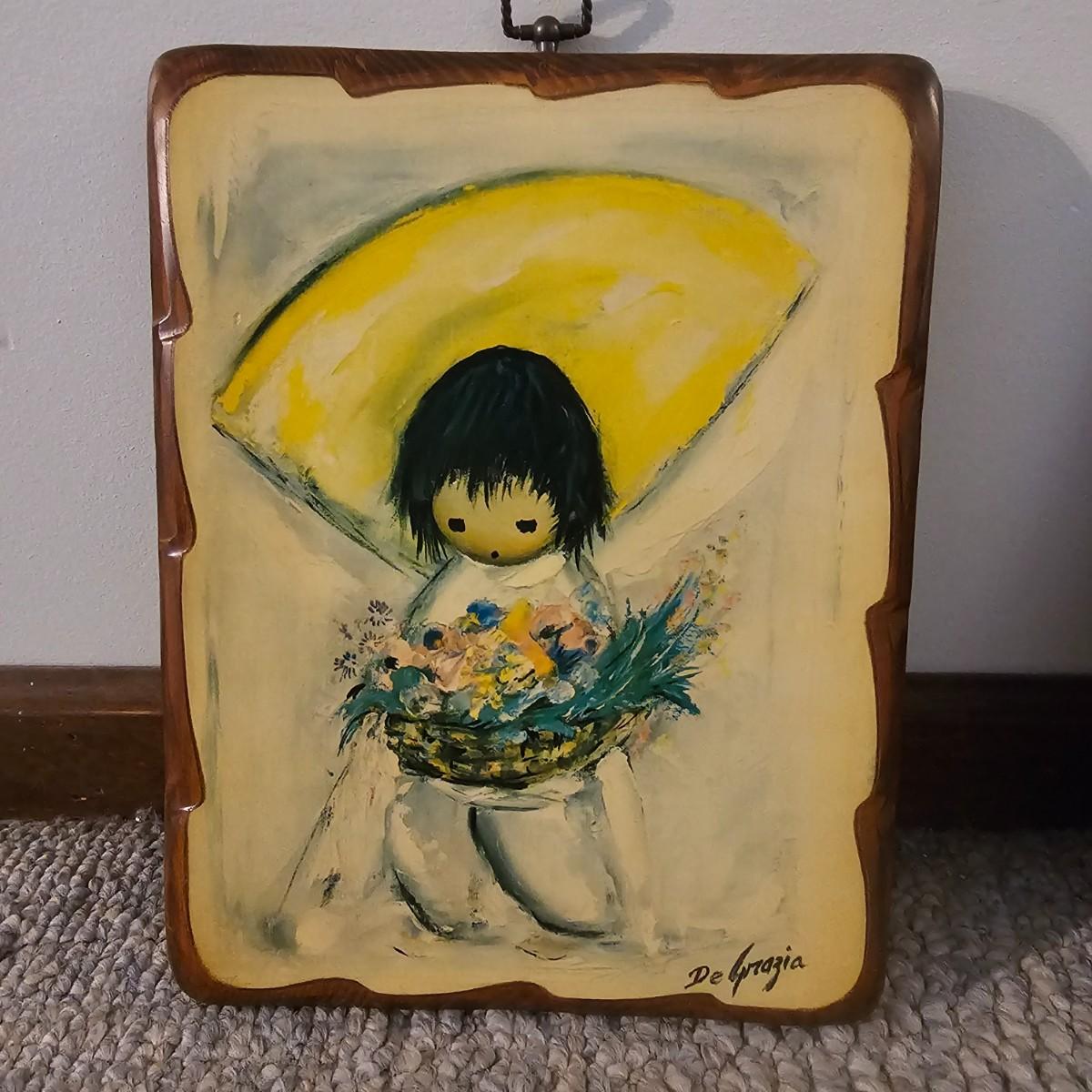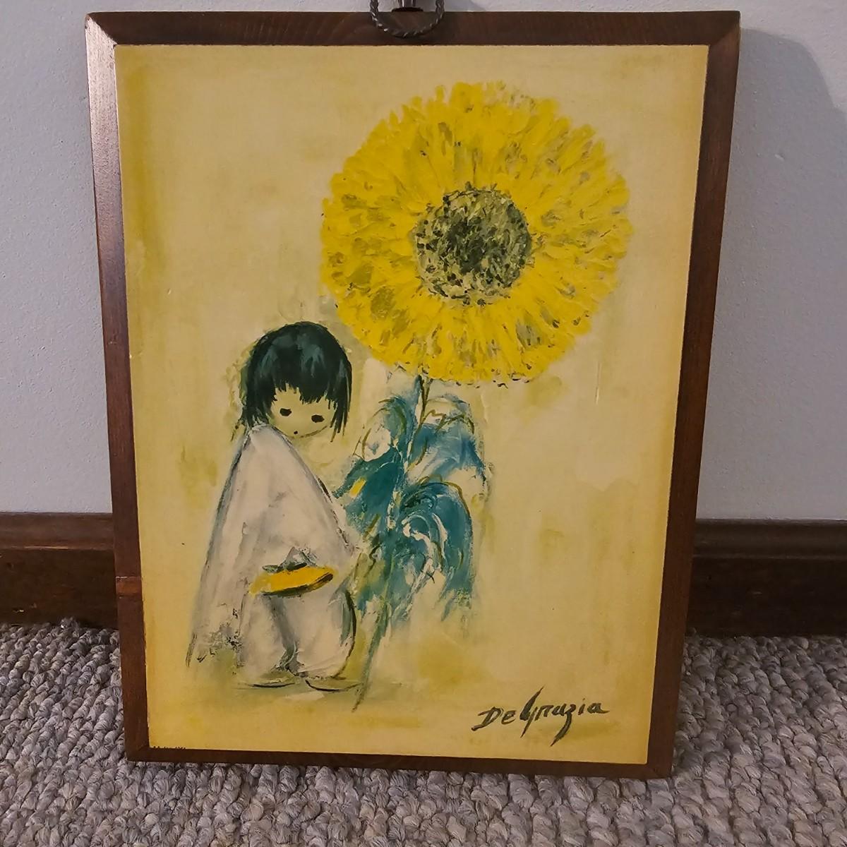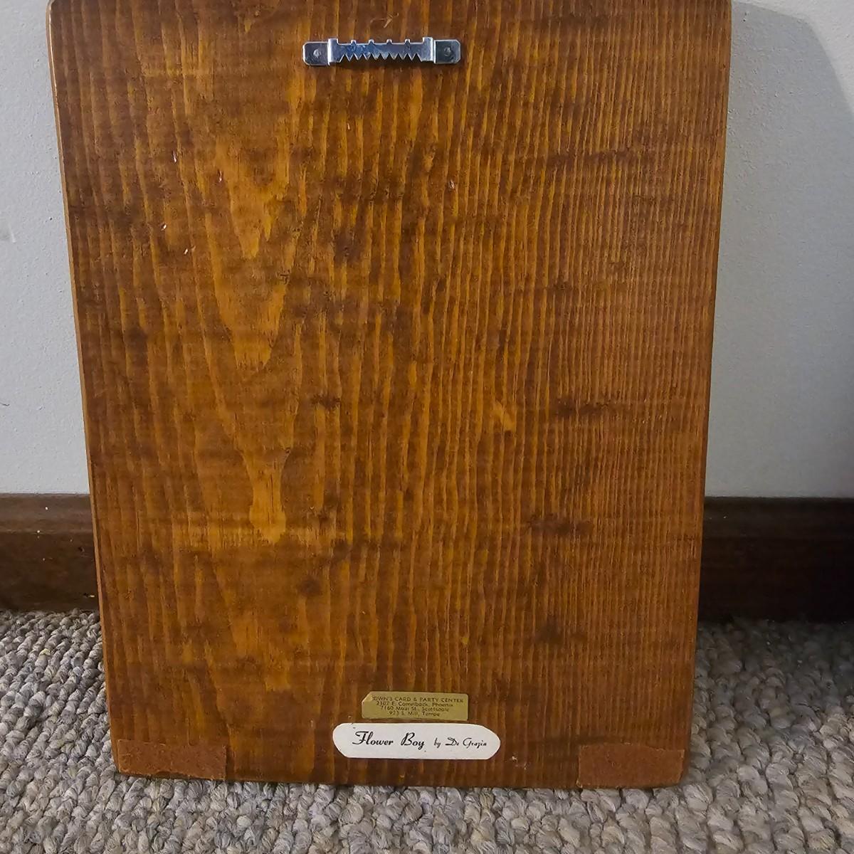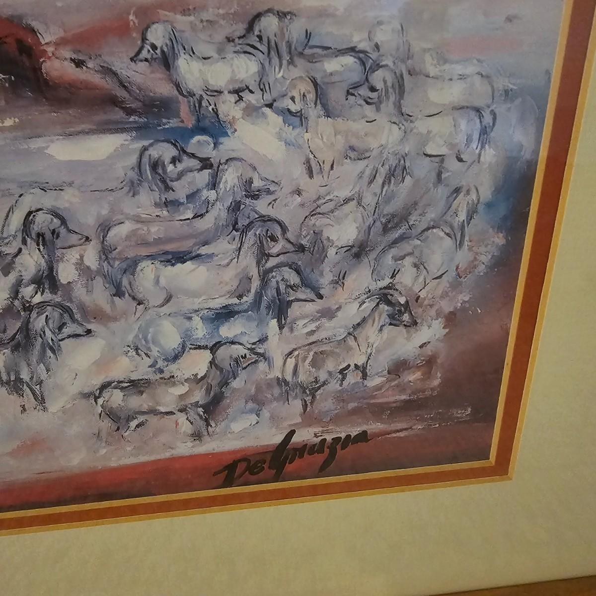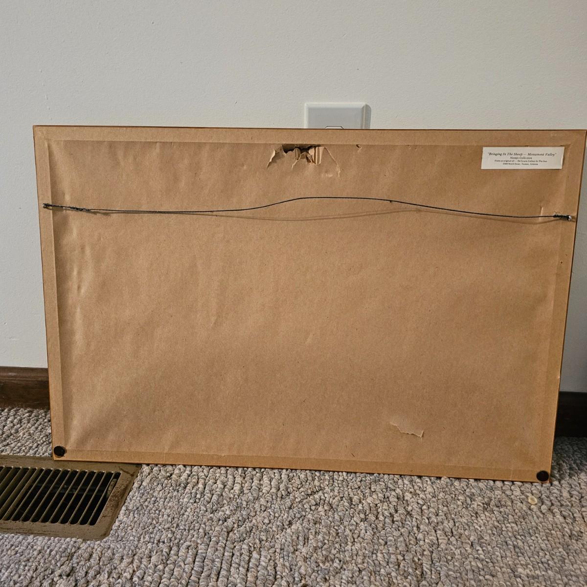 Two traditional framed images and three what appear to be decoupage over prints on solid wood background. Image of 'Apache Mother' is signed and is personalized and hand signed by artist in lower left corner. Measures 18.5" x 21.5". 'Bringing in the Sheep' is similar, signed print with hand signed personalization measuring 27.5" x 18.5". Three delightful flower children are 9" x 12" to 10" x 13". Prints appear to be signed. See photos for details. Shipping available. Shipping can be costly. We suggest contacting our preferred local shipping provider, Postage Express, with dimensions and getting an estimate before bidding: (828) 255-9250 or shipping@postageexpressnc.com.