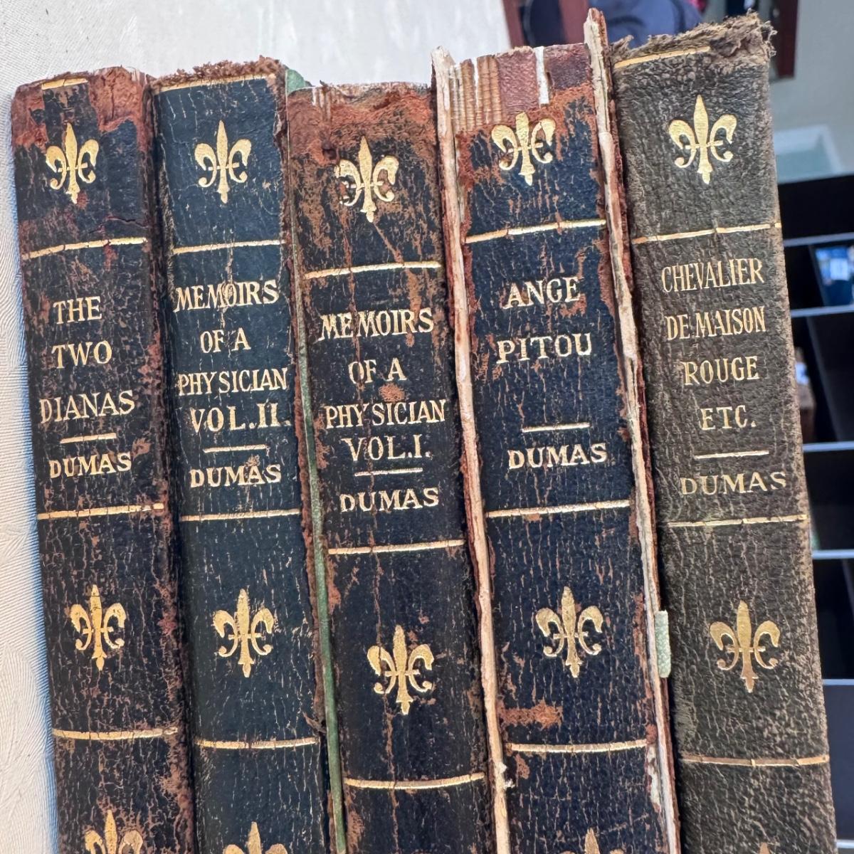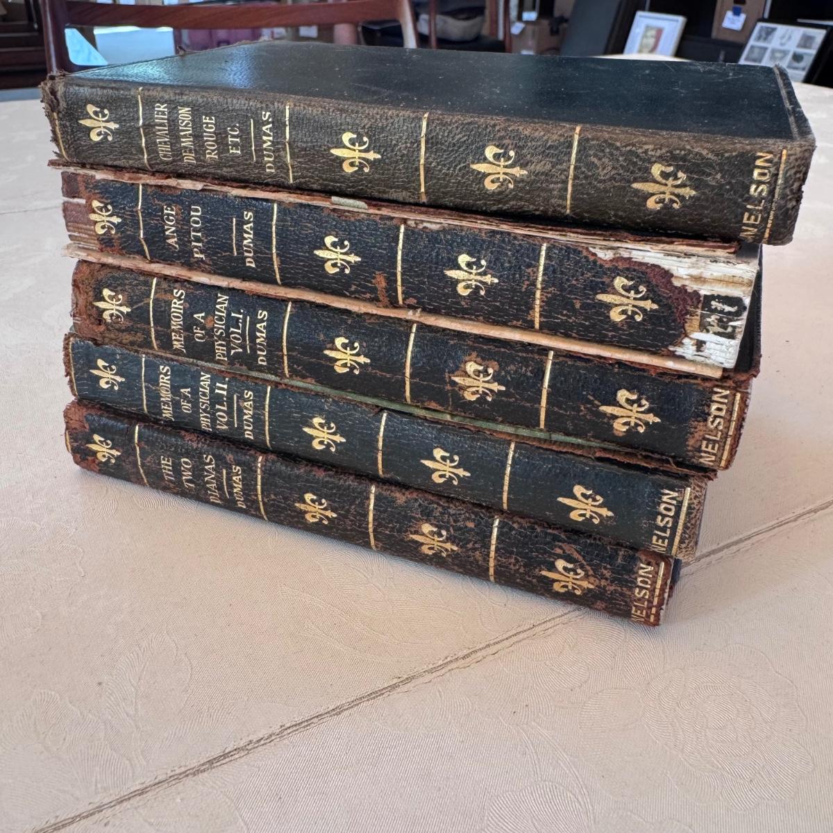 This lot includes five New Century Library leather book by Dumas. The books are very old and two of them have detached covers - see pictures included. You’ll find “The Two Diana’s,” “Memoirs of a Physician” vol. I and II, “Ange Pitou,” and “Chevalier De Madison Rouge Etc.” Shipping available.