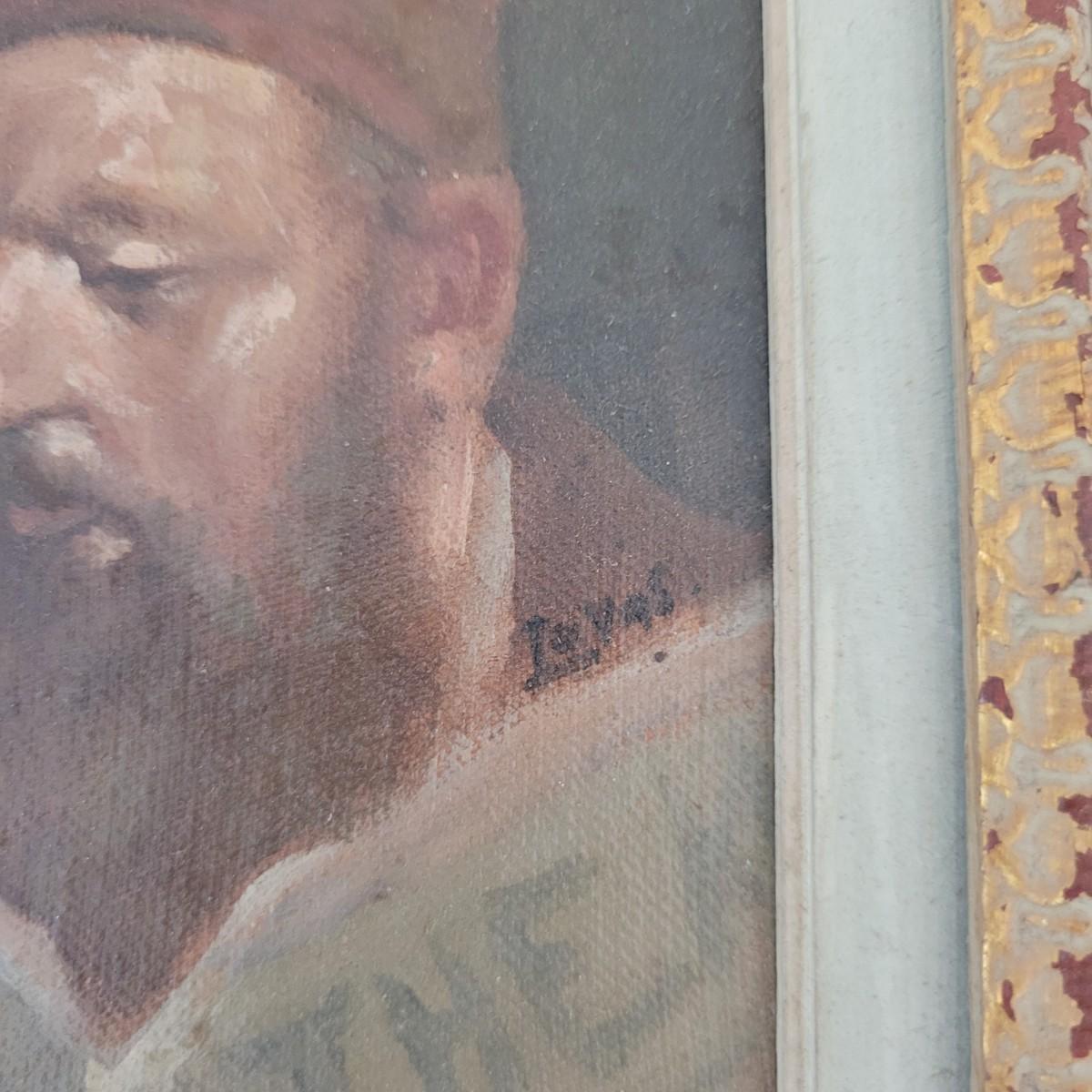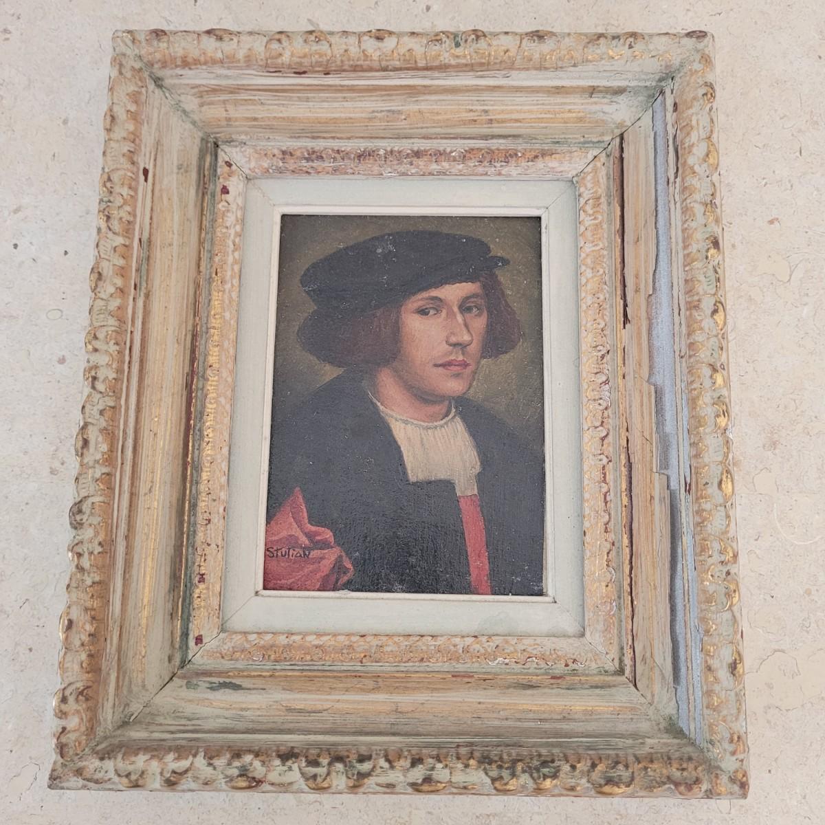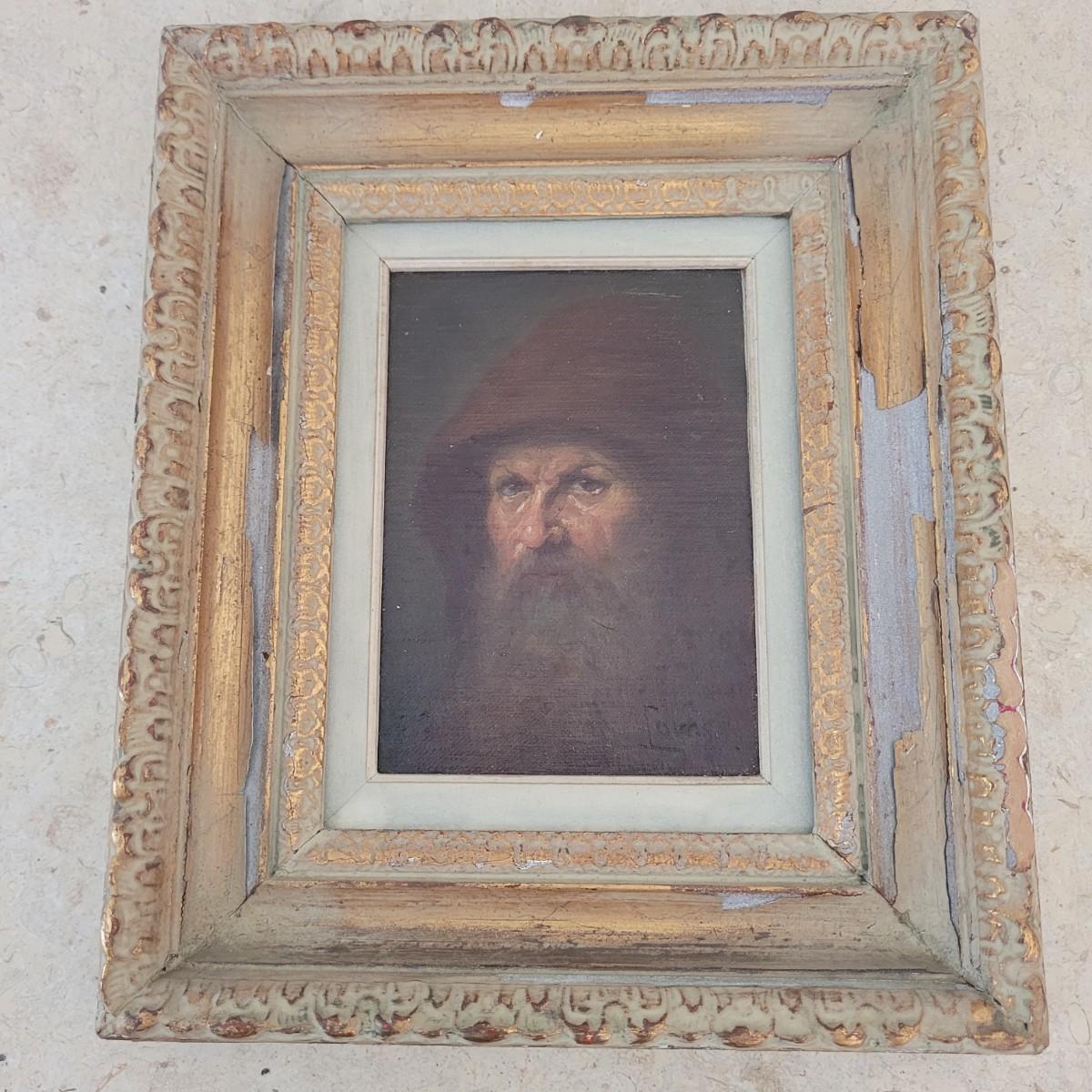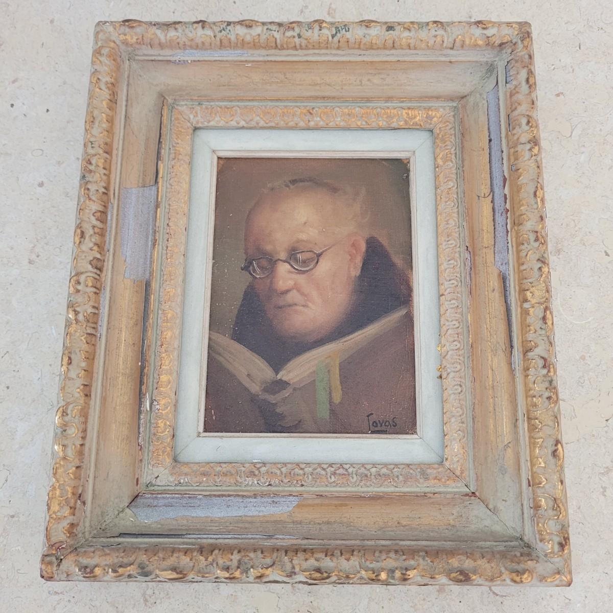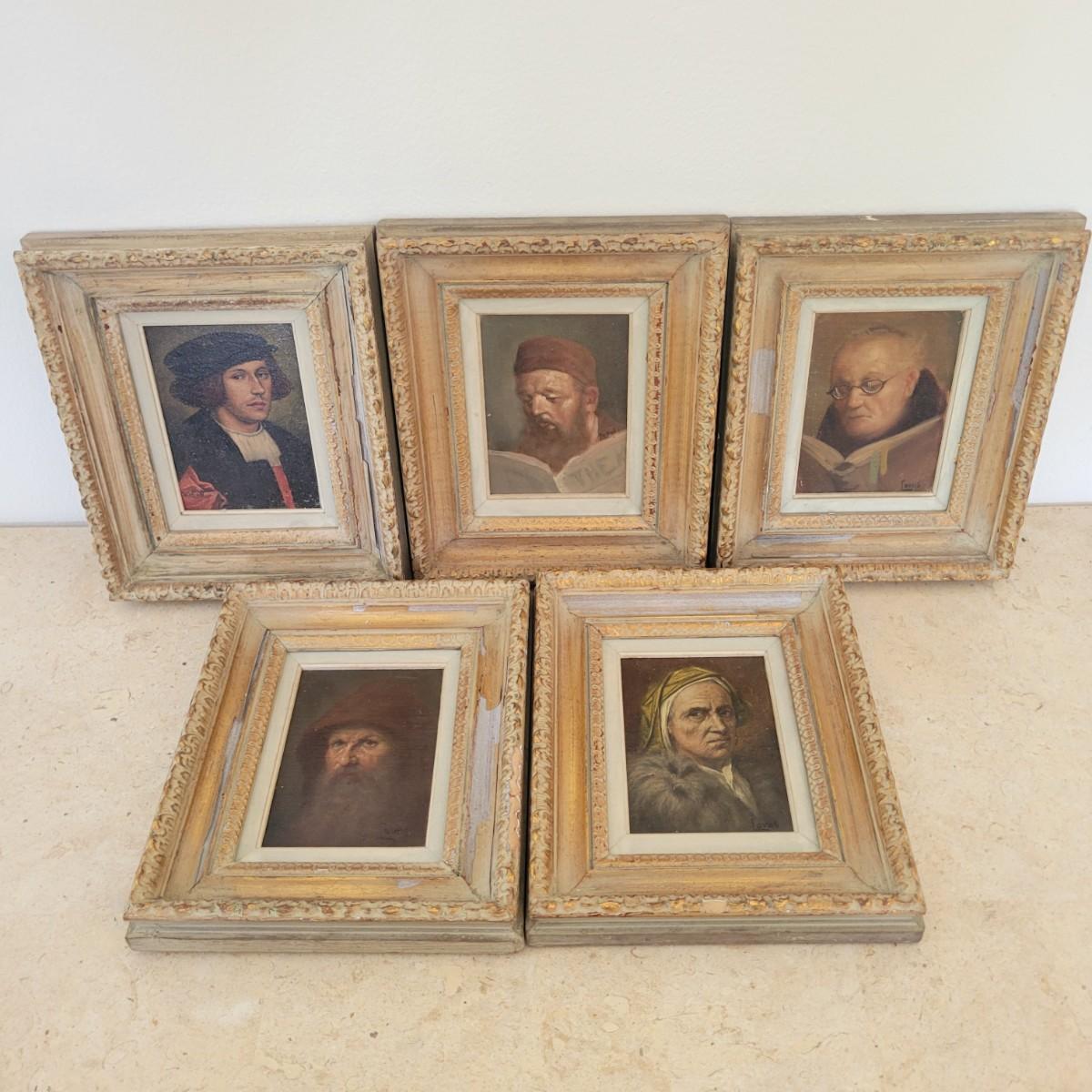 This lot includes five pieces of wall art. Each piece appears to be an original oil on canvas. The pieces depict the faces of five different individuals some of which appear to be priests, monks, and scholars. Each piece is framed in wood and signed by the artist. Four are signed by "Tovas" and one is signed "Stutian". Individually, the frames measure 8.5" x 10"H.