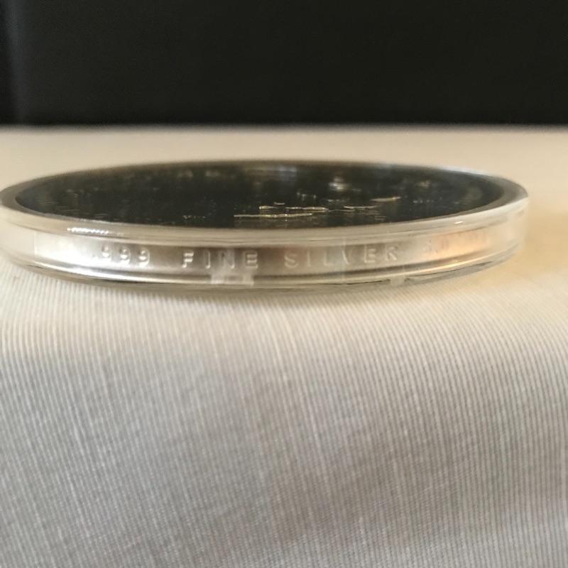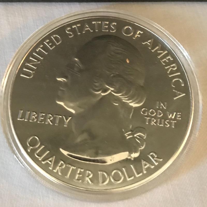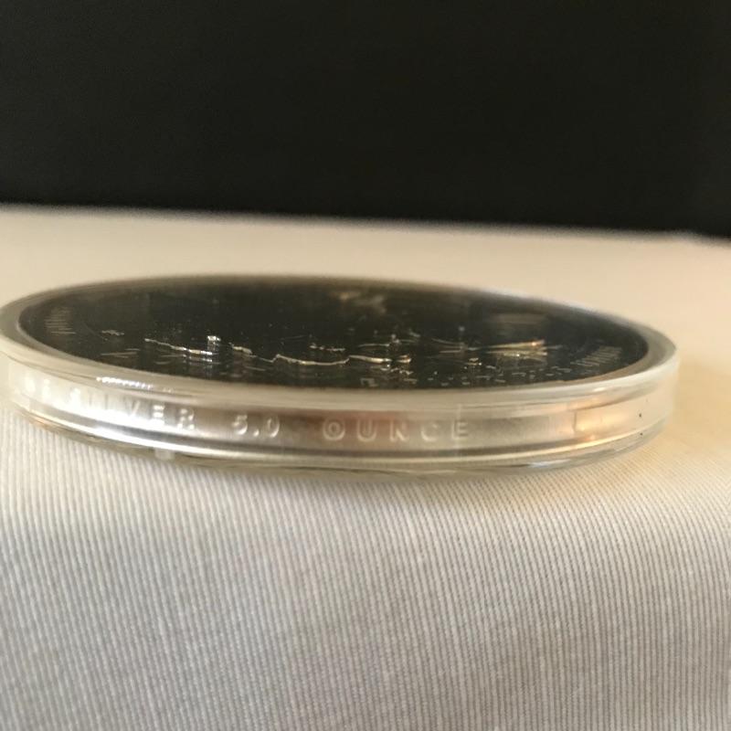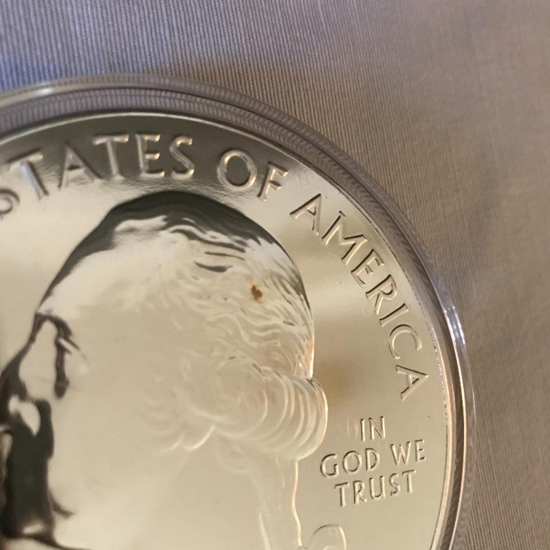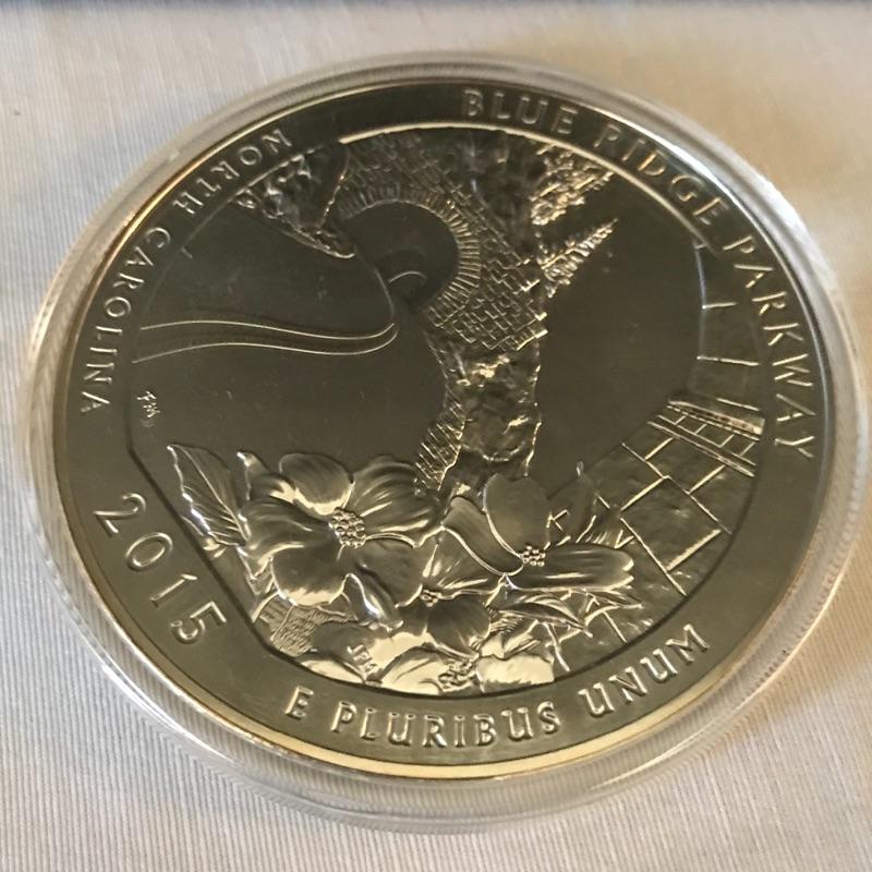 America the Beautiful five ounce .999 Silver Blue Ridge National Parkway. There is a spot noted in photos, it appears to be a crumb inside the plastic case.
