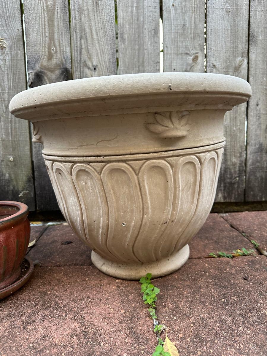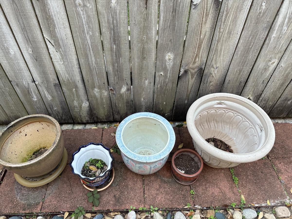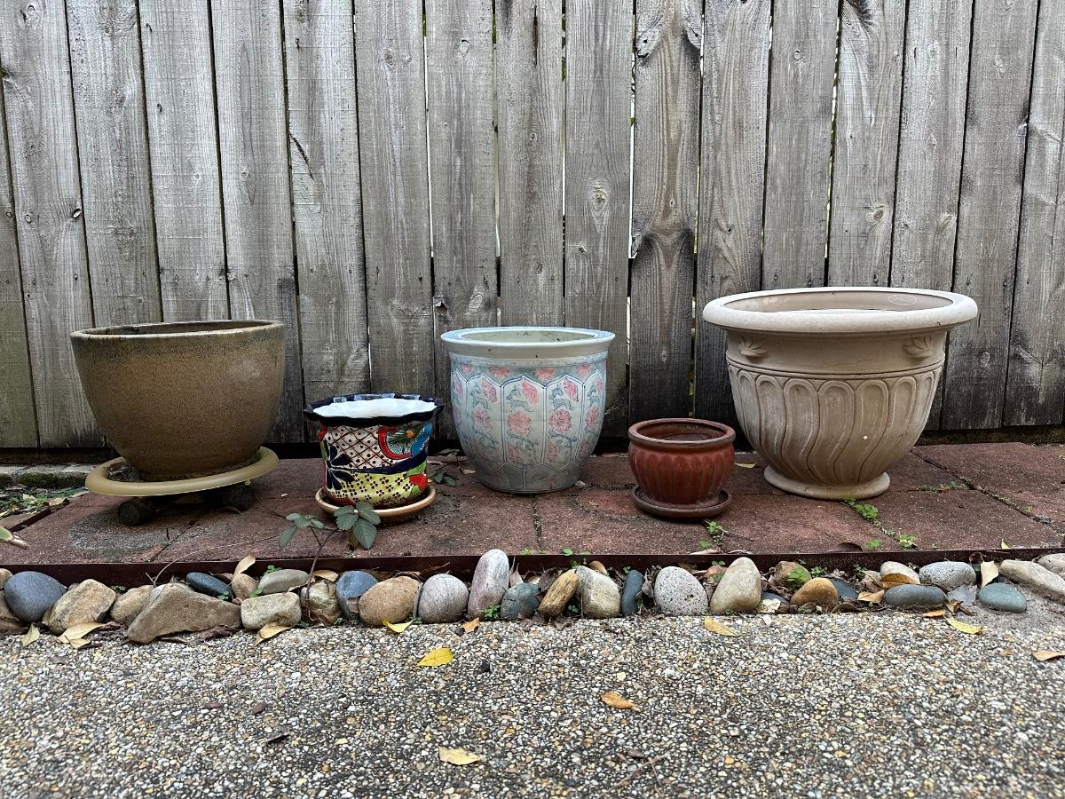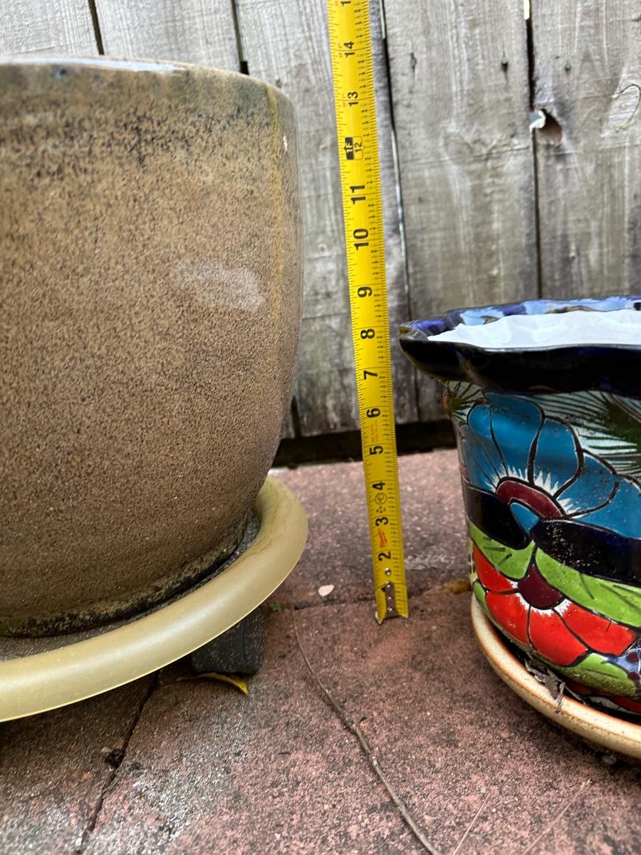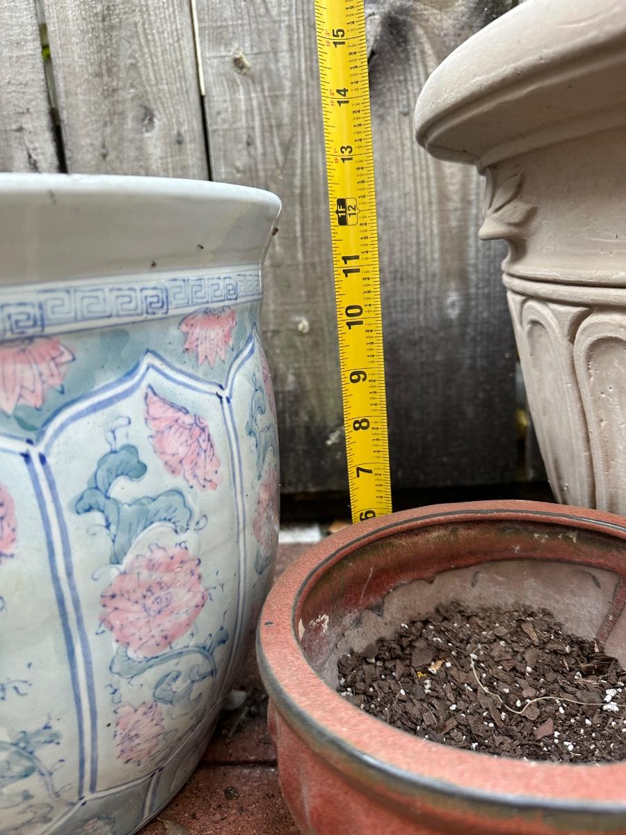 See crack on floral pot. It is still sturdy. Tan pot is plastic and the rest are ceramic. See height in pictures.