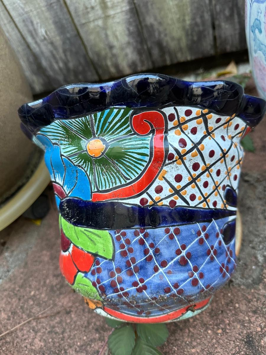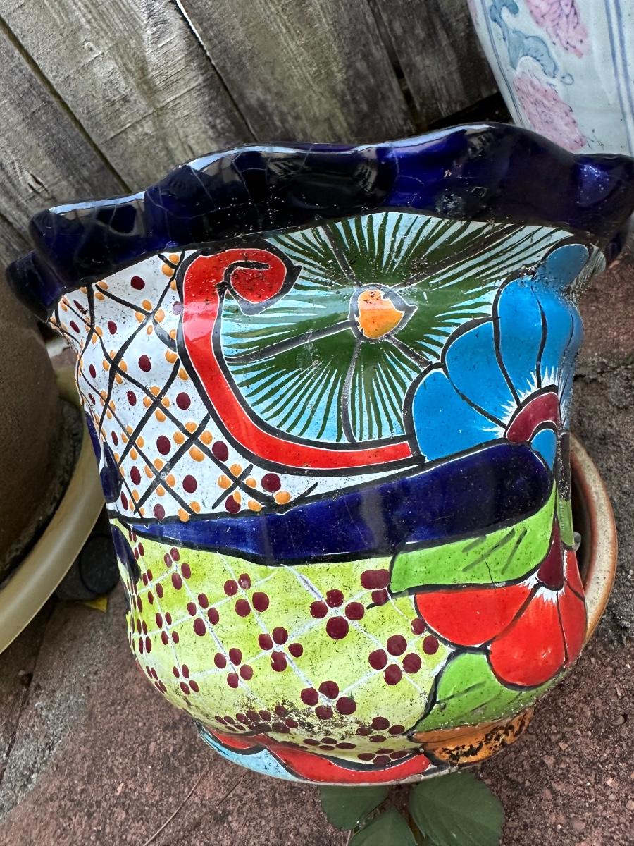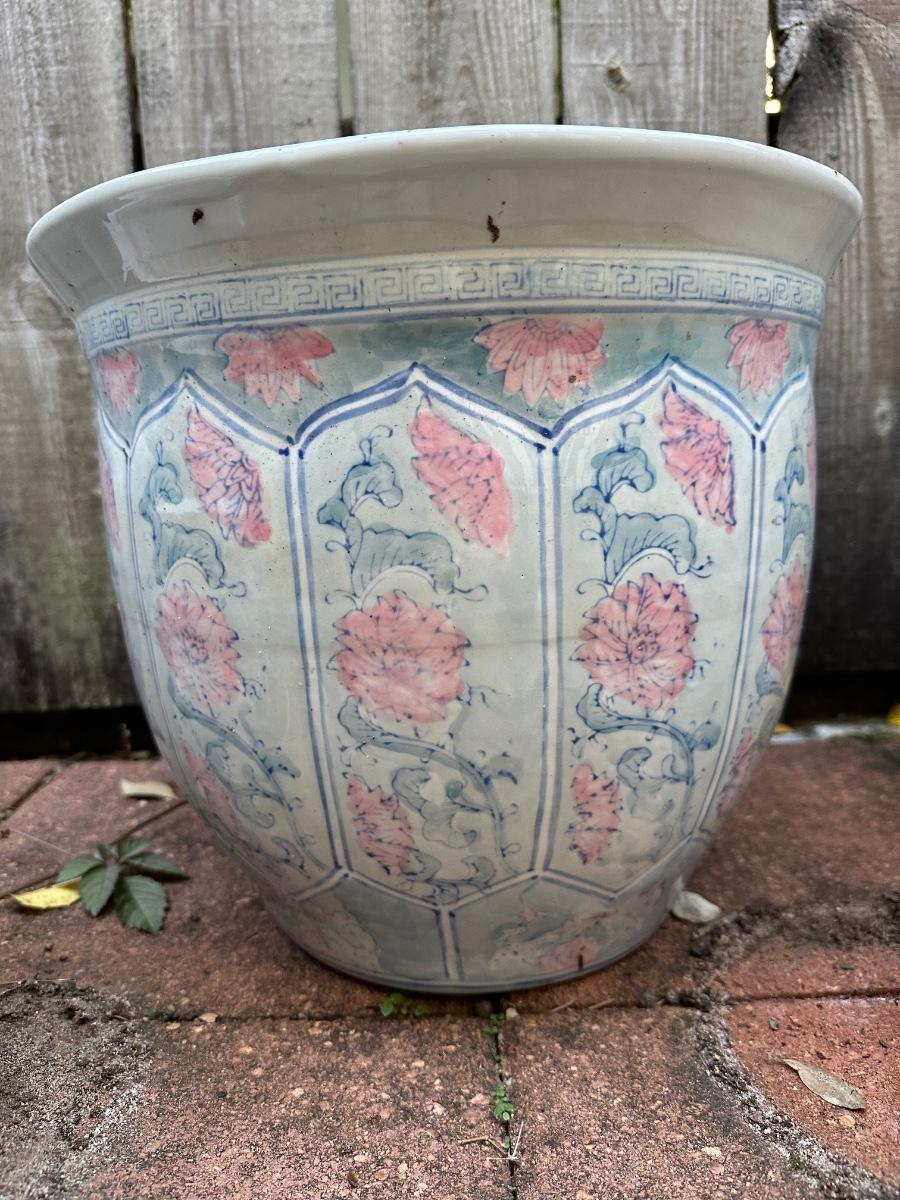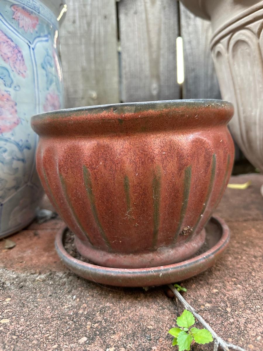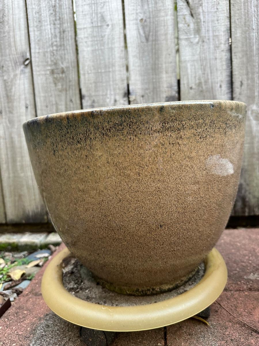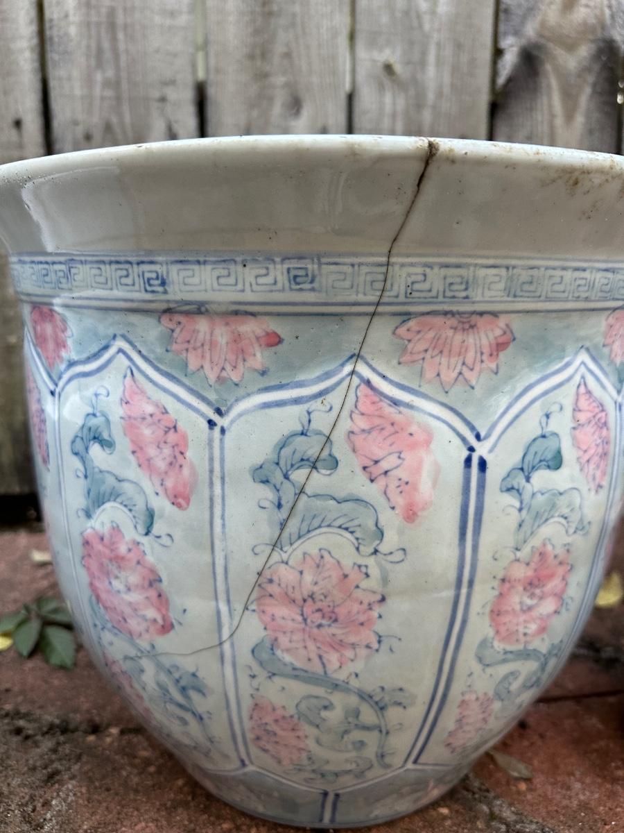 See crack on floral pot. It is still sturdy. Tan pot is plastic and the rest are ceramic. See height in pictures.