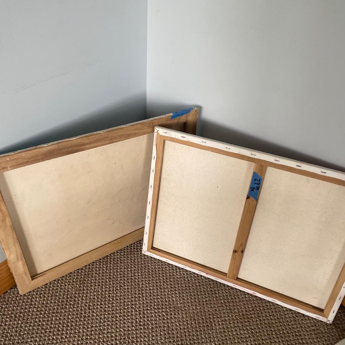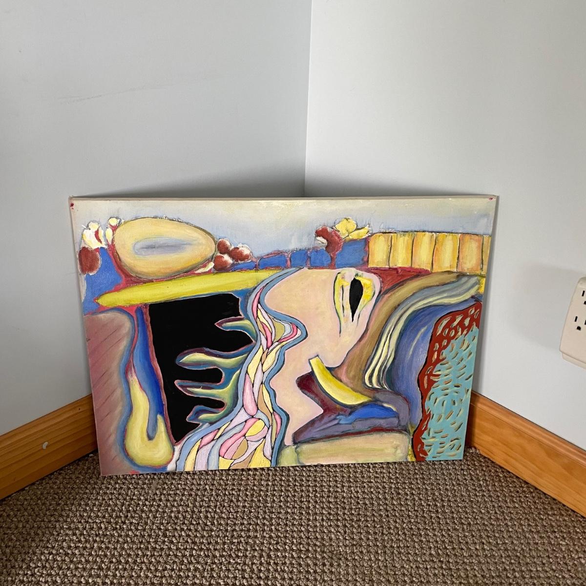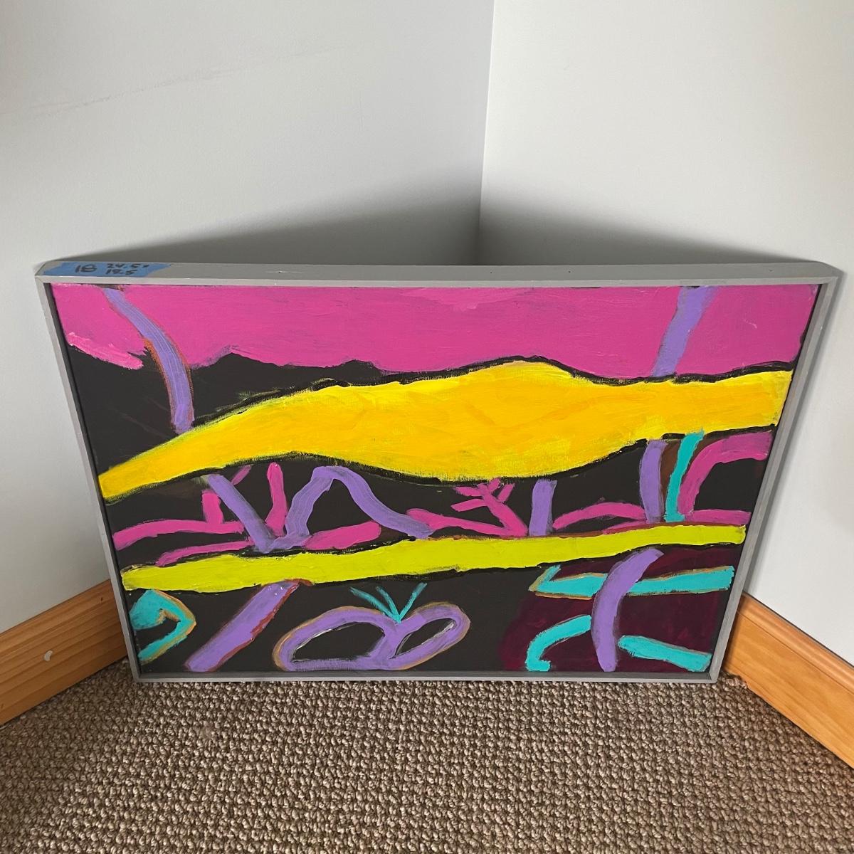 These colorful pieces of art on canvas appear to be acrylic and are all mounted on wood frames. No signatures on any of these pieces but we are told they were painted by local artist Ripp Smith.