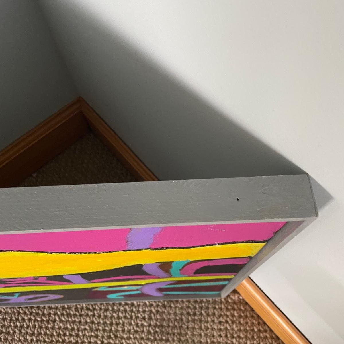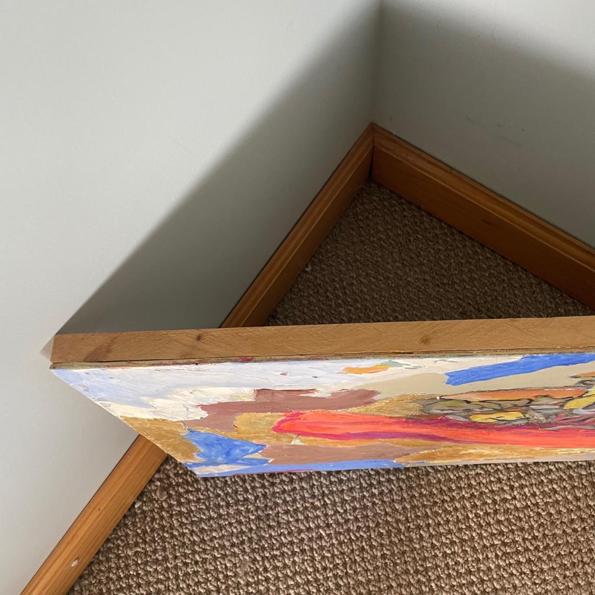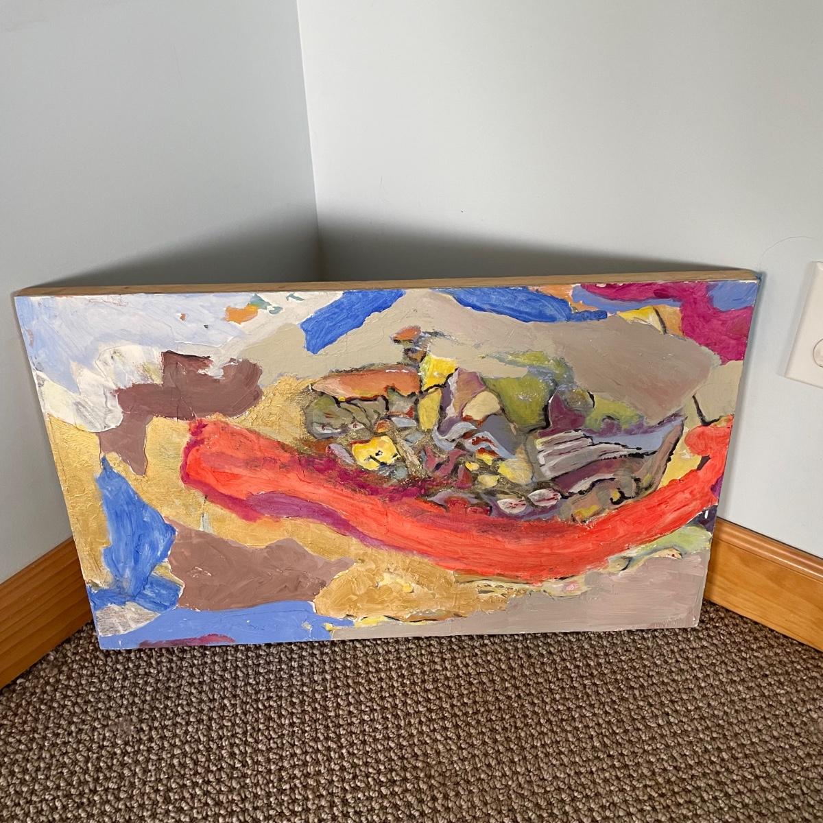 These colorful pieces of art on canvas appear to be acrylic and are all mounted on wood frames. No signatures on any of these pieces but we are told they were painted by local artist Ripp Smith.