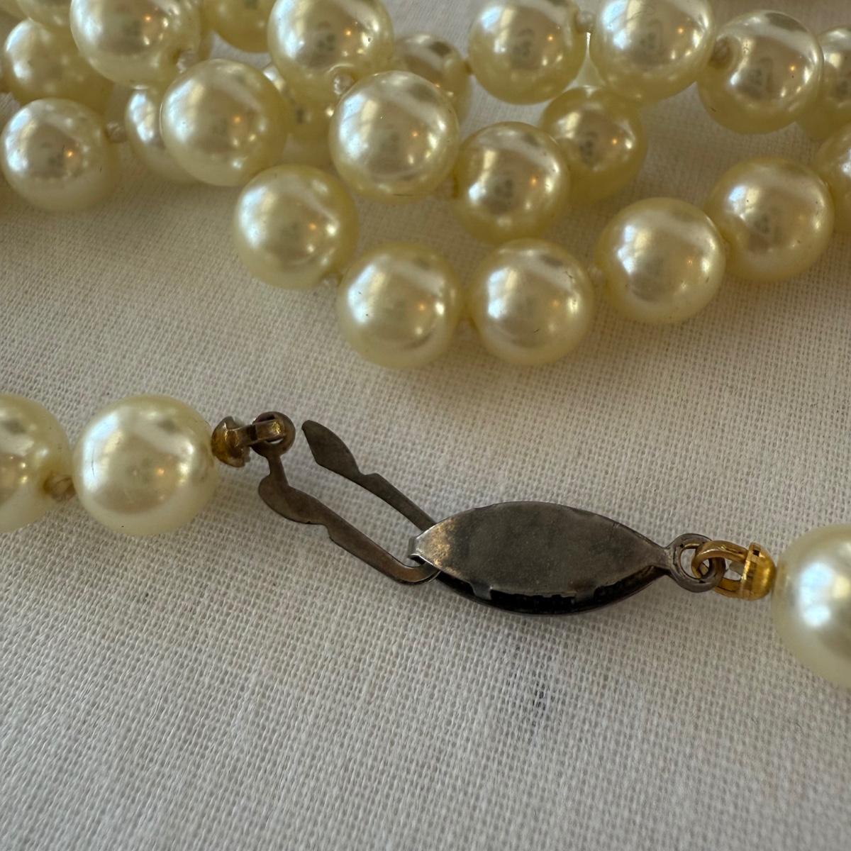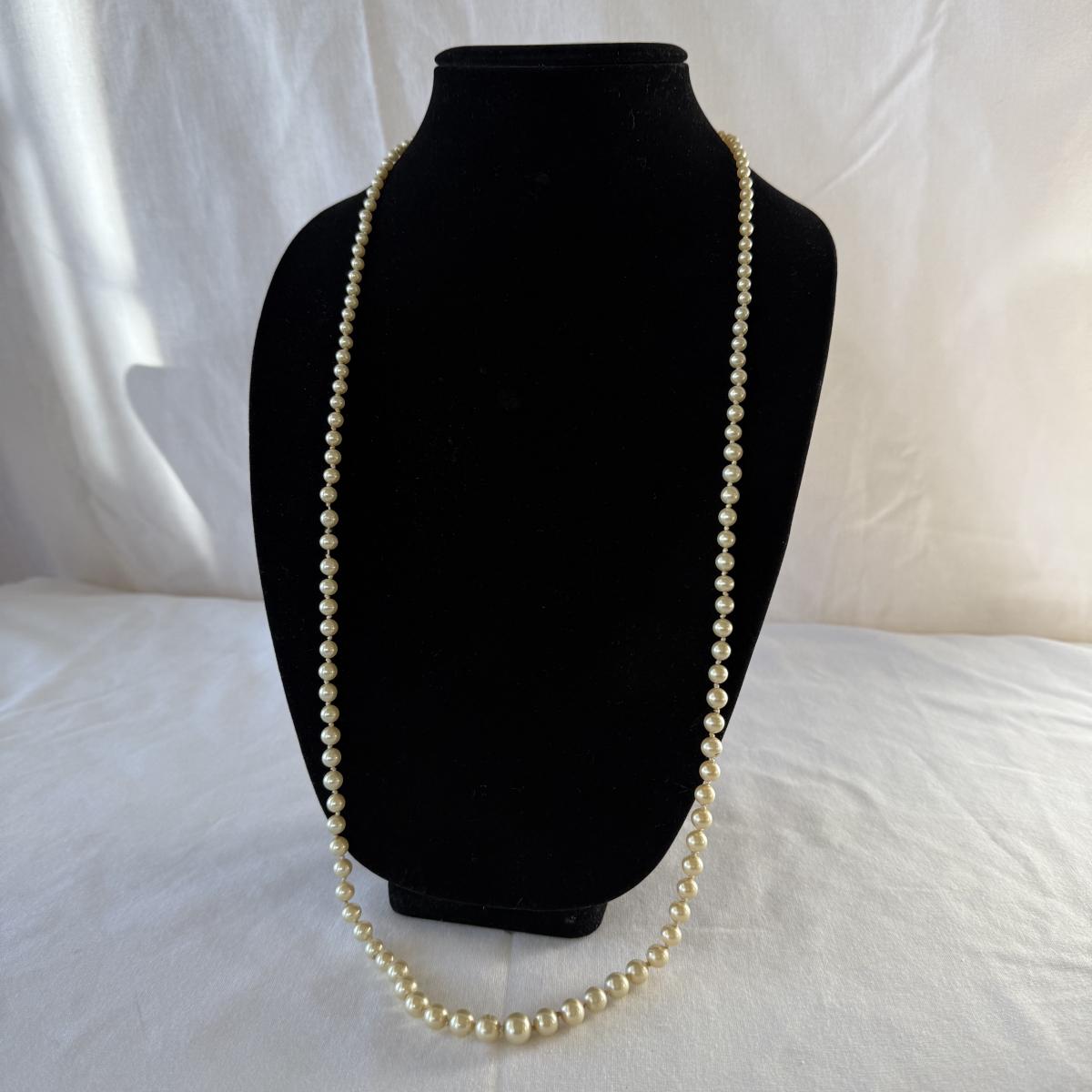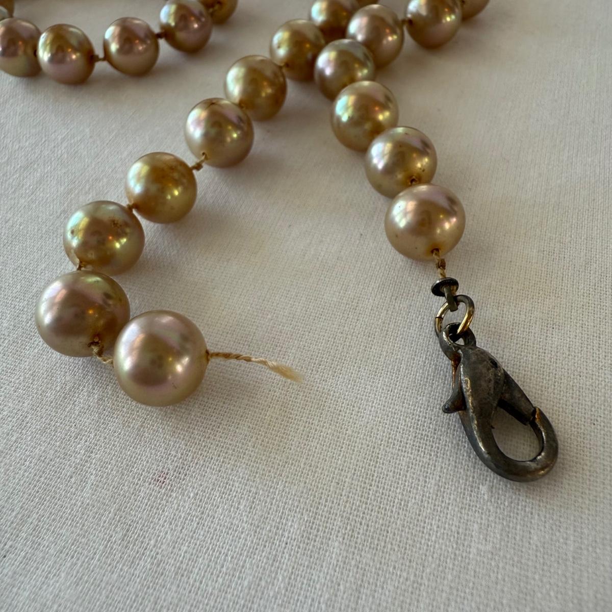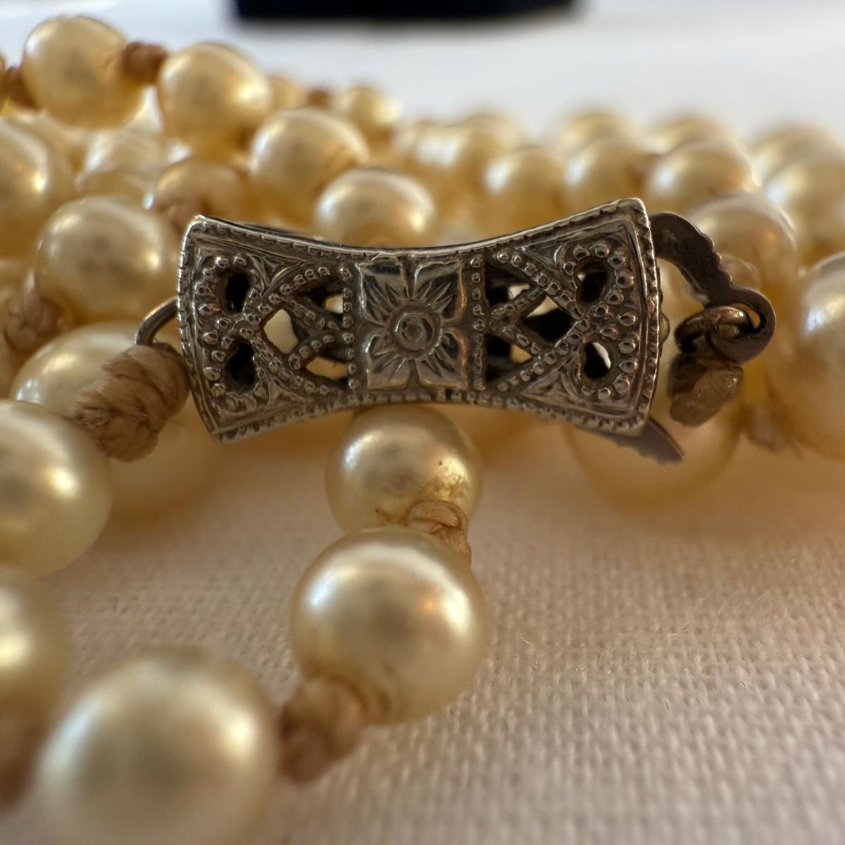 Five gorgeous pearl necklace strands. Each necklace is hand-knitted. One has a clasp stamped ‘Omar 10K’. One has a broken clasp. Three of the necklaces are white or off-white, and two have a light pink tone. We cannot verify the authenticity of the pearls. A lovely light blue satin pouch is included. The longest necklace, which has multiple sizes of beads, is approximately 52“.