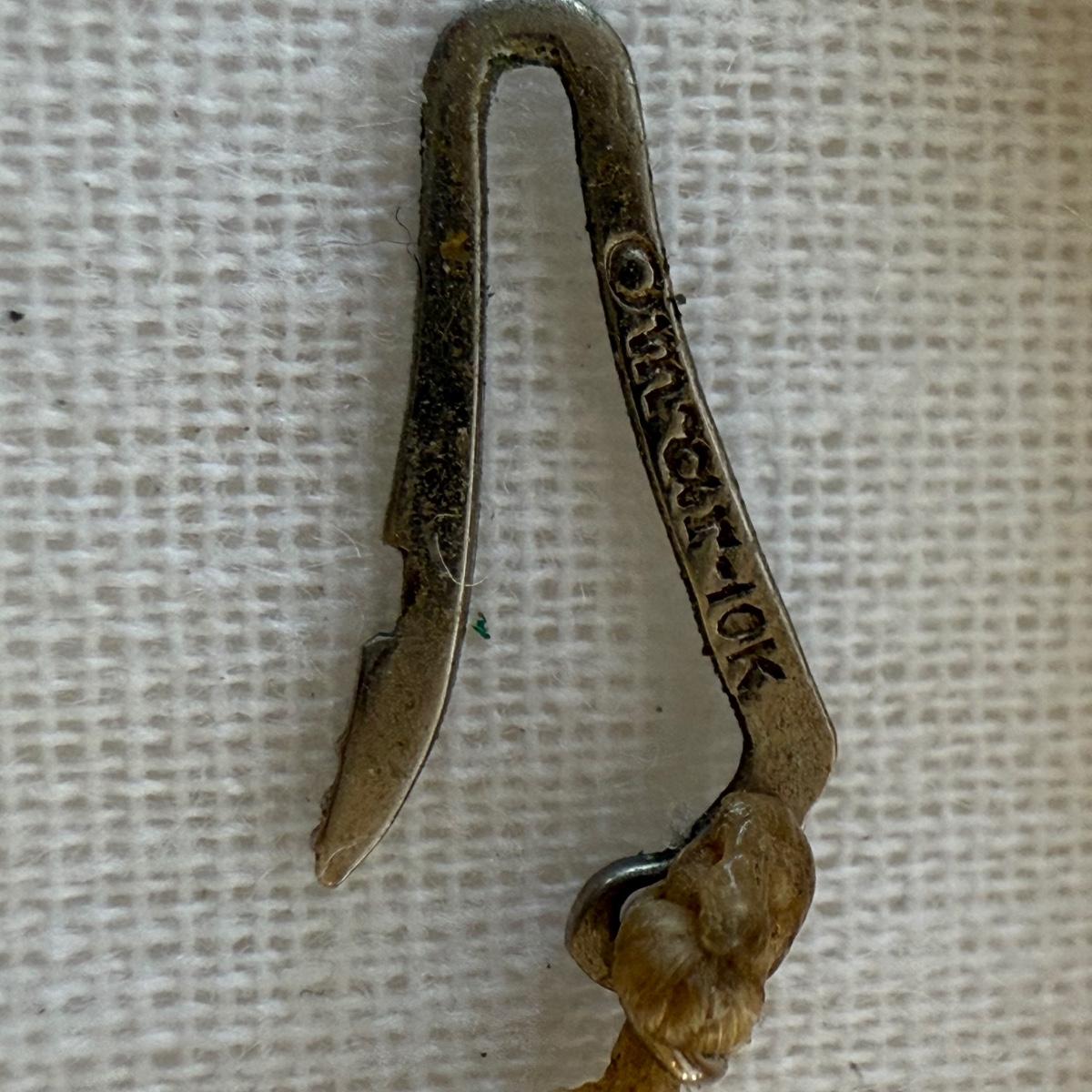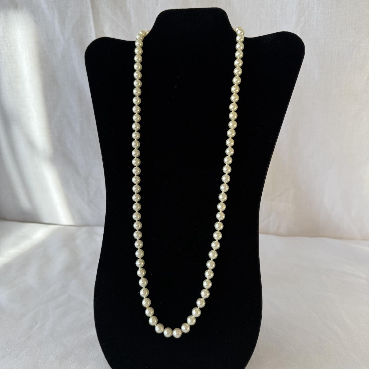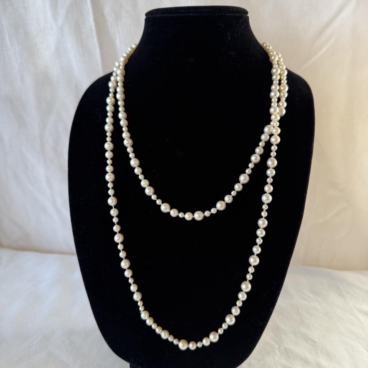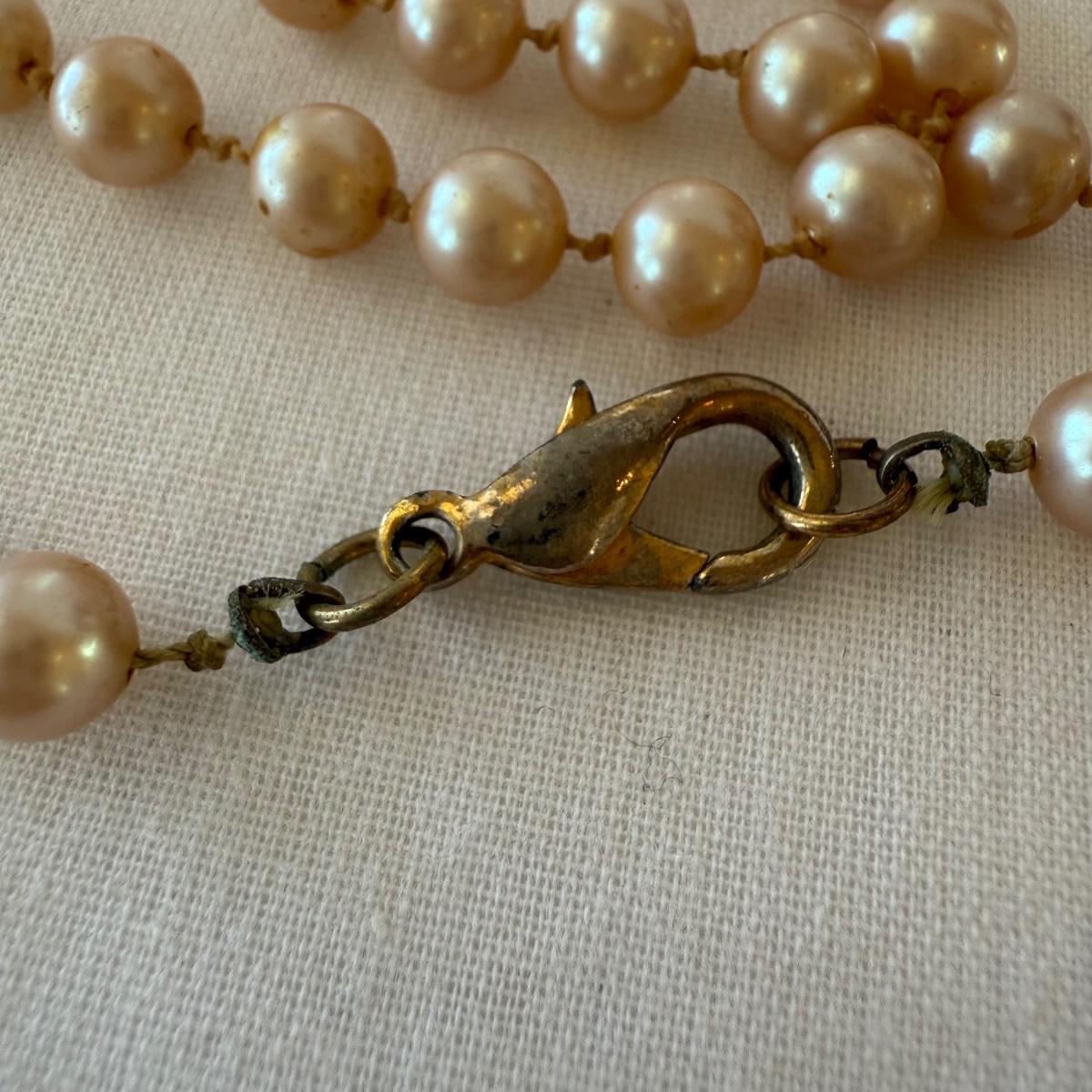 Five gorgeous pearl necklace strands. Each necklace is hand-knitted. One has a clasp stamped ‘Omar 10K’. One has a broken clasp. Three of the necklaces are white or off-white, and two have a light pink tone. We cannot verify the authenticity of the pearls. A lovely light blue satin pouch is included. The longest necklace, which has multiple sizes of beads, is approximately 52“.