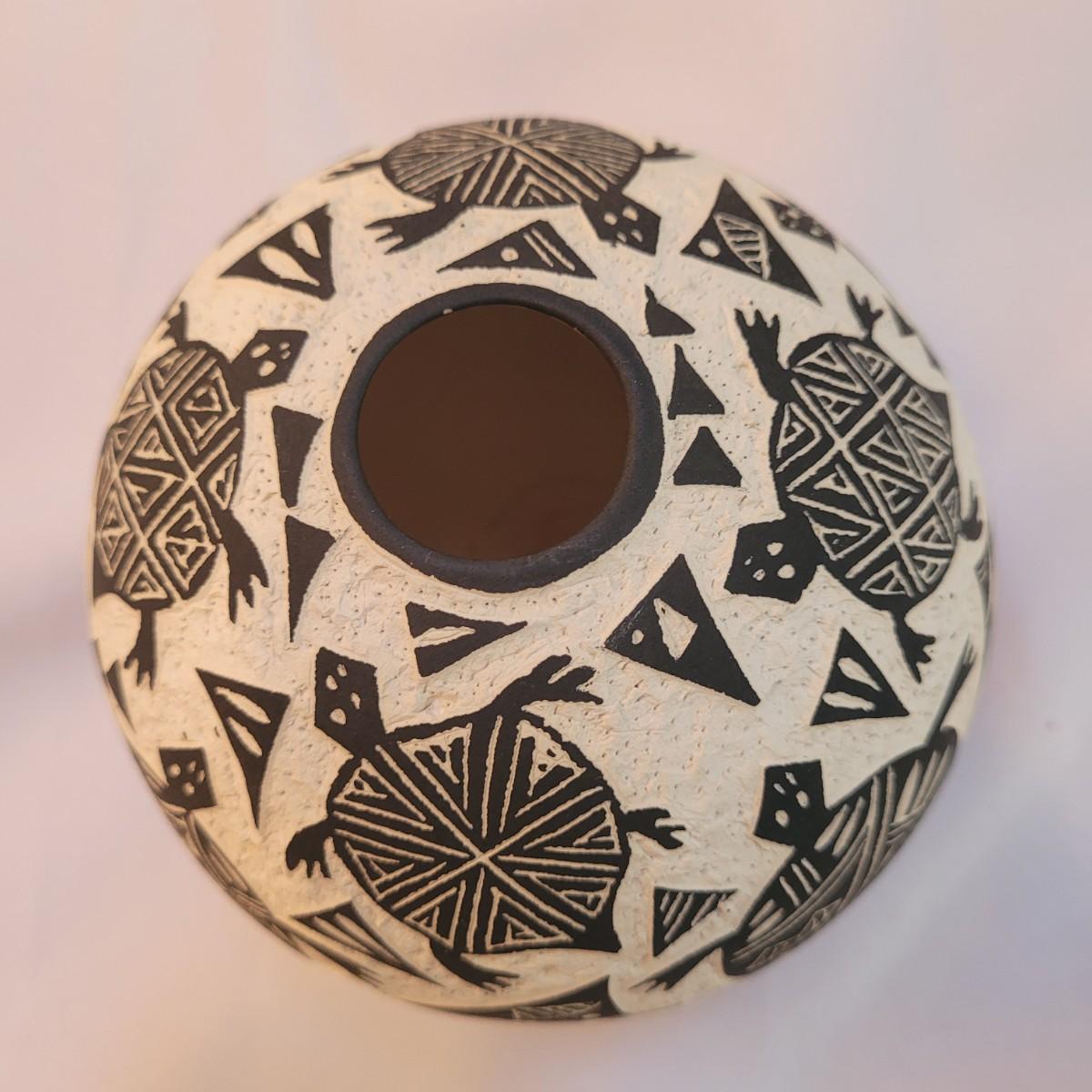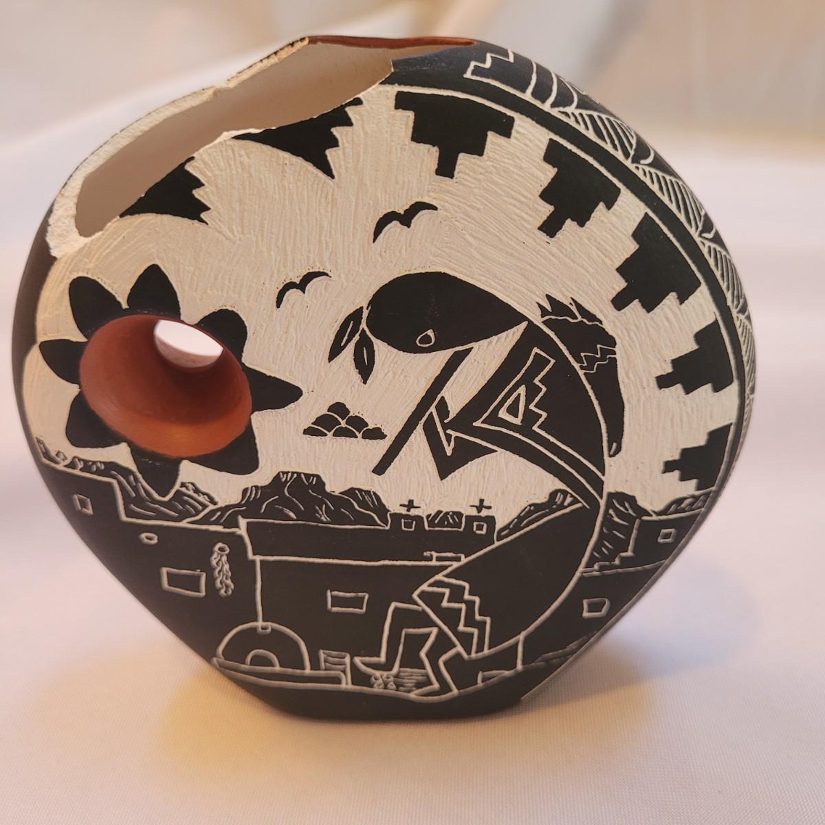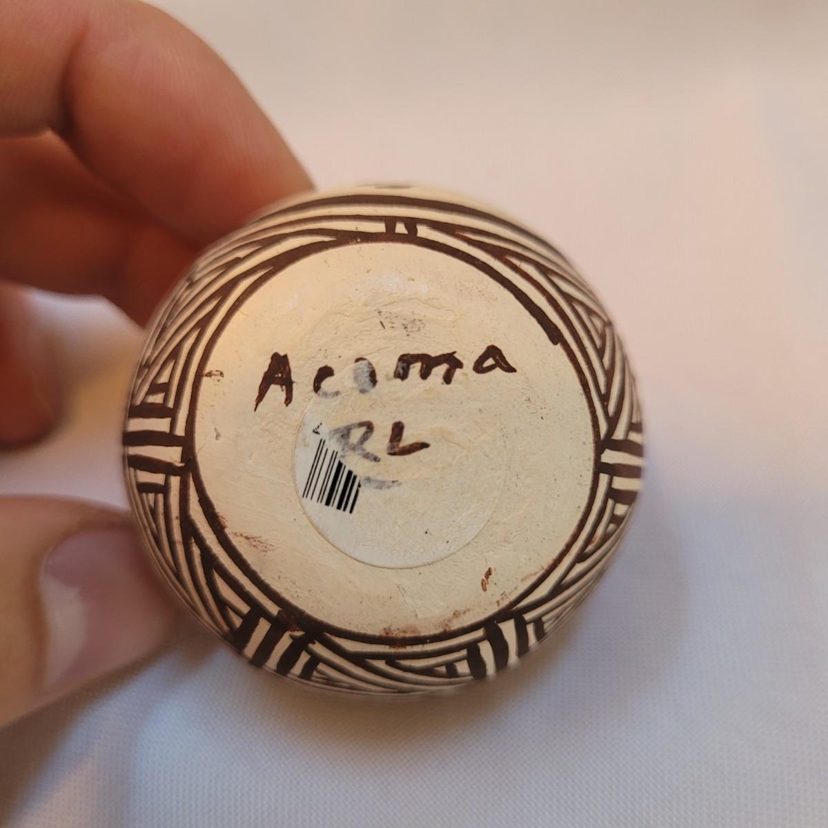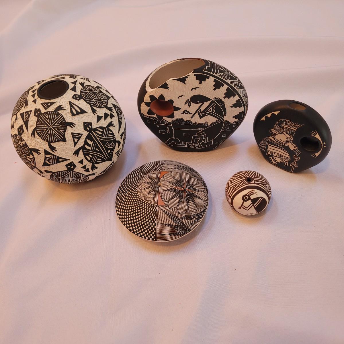 Five pieces that appear to be Acoma style pottery. Acoma art, particularly Acoma pottery, is renowned for its thin-walled, intricately designed pieces. Acoma Pueblo, located in New Mexico, is known for its centuries-old tradition of pottery. These pieces in particular depict various images including turtles, people, and houses. The largest piece measures 5"x 5" x 5"H. One of the pieces is broken on top, but appears to have the broken parts inside for potential repair. Each piece is signed on the bottom.