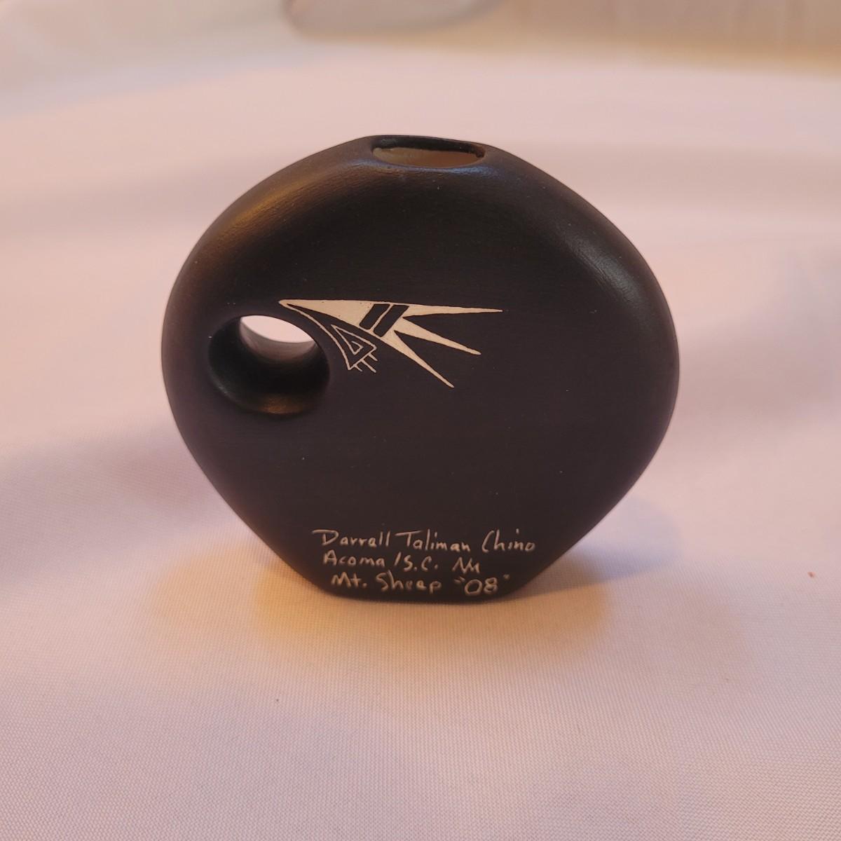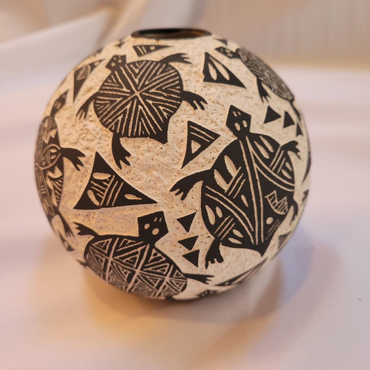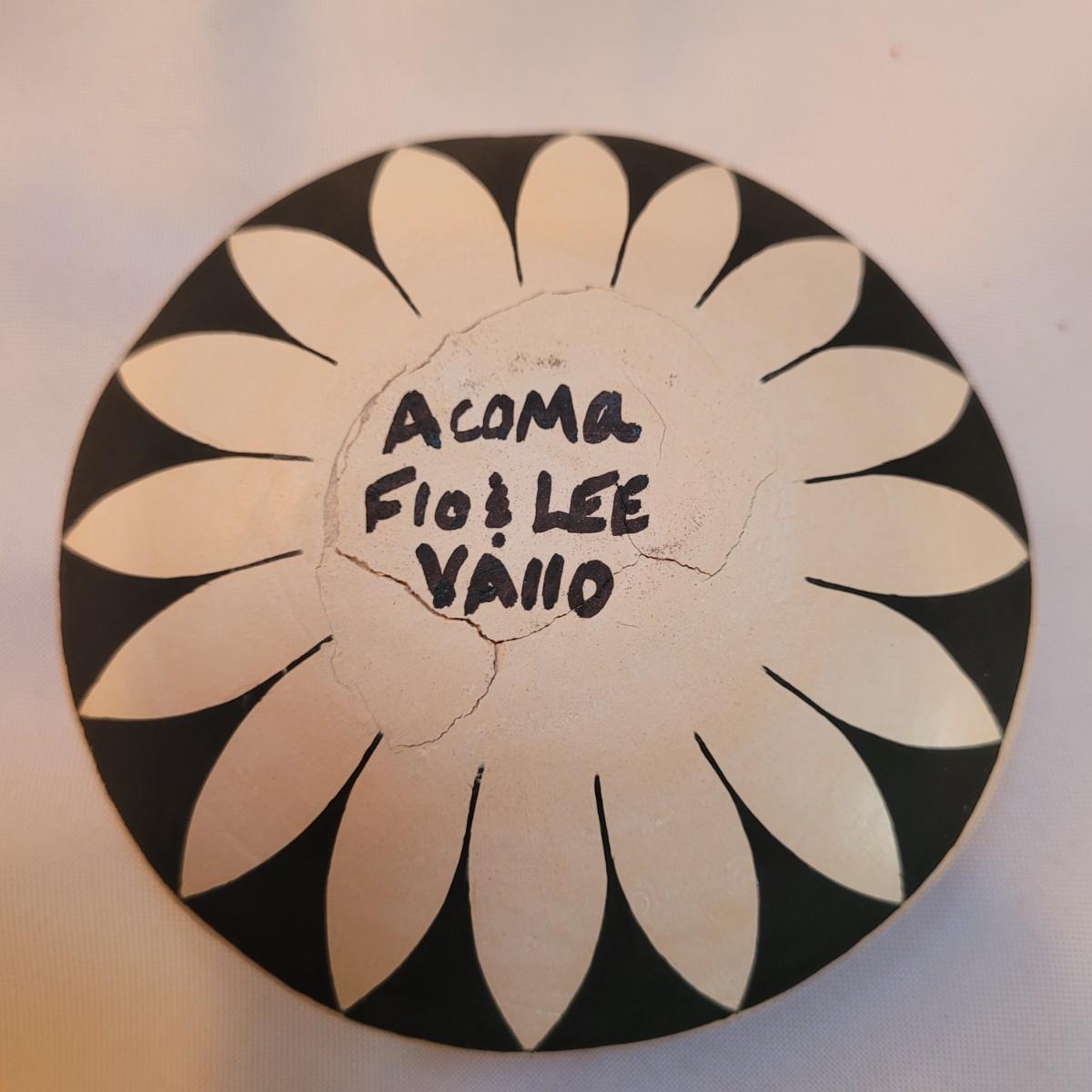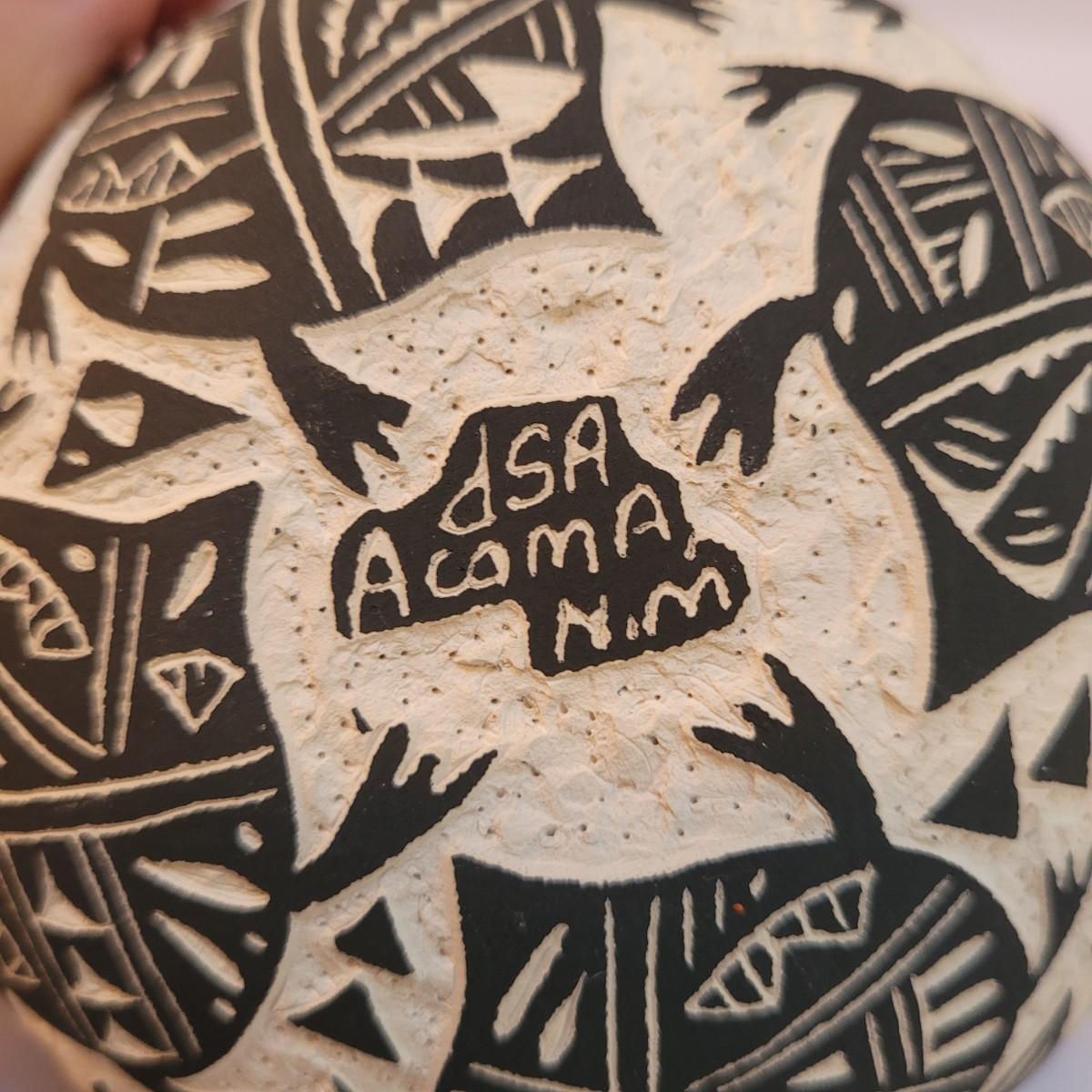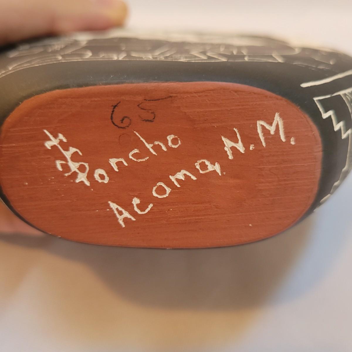 Five pieces that appear to be Acoma style pottery. Acoma art, particularly Acoma pottery, is renowned for its thin-walled, intricately designed pieces. Acoma Pueblo, located in New Mexico, is known for its centuries-old tradition of pottery. These pieces in particular depict various images including turtles, people, and houses. The largest piece measures 5"x 5" x 5"H. One of the pieces is broken on top, but appears to have the broken parts inside for potential repair. Each piece is signed on the bottom.