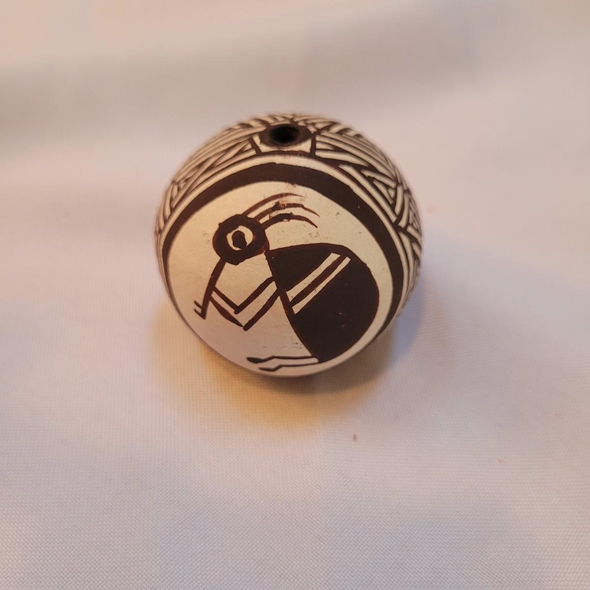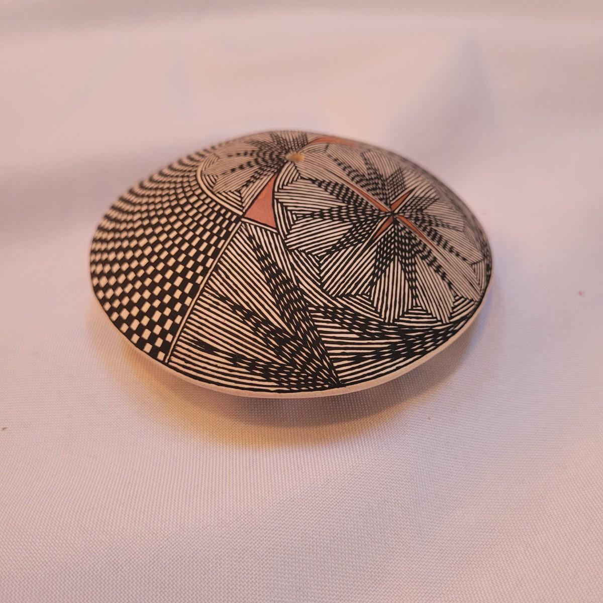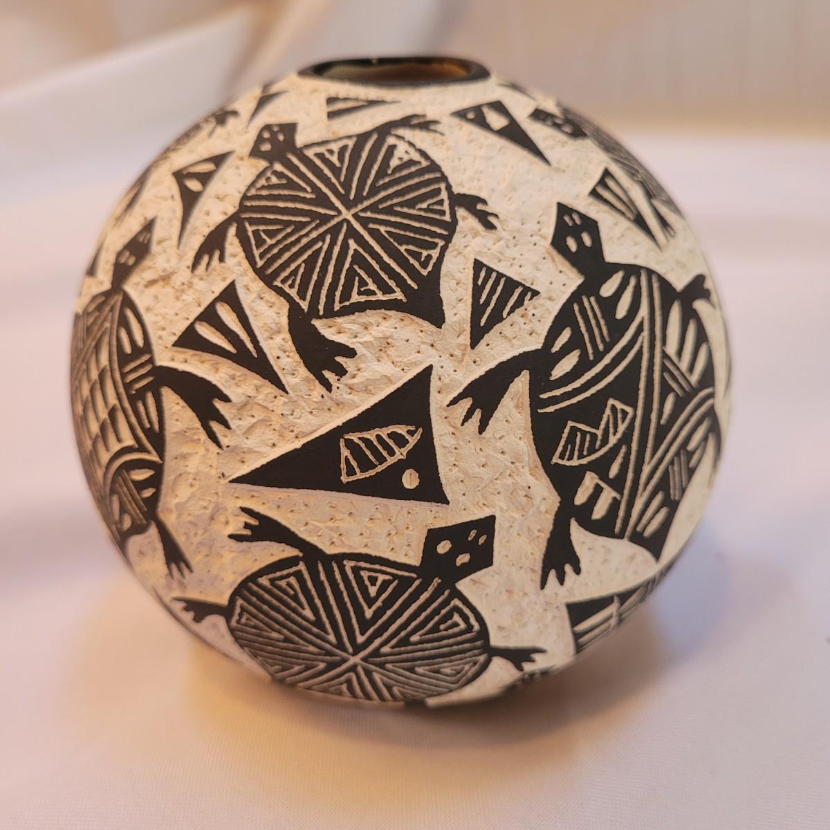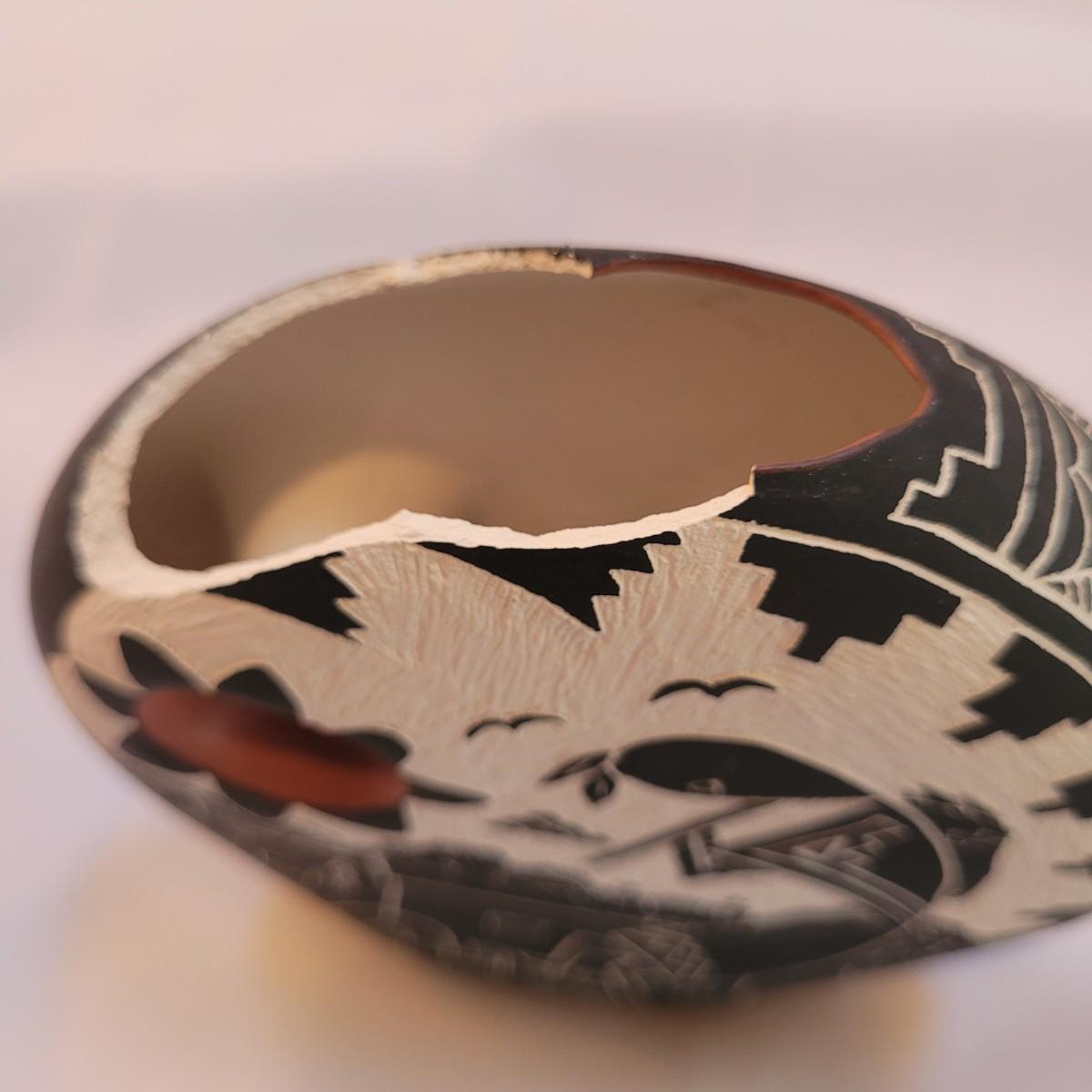 Five pieces that appear to be Acoma style pottery. Acoma art, particularly Acoma pottery, is renowned for its thin-walled, intricately designed pieces. Acoma Pueblo, located in New Mexico, is known for its centuries-old tradition of pottery. These pieces in particular depict various images including turtles, people, and houses. The largest piece measures 5"x 5" x 5"H. One of the pieces is broken on top, but appears to have the broken parts inside for potential repair. Each piece is signed on the bottom.