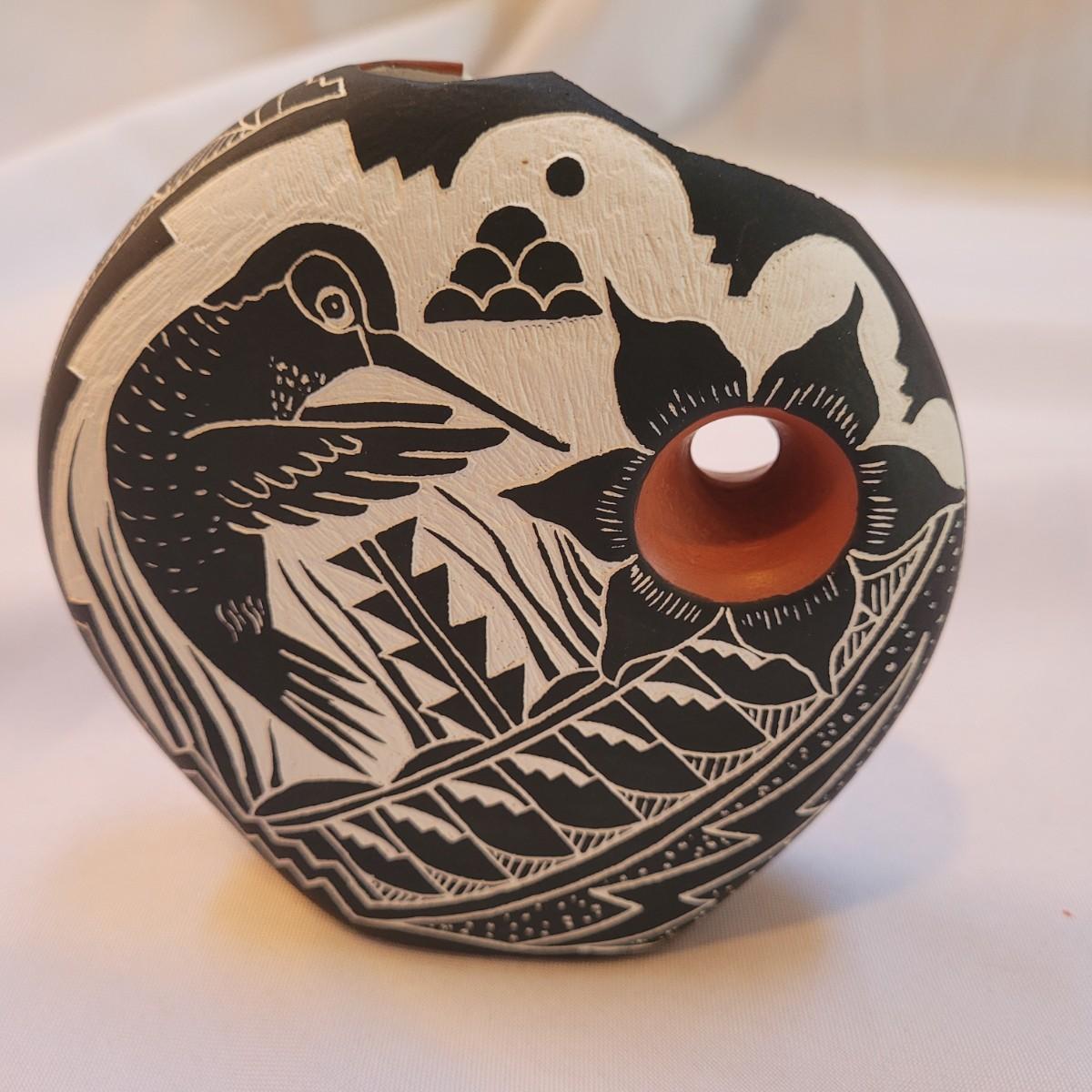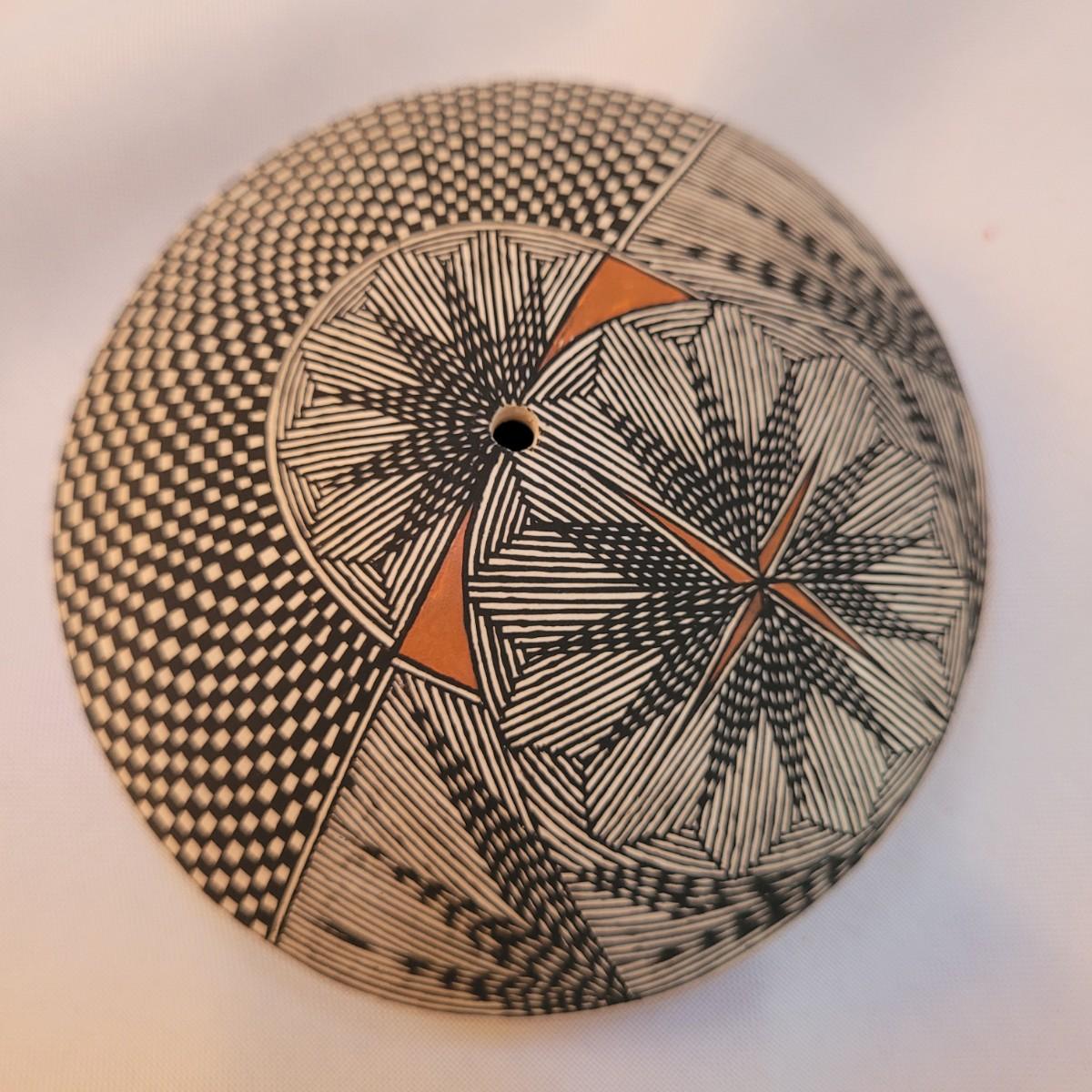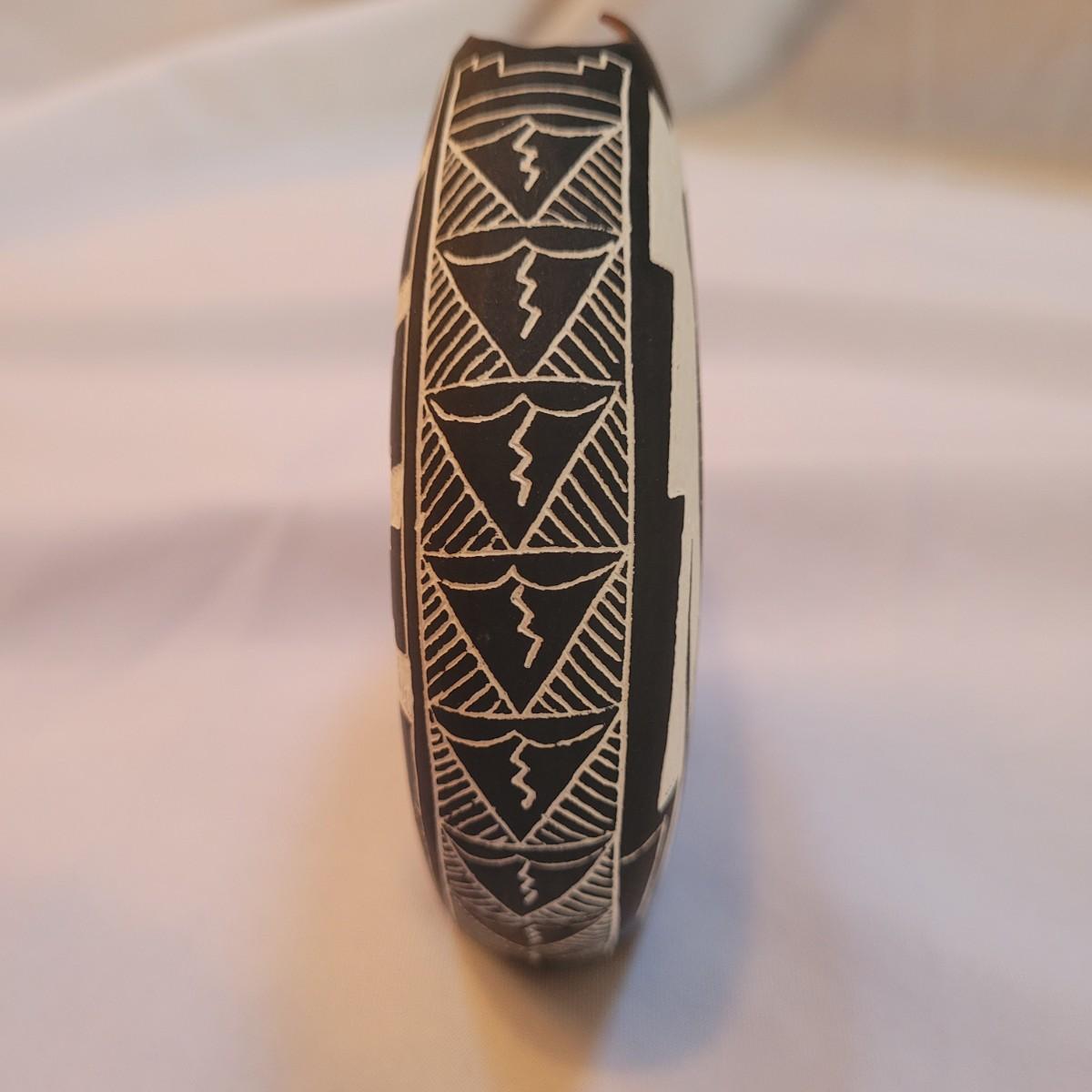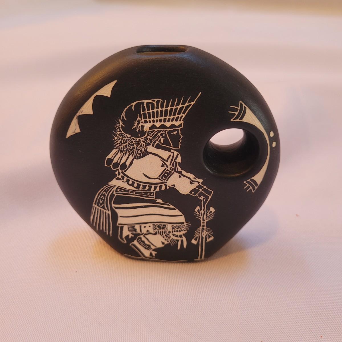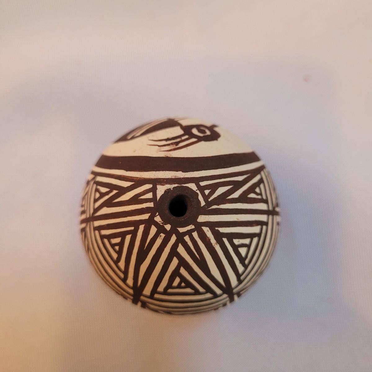 Five pieces that appear to be Acoma style pottery. Acoma art, particularly Acoma pottery, is renowned for its thin-walled, intricately designed pieces. Acoma Pueblo, located in New Mexico, is known for its centuries-old tradition of pottery. These pieces in particular depict various images including turtles, people, and houses. The largest piece measures 5"x 5" x 5"H. One of the pieces is broken on top, but appears to have the broken parts inside for potential repair. Each piece is signed on the bottom.