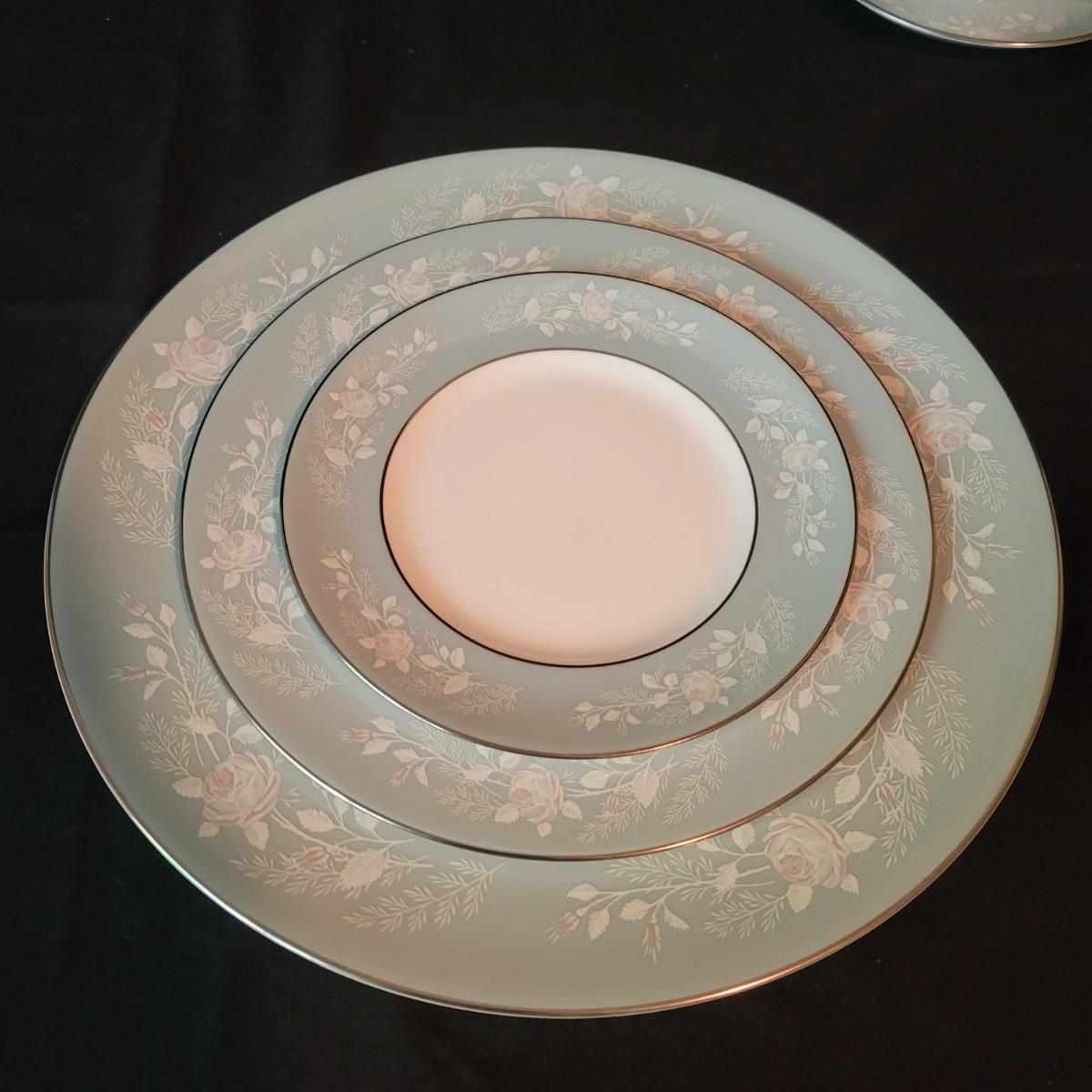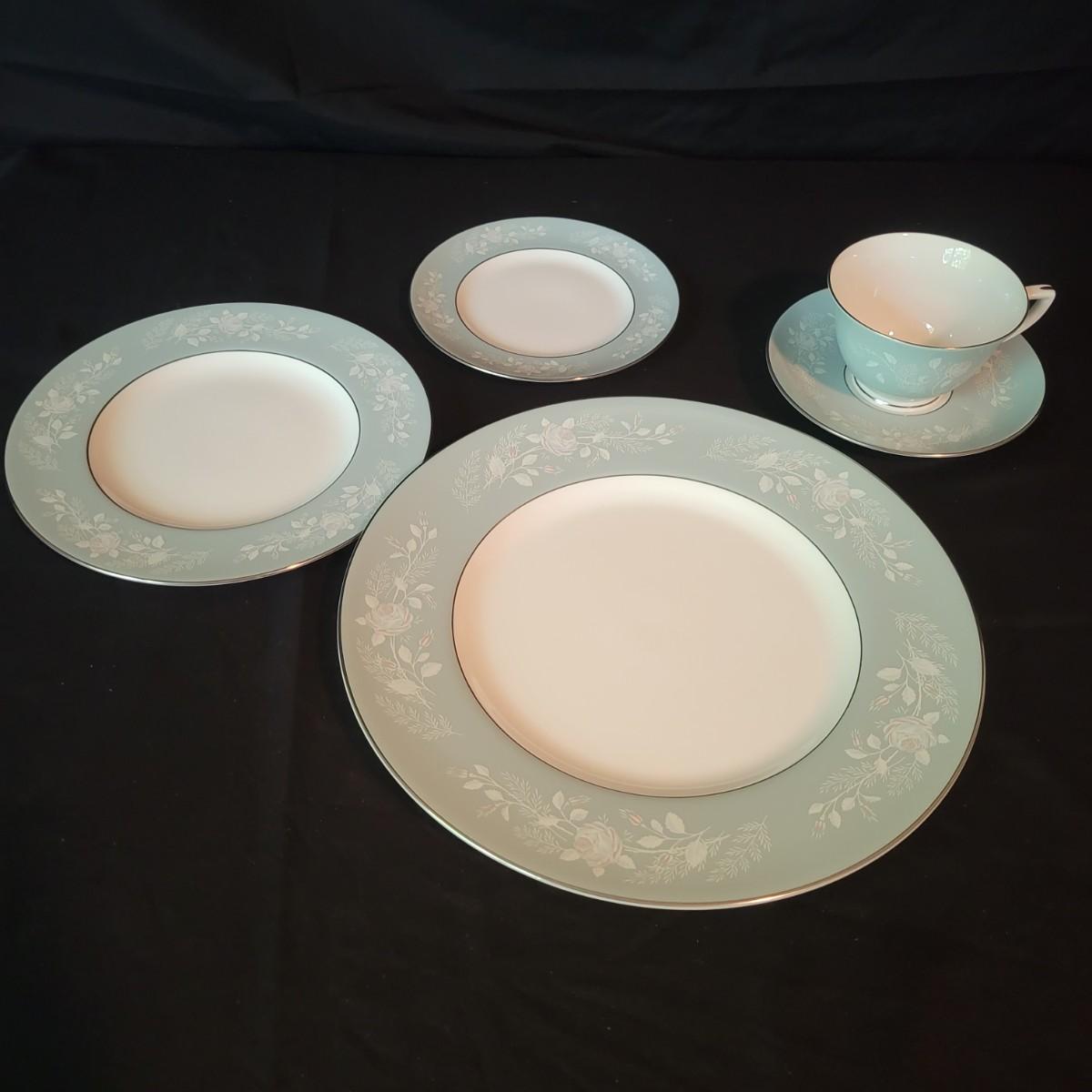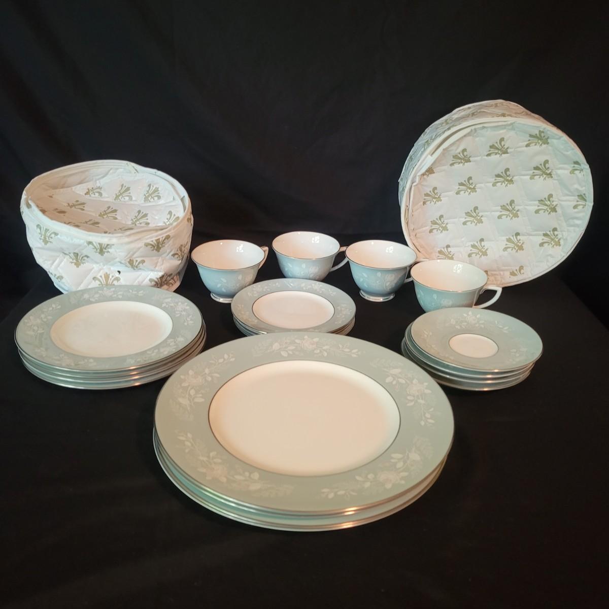 A bone china set manufactured by Royal Worcester. This set has four place settings with five pieces each with a light blue background, white and pink roses with silver edging. The dinner plates measure approximately 10.75" D. This lot also includes two china storage bags. Shipping available. Shipping can be costly. We suggest contacting our preferred local shipping provider, Postage Express, with dimensions and getting an estimate before bidding: (828) 670-5501 or postageexpress@yahoo.com.