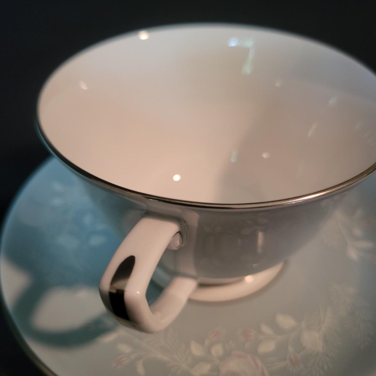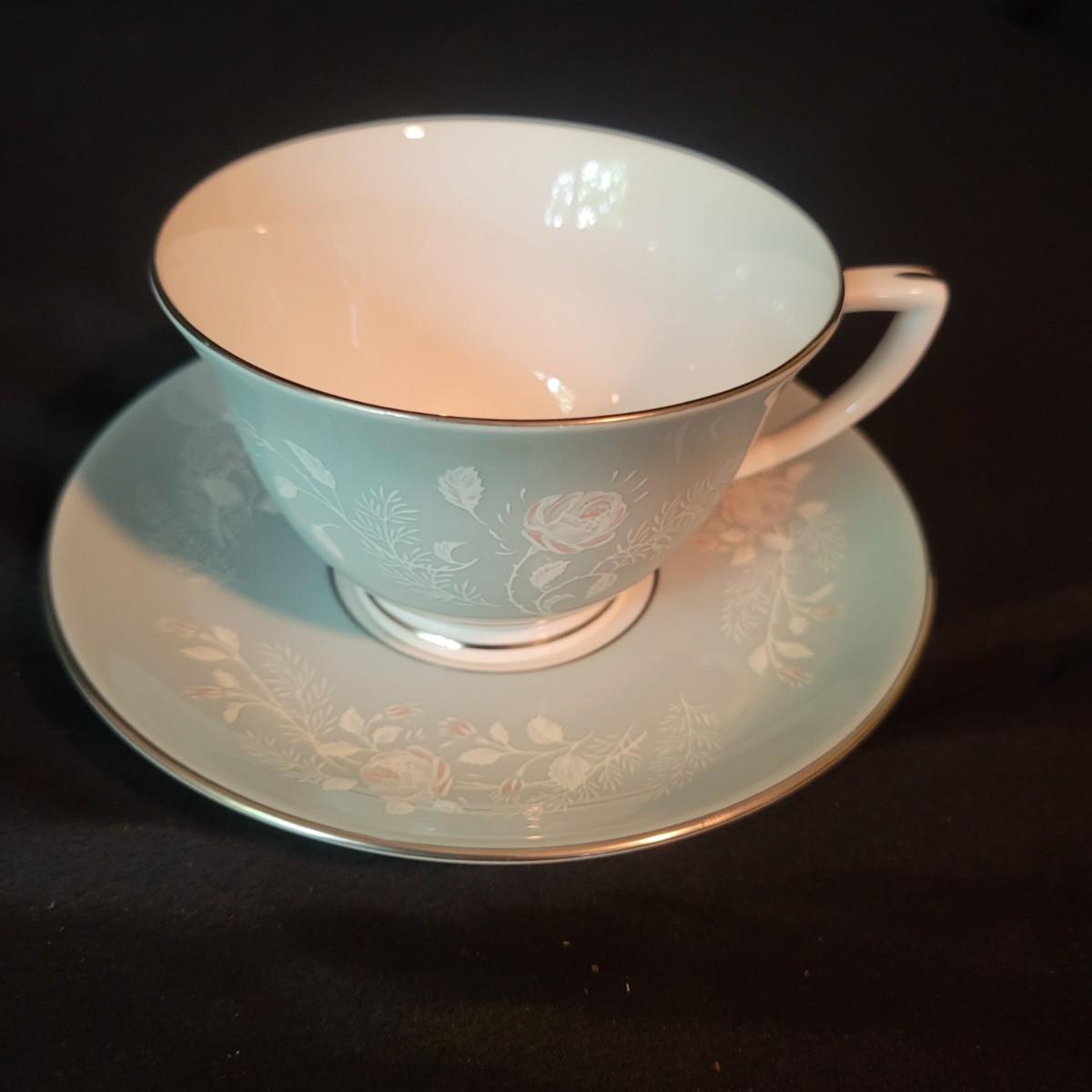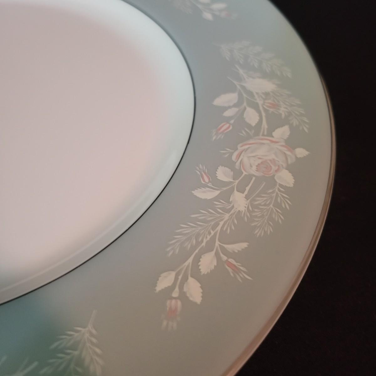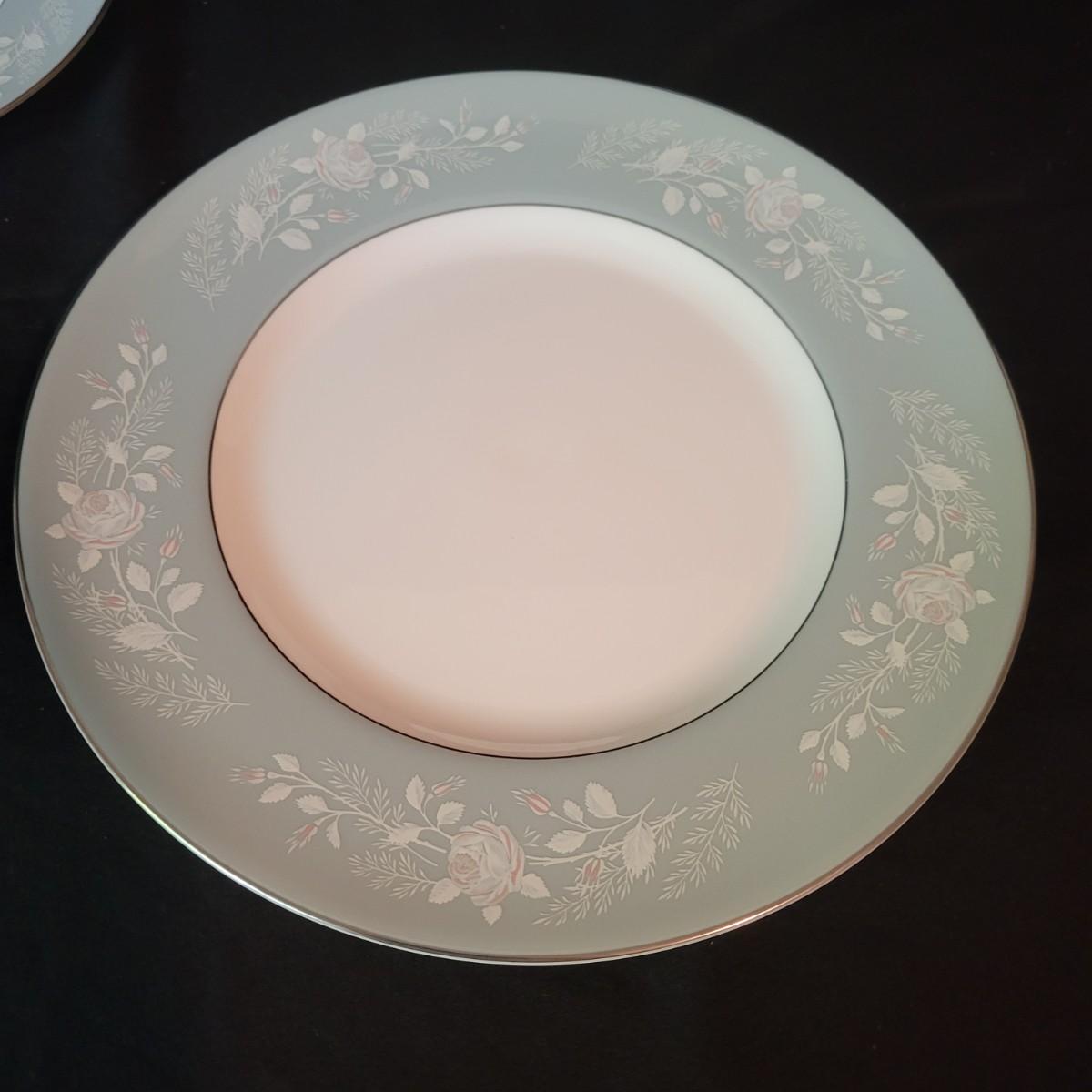 A bone china set manufactured by Royal Worcester. This set has four place settings with five pieces each with a light blue background, white and pink roses with silver edging. The dinner plates measure approximately 10.75" D. This lot also includes two china storage bags. Shipping available. Shipping can be costly. We suggest contacting our preferred local shipping provider, Postage Express, with dimensions and getting an estimate before bidding: (828) 670-5501 or postageexpress@yahoo.com.