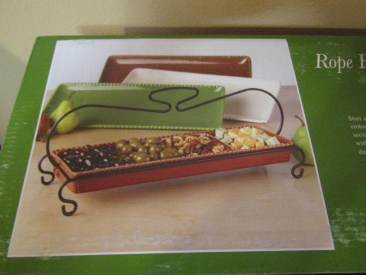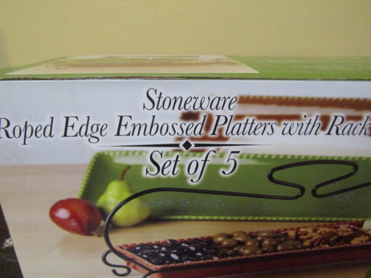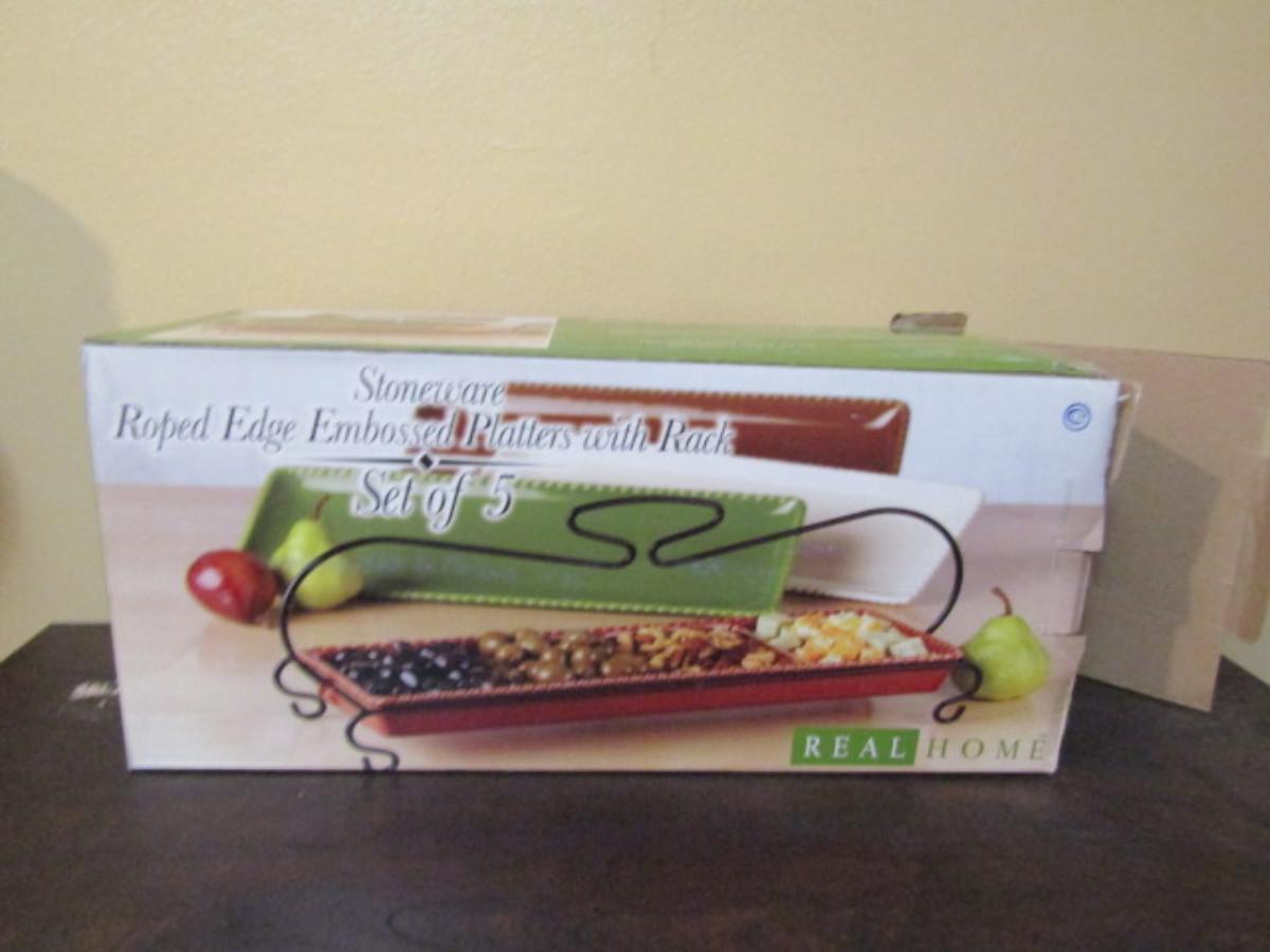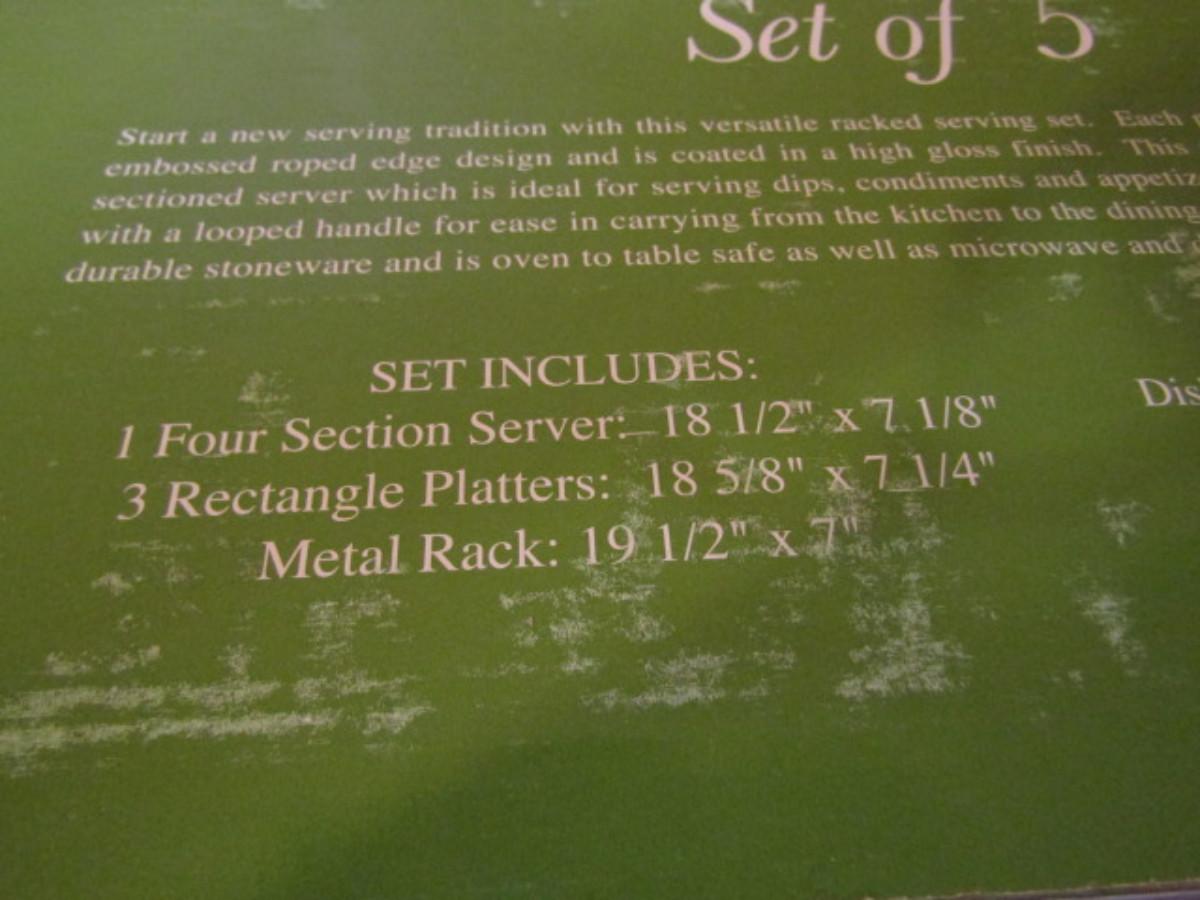 Five Piece Serving Set. Three platters, one divided dish, and metal rack.