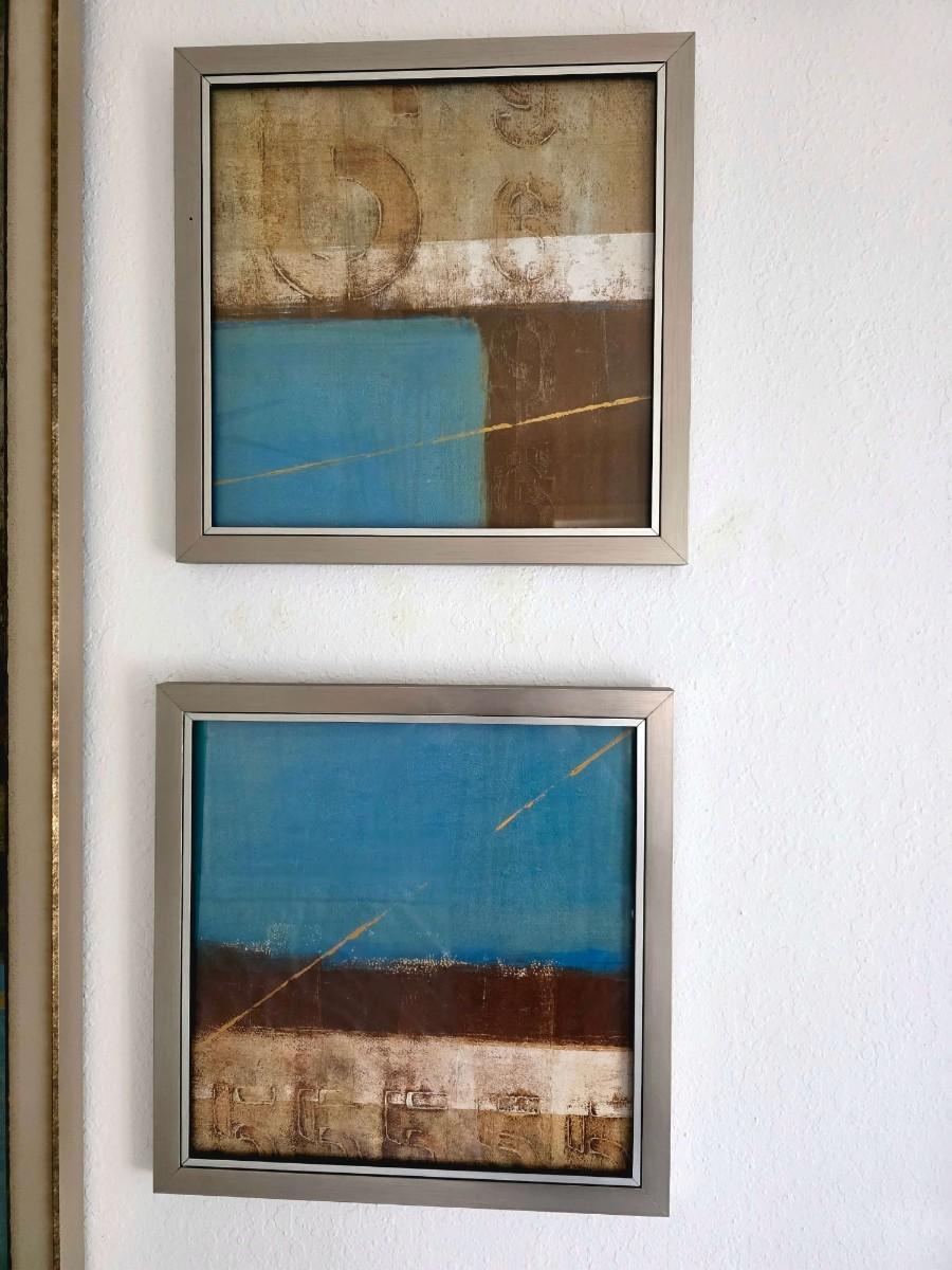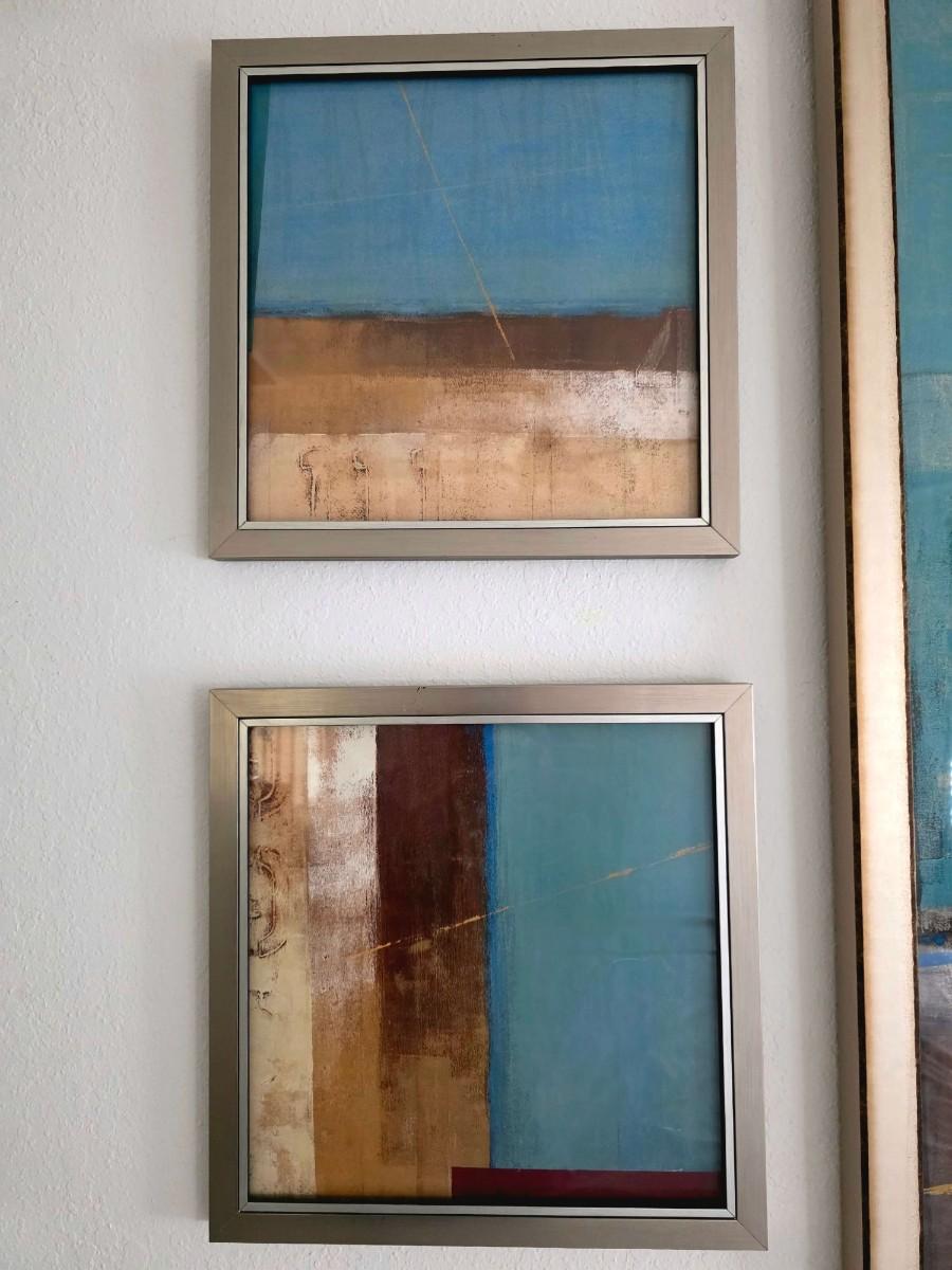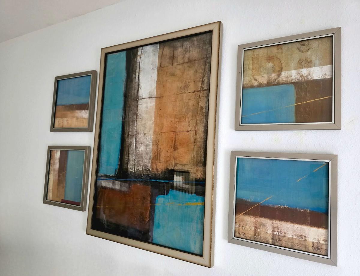 Five Piece Set Contemporary Abstract Wall Art in pleasant hues of blue, brown, gold, and cream. Unsigned decorative art. The large center piece measures 38"H x 26"W. The four smaller pieces measure 13.5"H x 13.5"W. You are bidding on the set of five.