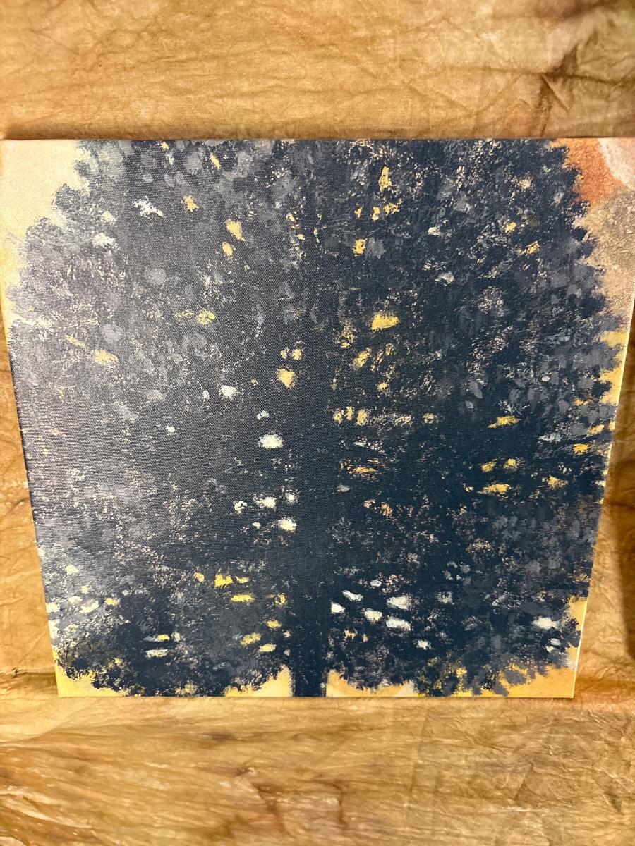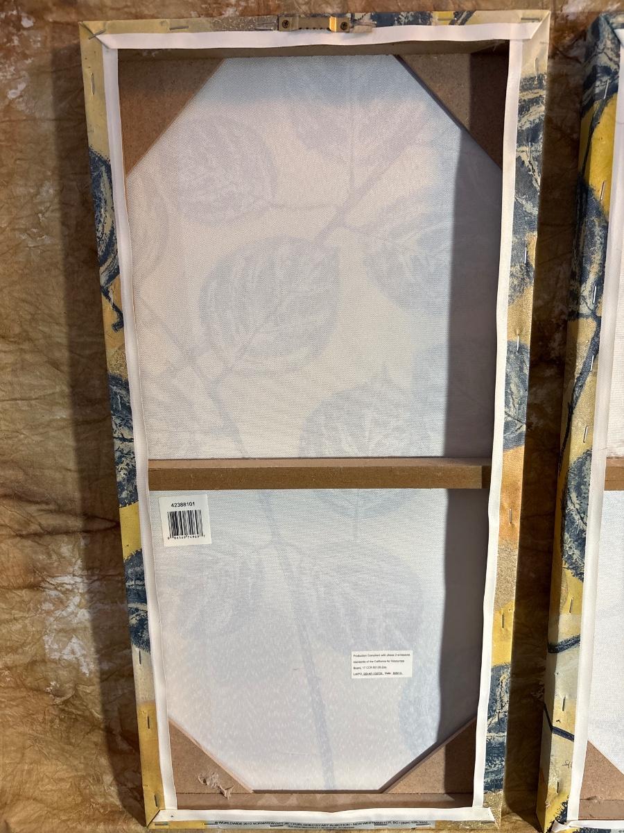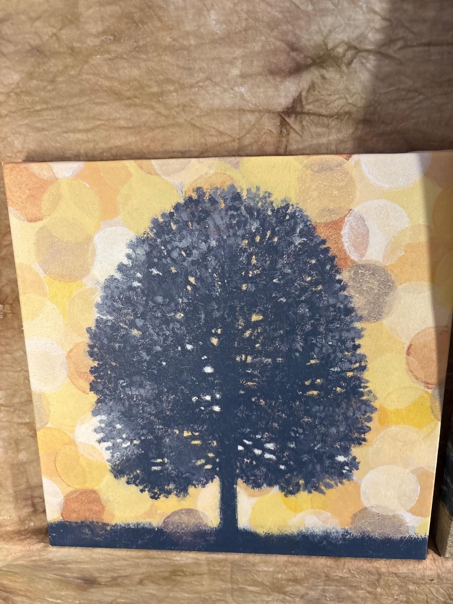 Background of yellow with tree theme on this five piece set of canvas art. Small pieces are 11.75 square., Larger 11.5” x 24”