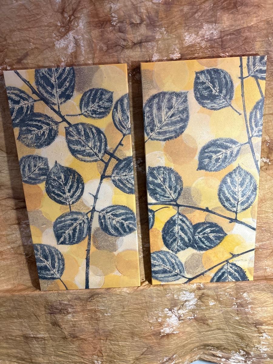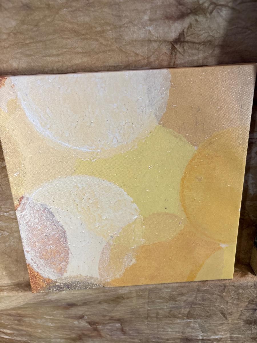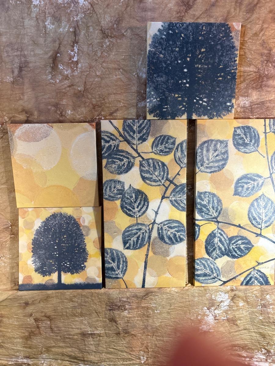 Background of yellow with tree theme on this five piece set of canvas art. Small pieces are 11.75 square., Larger 11.5” x 24”