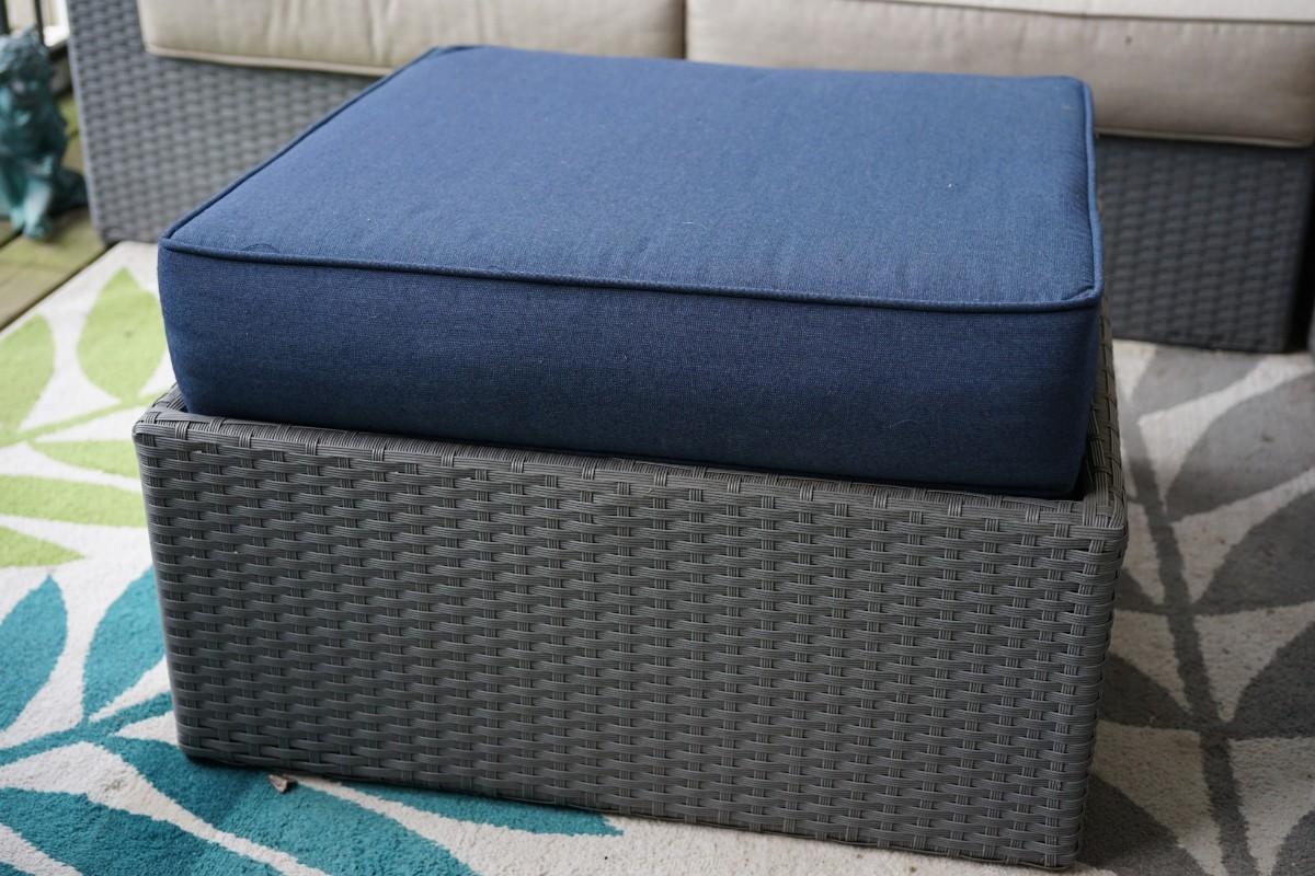 the wide it 28", the ottoman is 27" square with a dark blue cushion