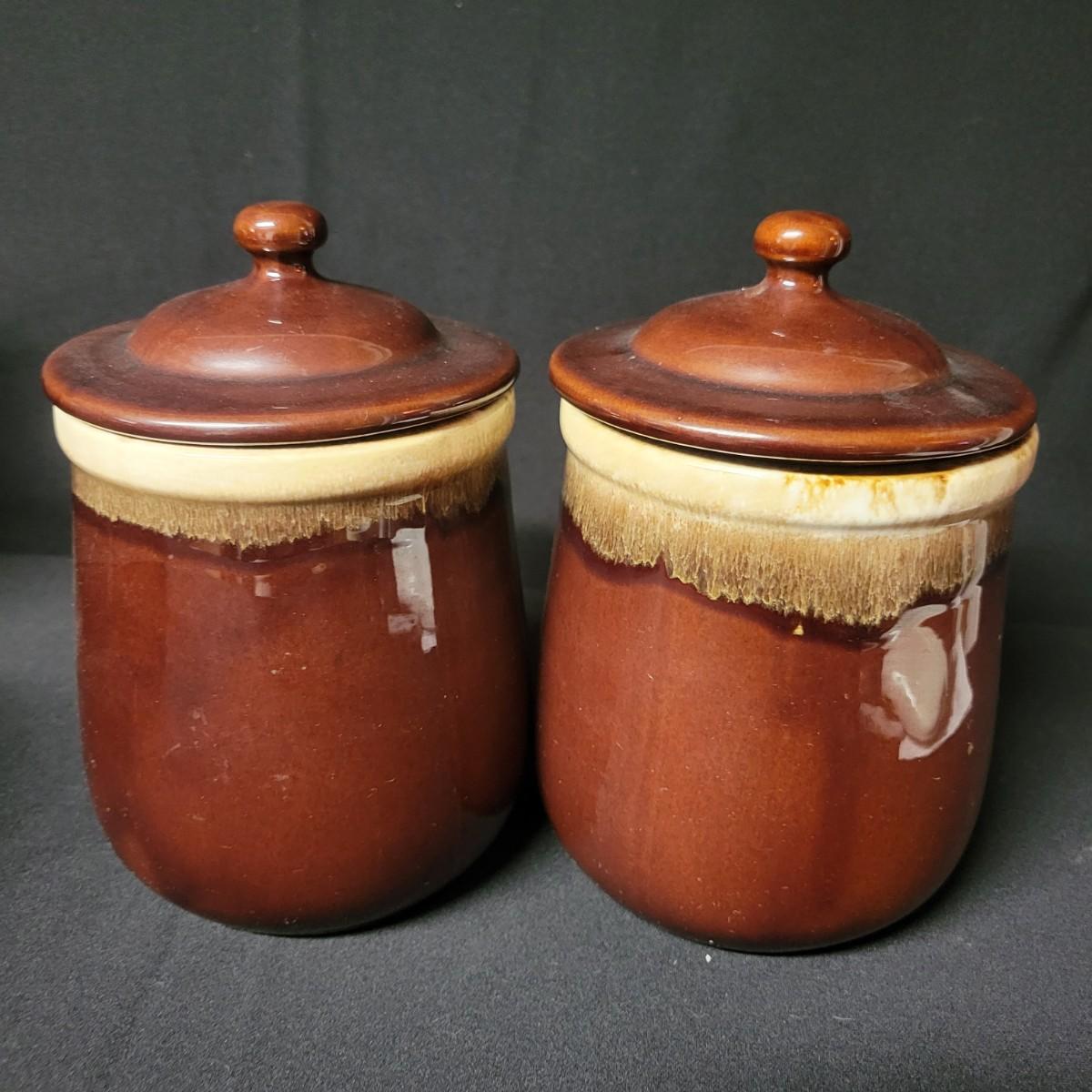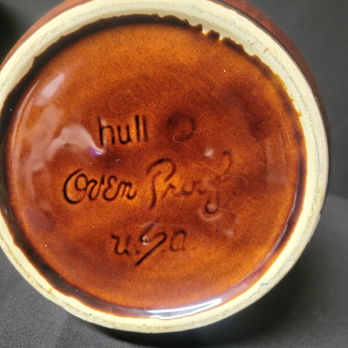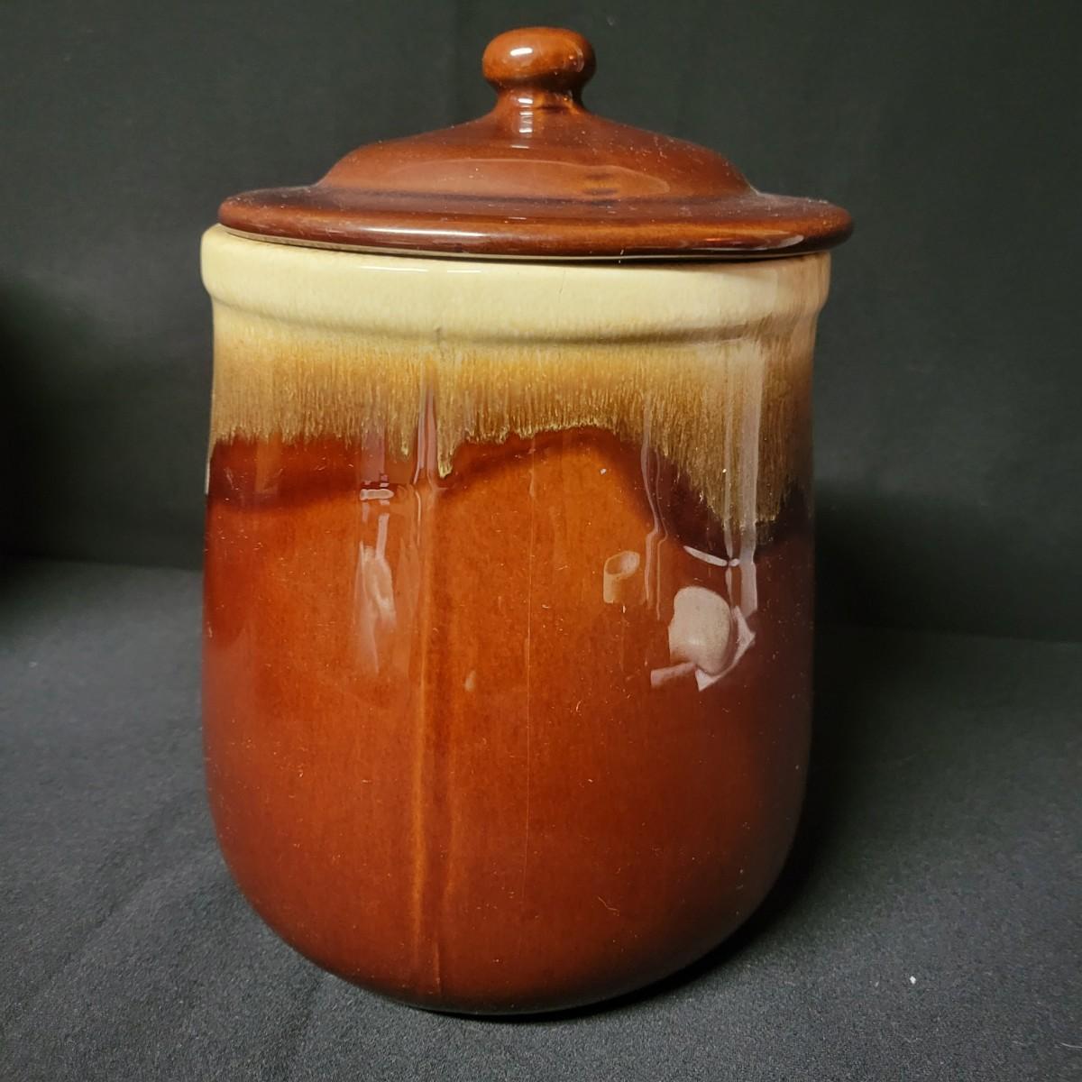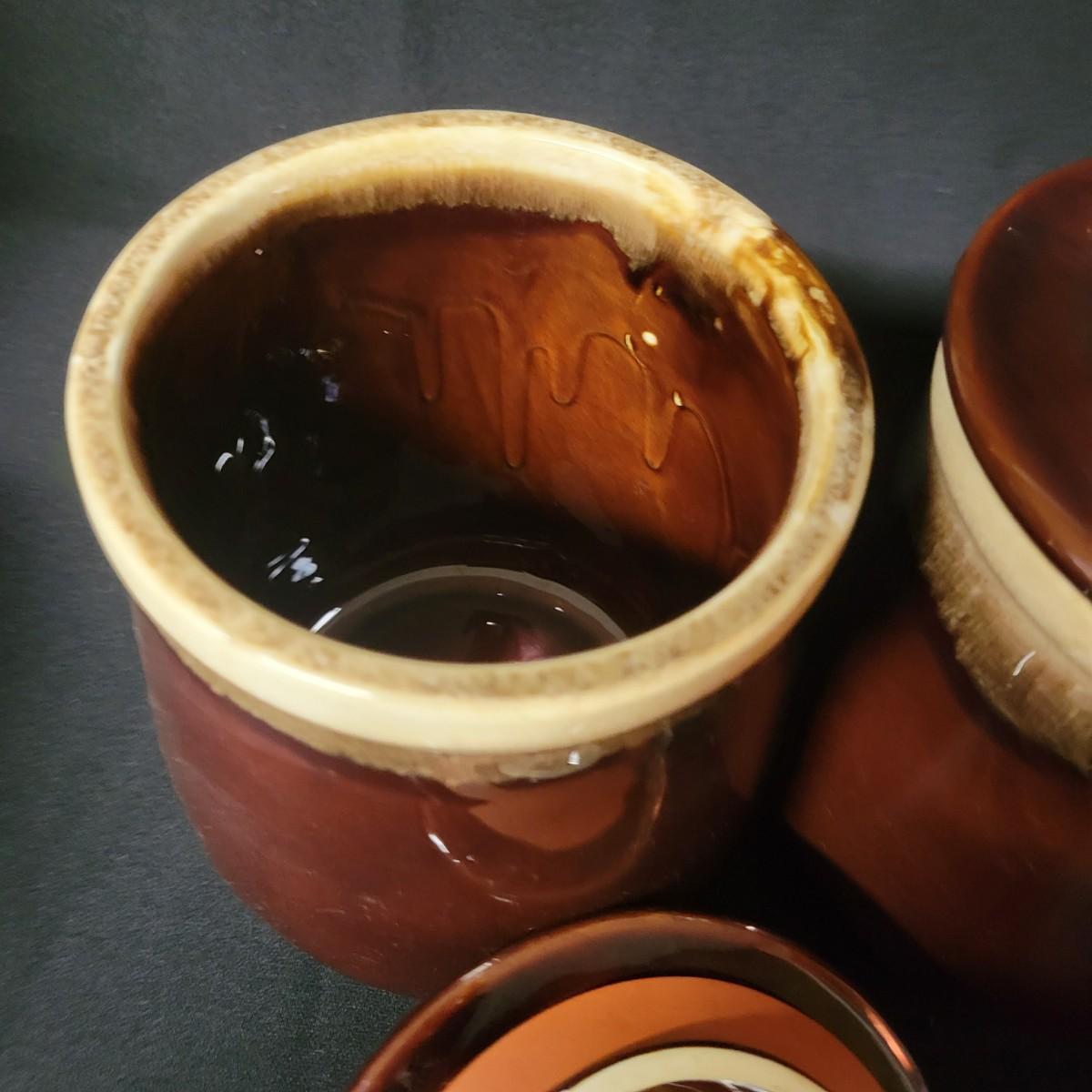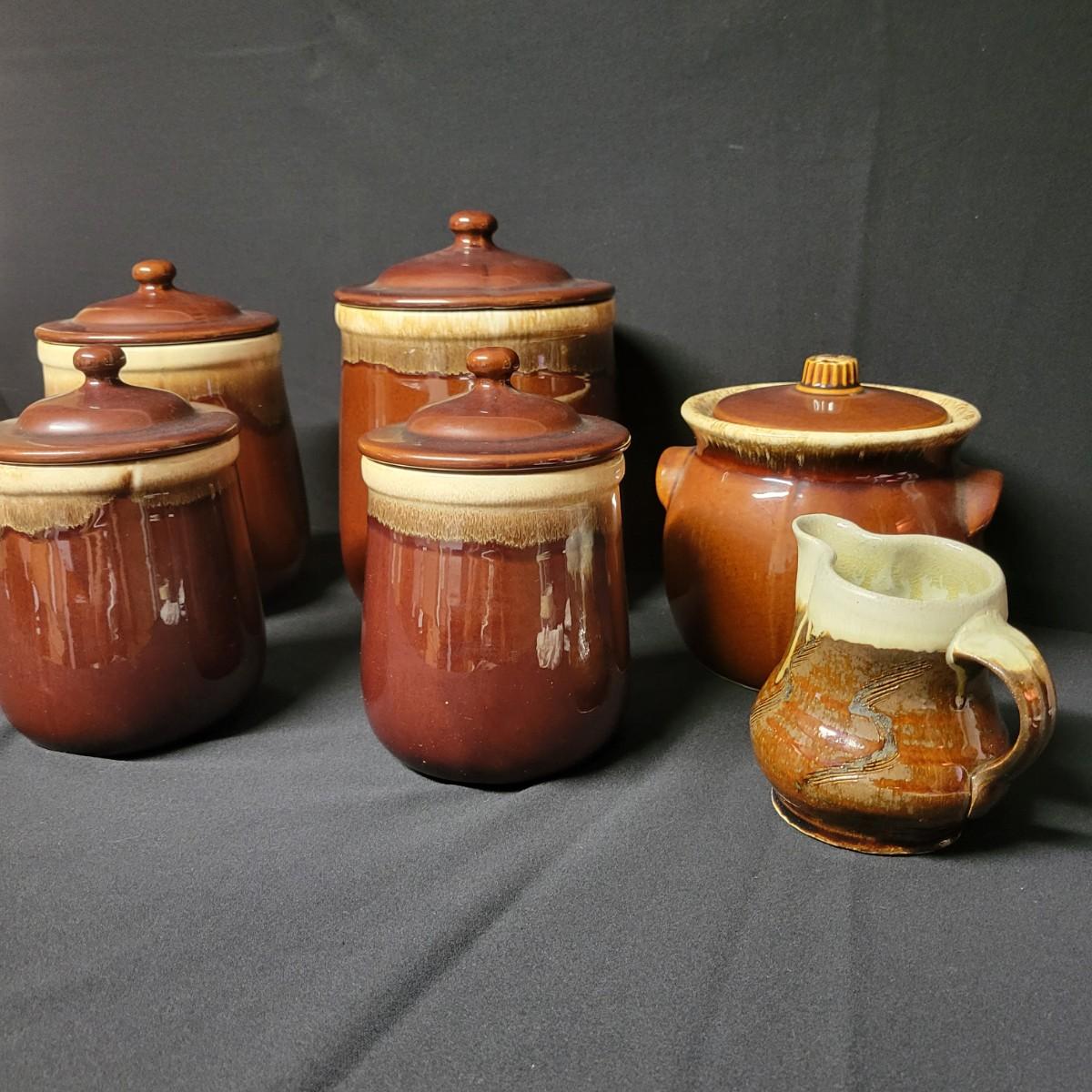 A matching set of 4 McCoy pottery lidded canisters is accompanied by a similar smaller Hull canister and an unmarked small creamer. Some lids have rubber seals and are in good condition. Largest crock measures approximately 7" x 10" Shipping available. Shipping can be costly please call UPS store at 828-252-6930 for quote