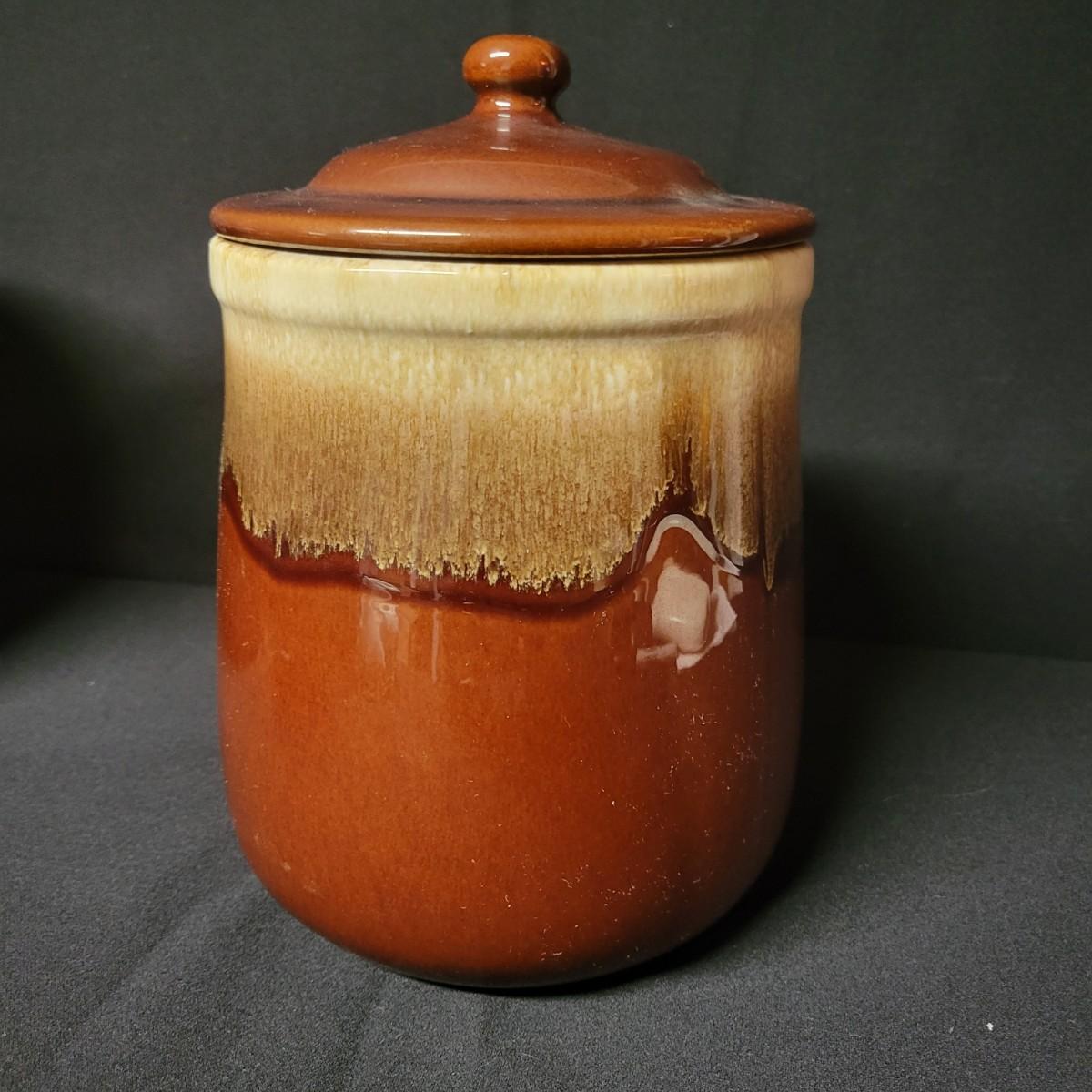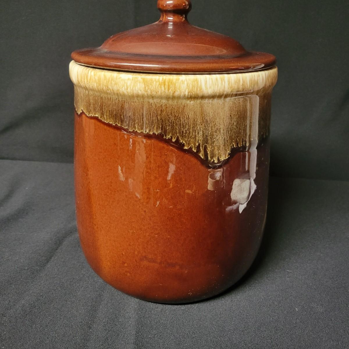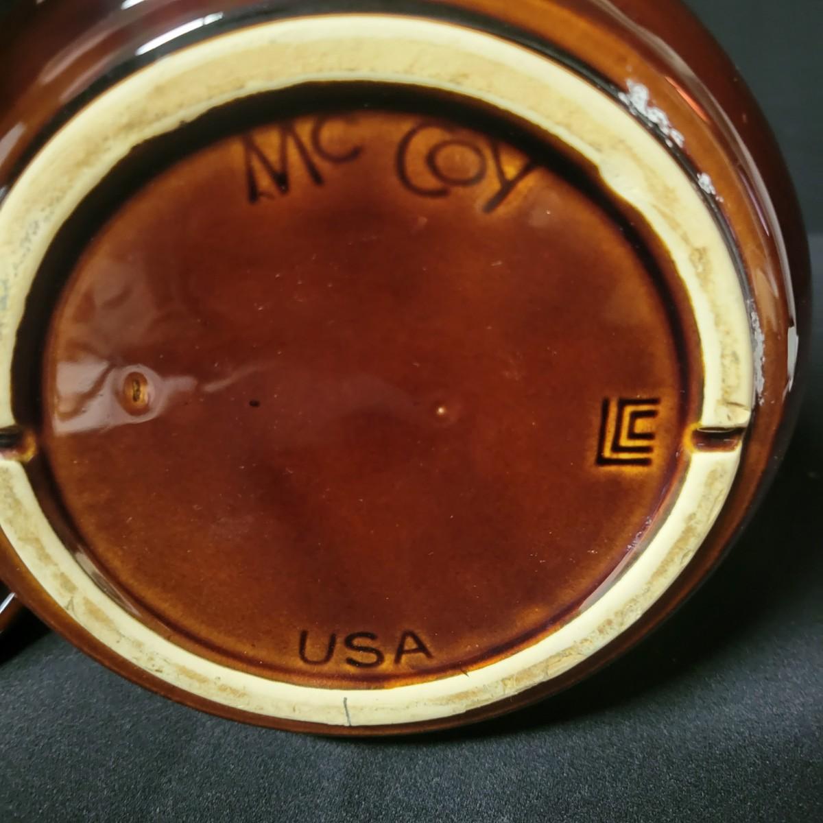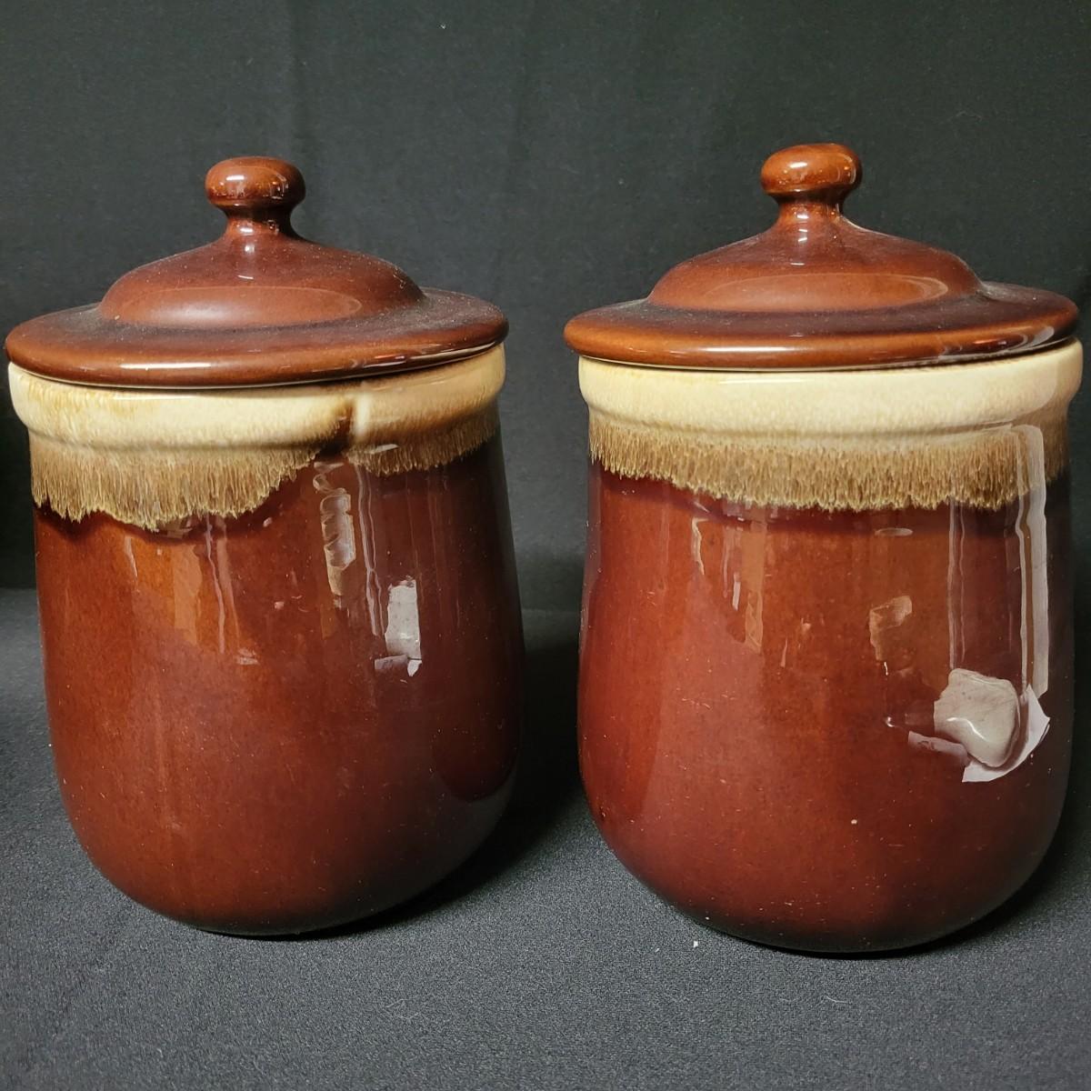 A matching set of 4 McCoy pottery lidded canisters is accompanied by a similar smaller Hull canister and an unmarked small creamer. Some lids have rubber seals and are in good condition. Largest crock measures approximately 7" x 10" Shipping available. Shipping can be costly please call UPS store at 828-252-6930 for quote