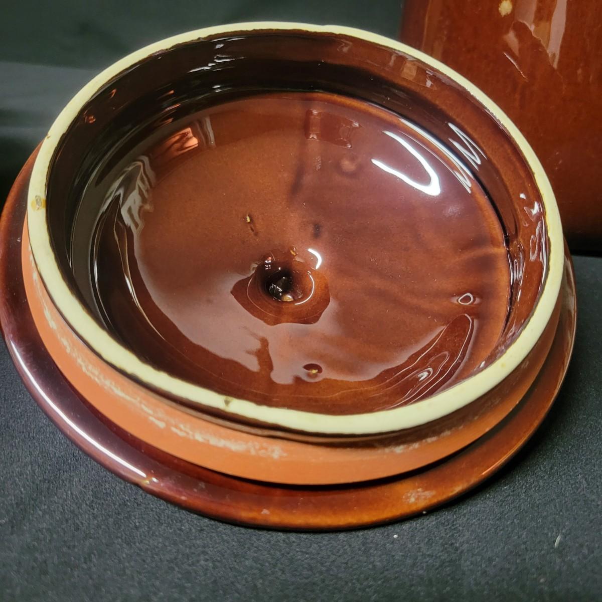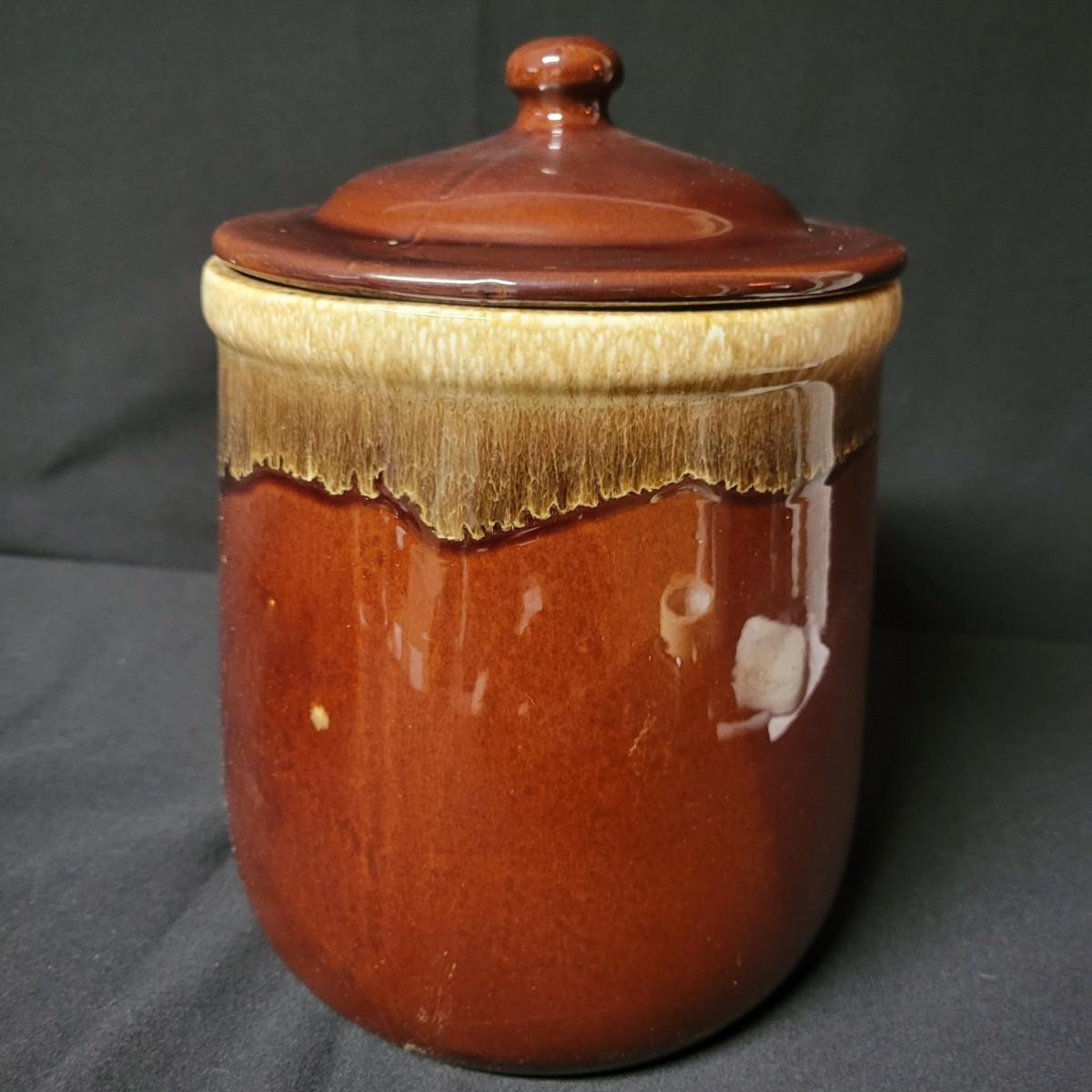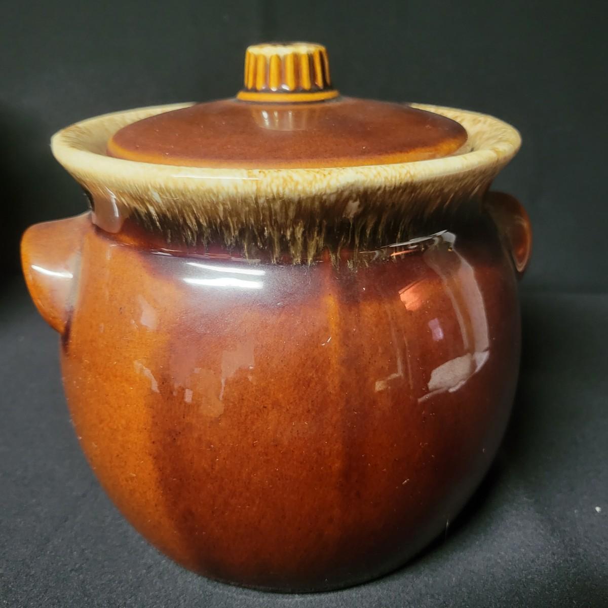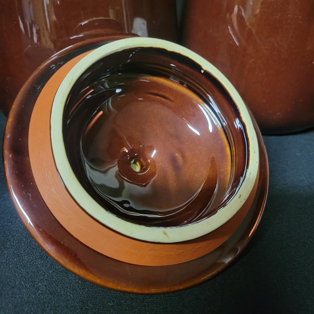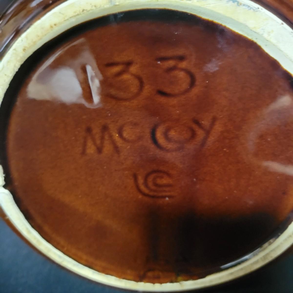 A matching set of 4 McCoy pottery lidded canisters is accompanied by a similar smaller Hull canister and an unmarked small creamer. Some lids have rubber seals and are in good condition. Largest crock measures approximately 7" x 10" Shipping available. Shipping can be costly please call UPS store at 828-252-6930 for quote