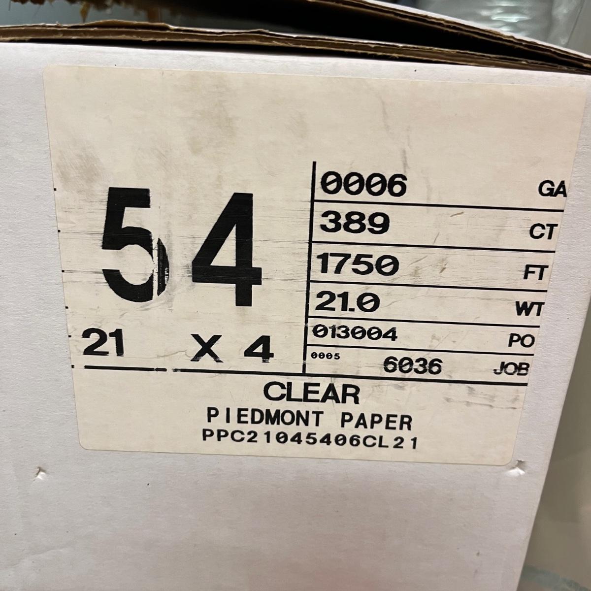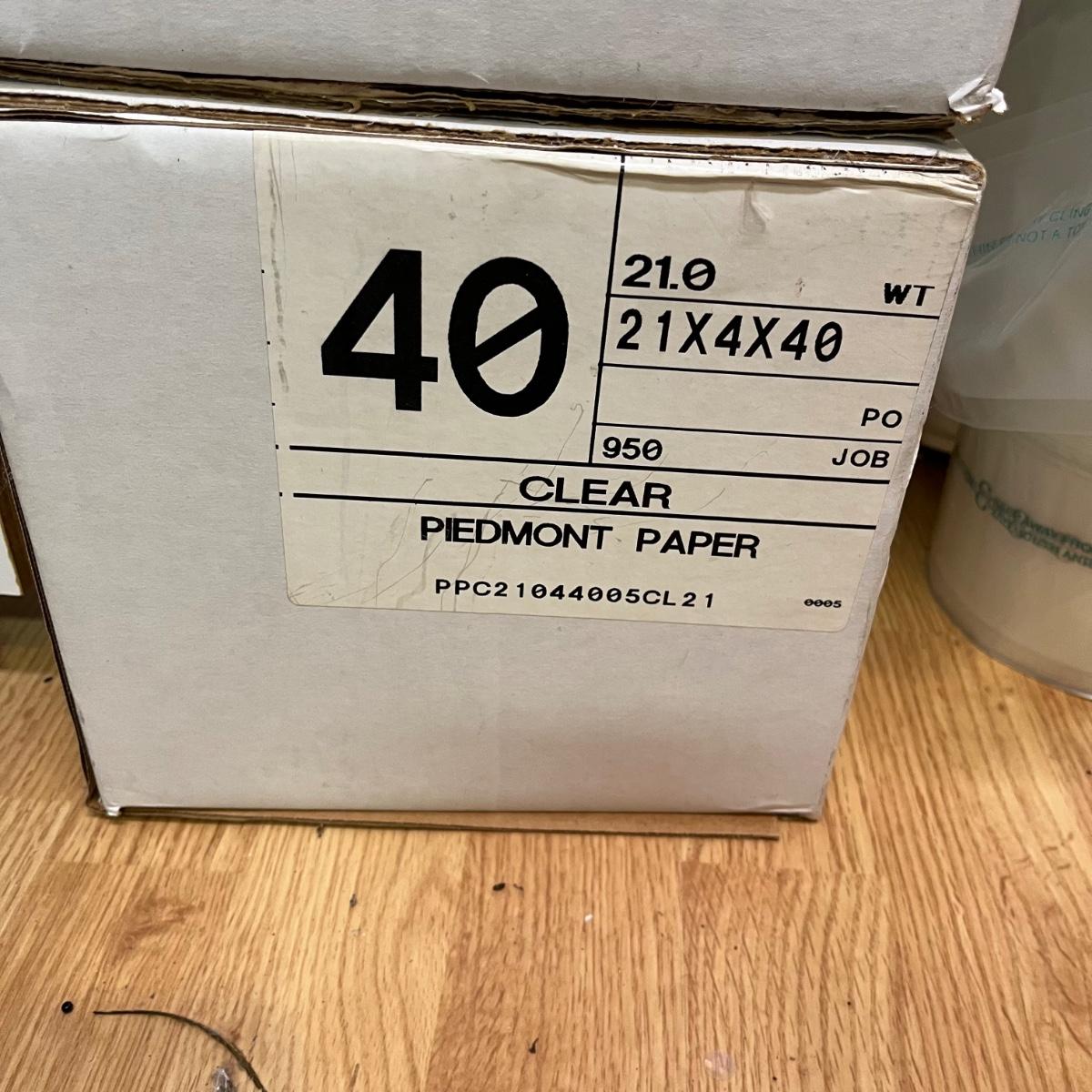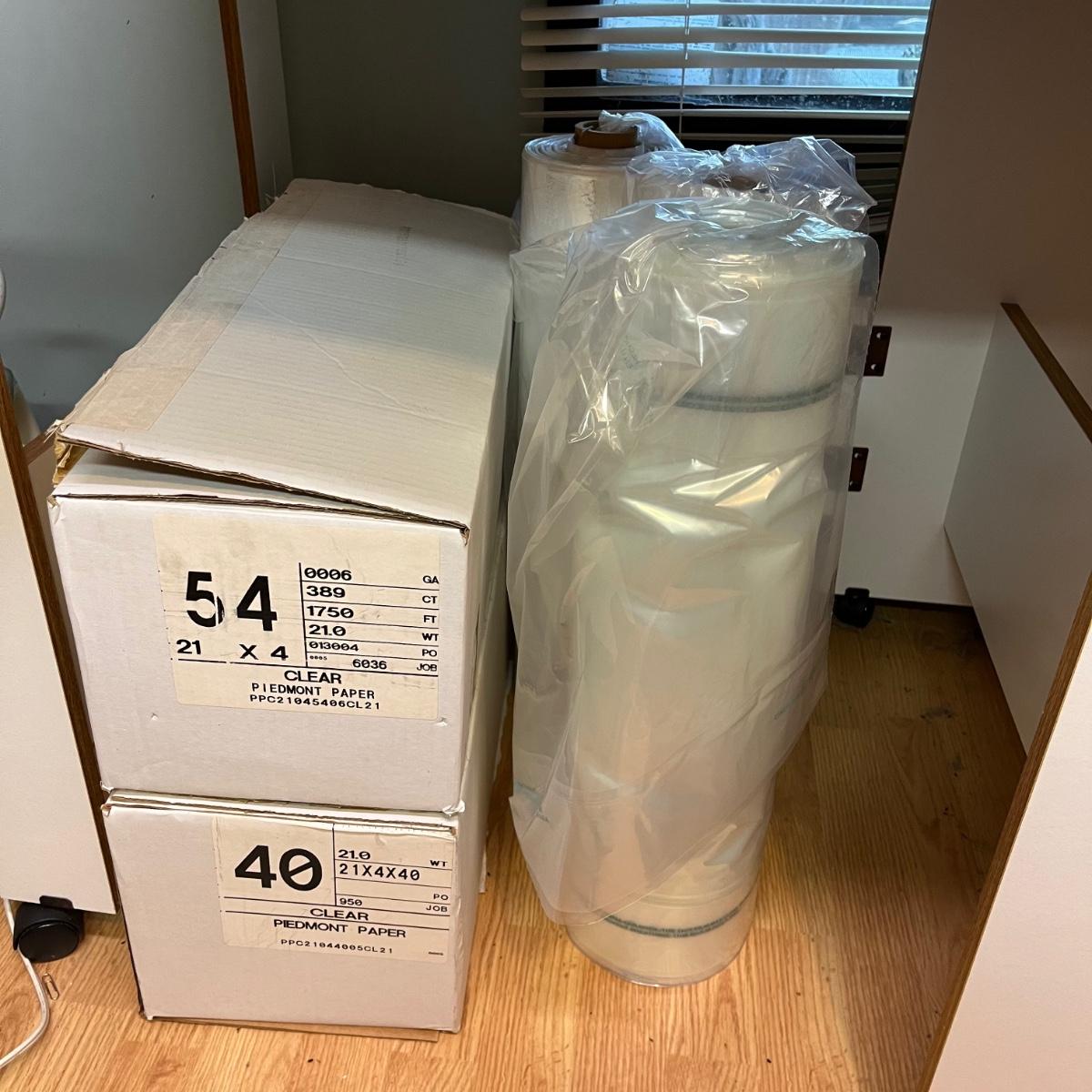 Lot includes two boxes of piedmont plastic and three open rolls. Plastic appears to be a continuous roll that can be made into bags. Boxes measure 9” x 9”.