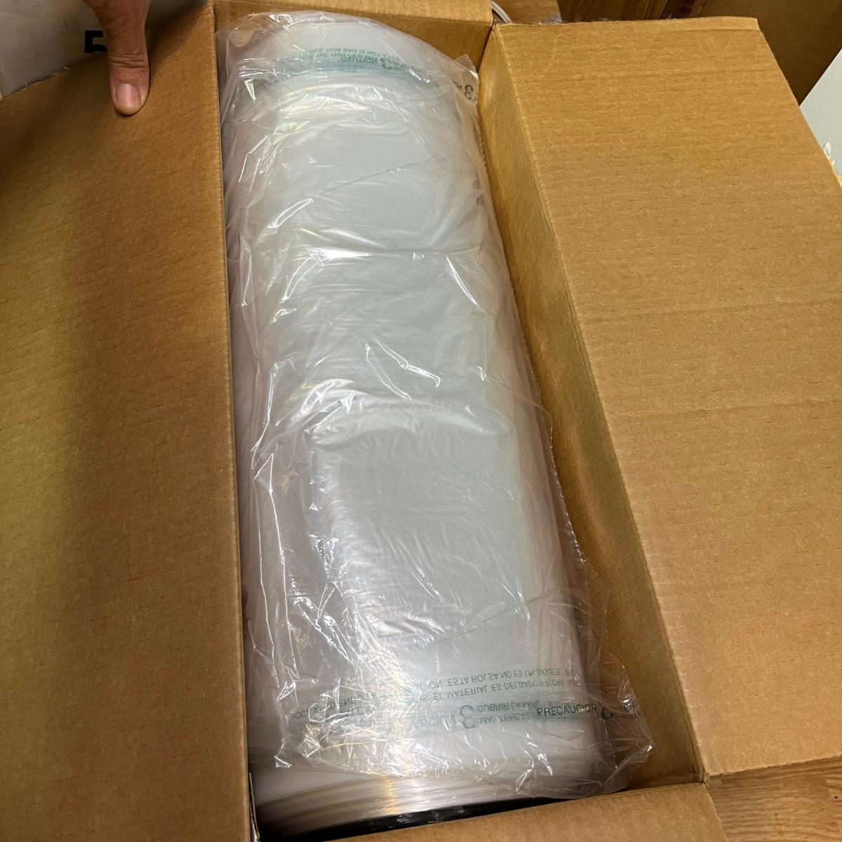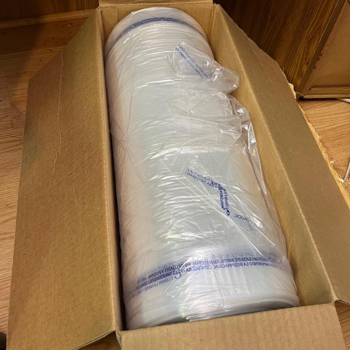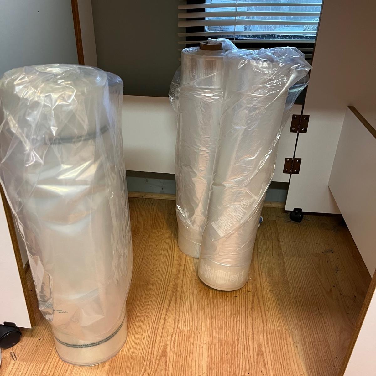 Lot includes two boxes of piedmont plastic and three open rolls. Plastic appears to be a continuous roll that can be made into bags. Boxes measure 9” x 9”.
