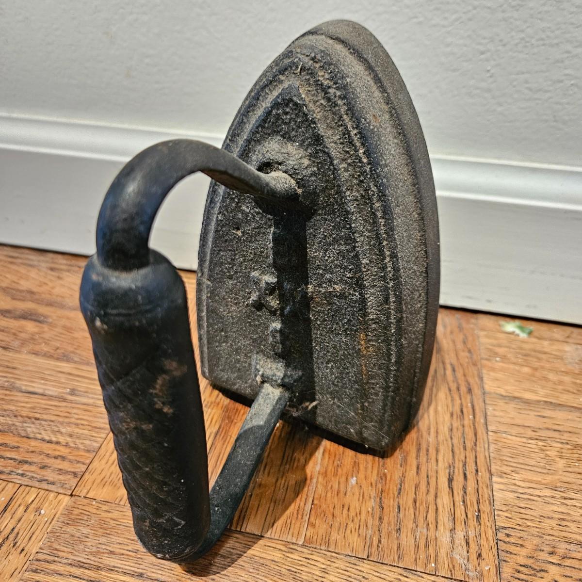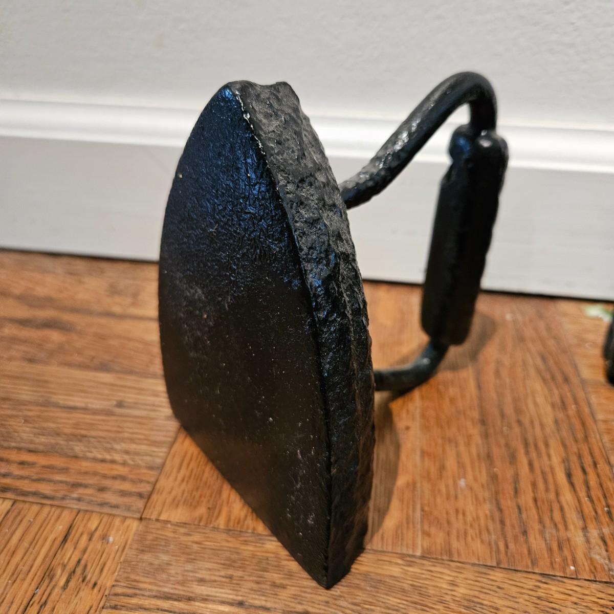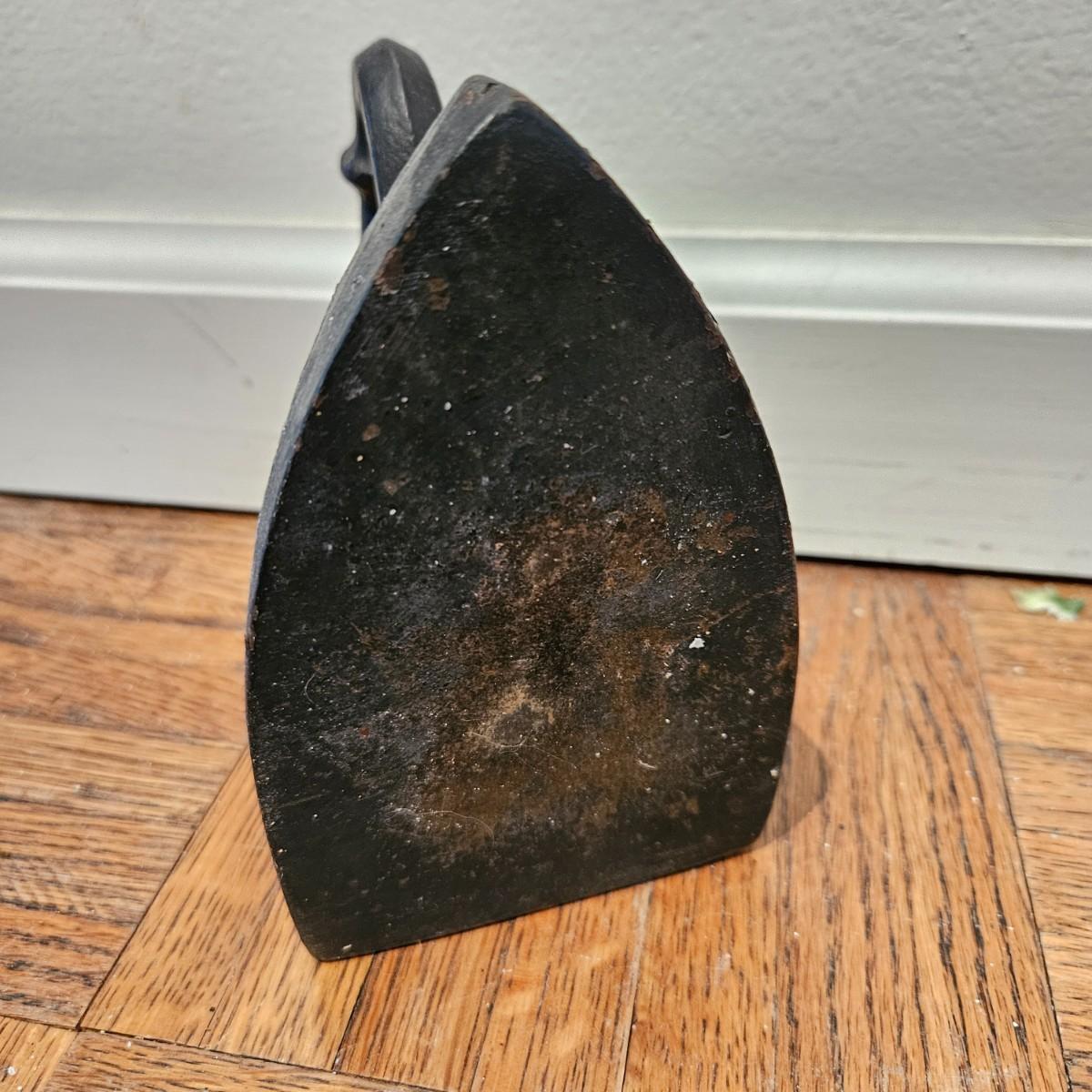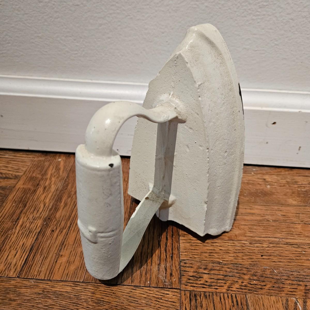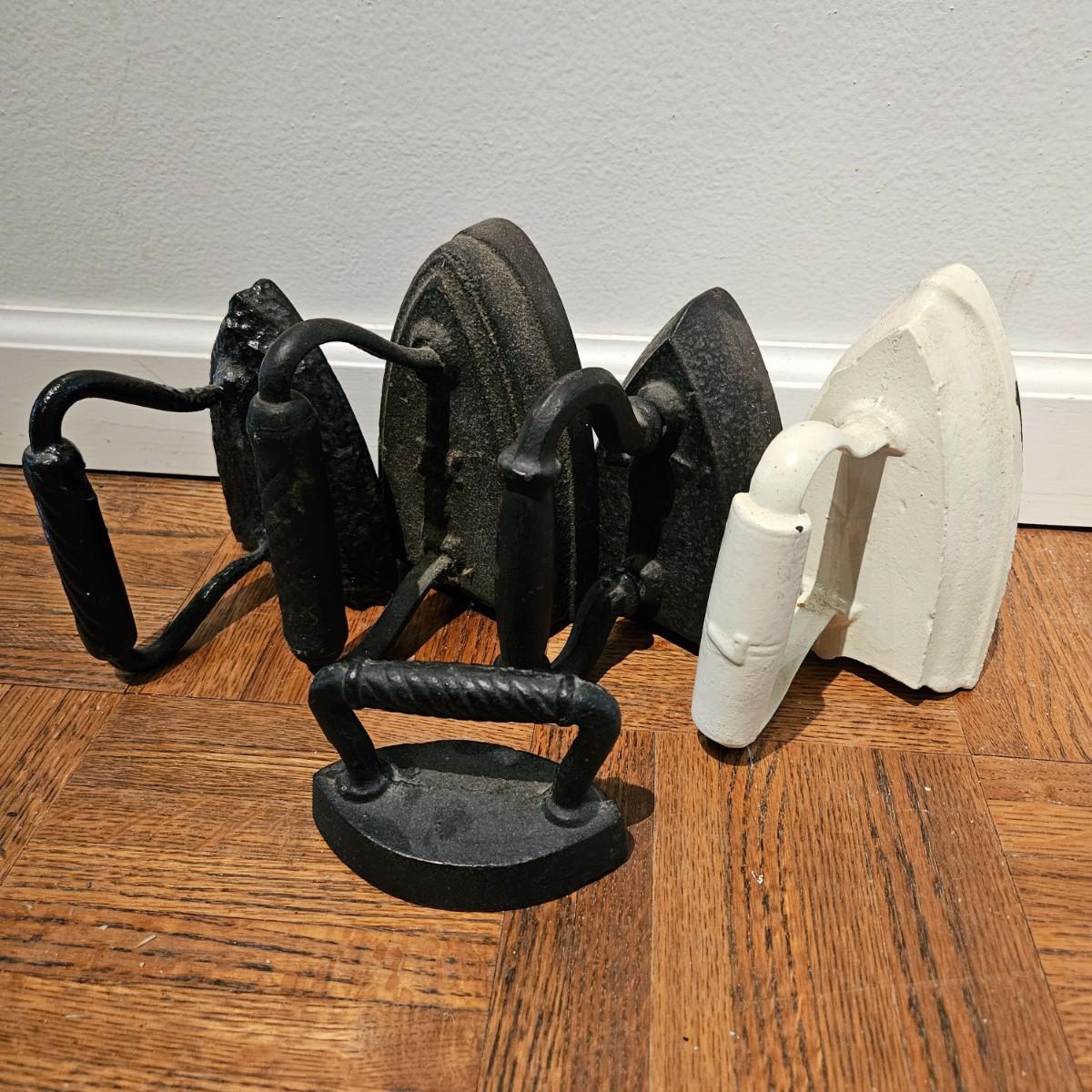 A set of five sadirons/flat irons that appear to be cast iron. The white one is marked with a 7 and measures approximately 6.5" x 4" x 5"H. Two of the other irons are marked, one with RFP 6 and the other with B XX 8. Pleas see photos for details. Local pickup only