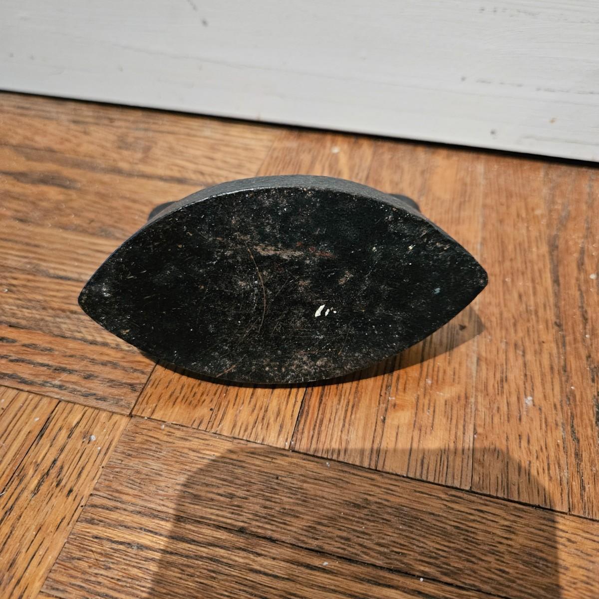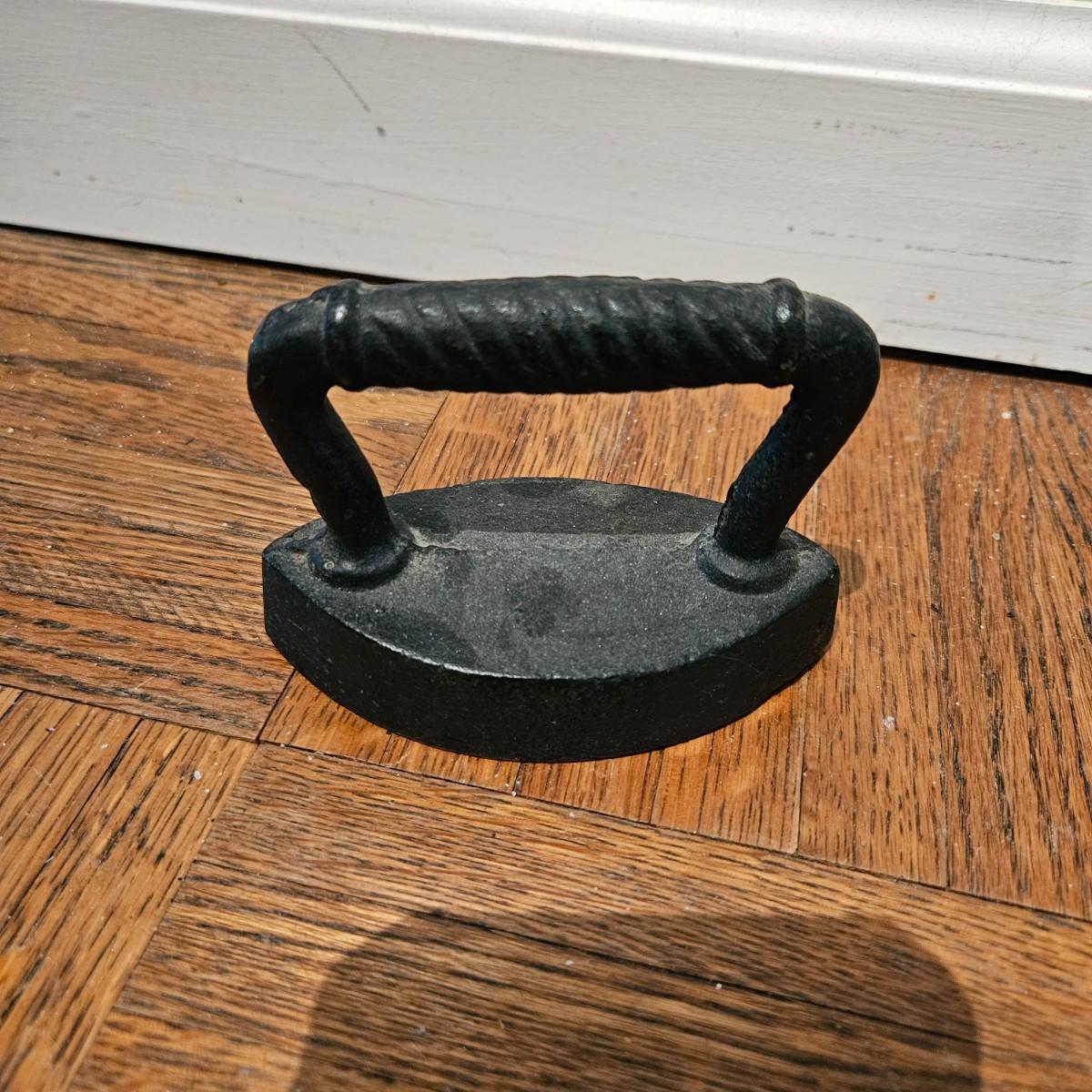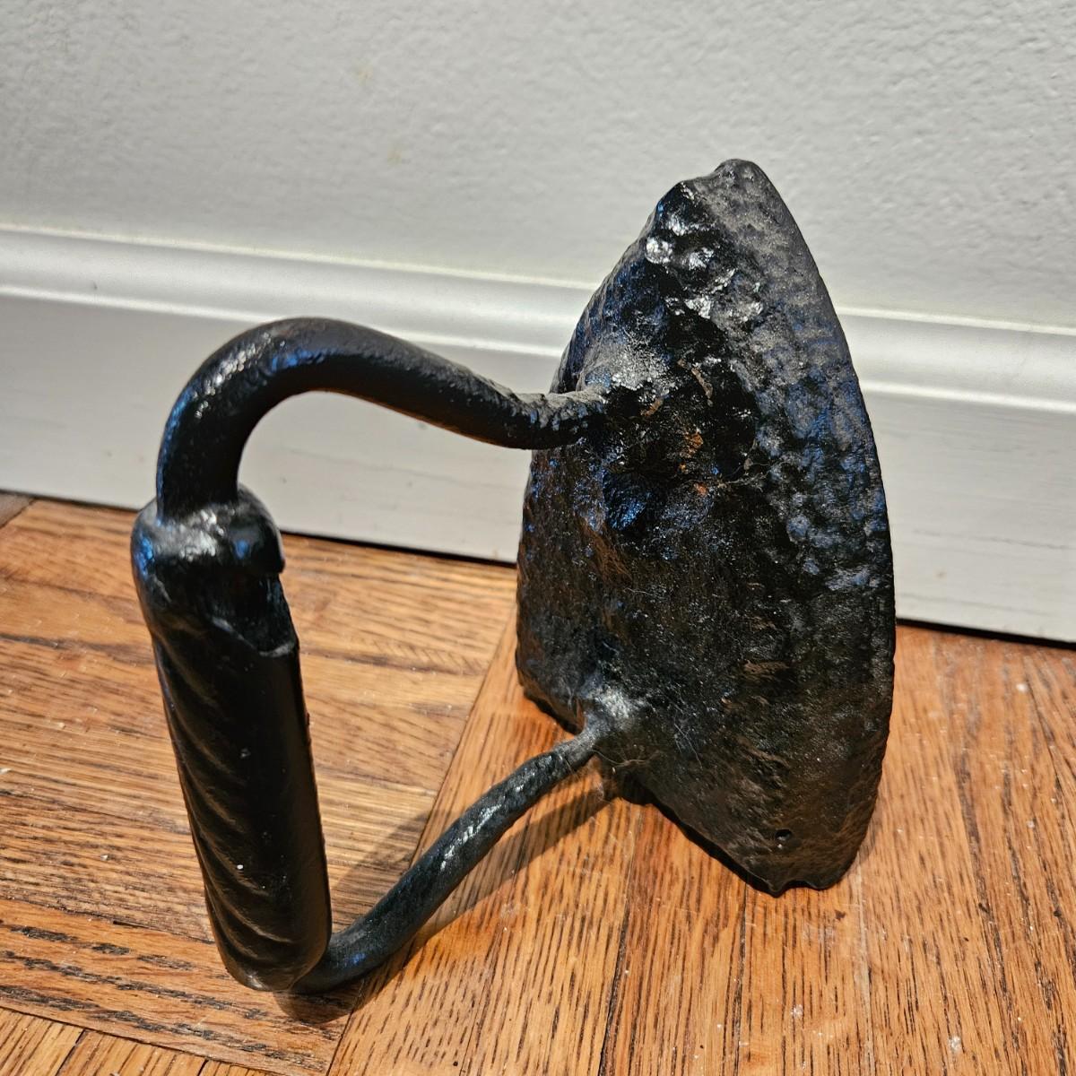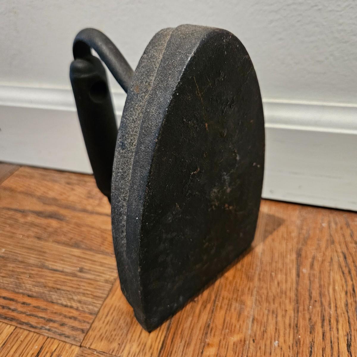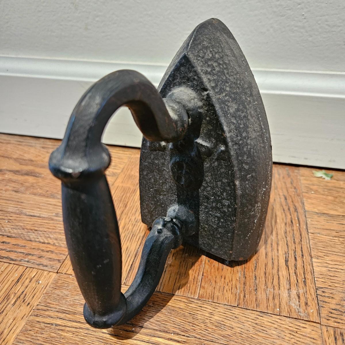 A set of five sadirons/flat irons that appear to be cast iron. The white one is marked with a 7 and measures approximately 6.5" x 4" x 5"H. Two of the other irons are marked, one with RFP 6 and the other with B XX 8. Pleas see photos for details. Local pickup only