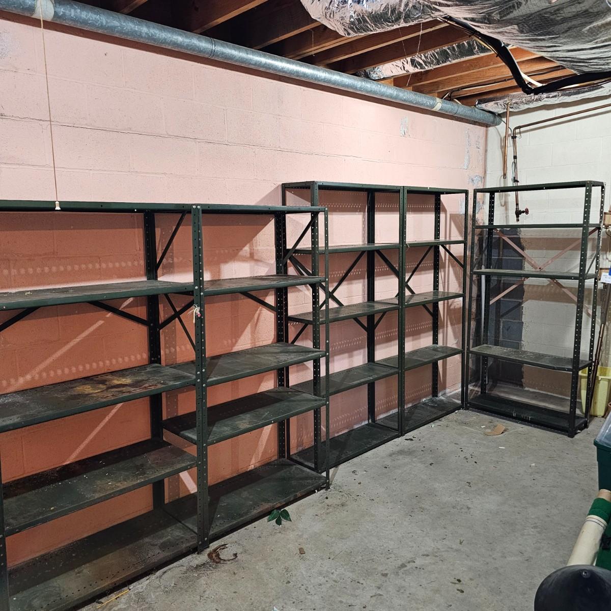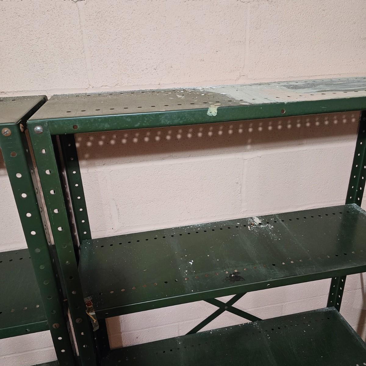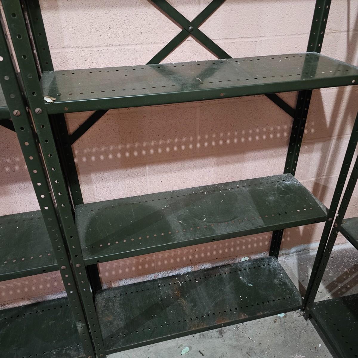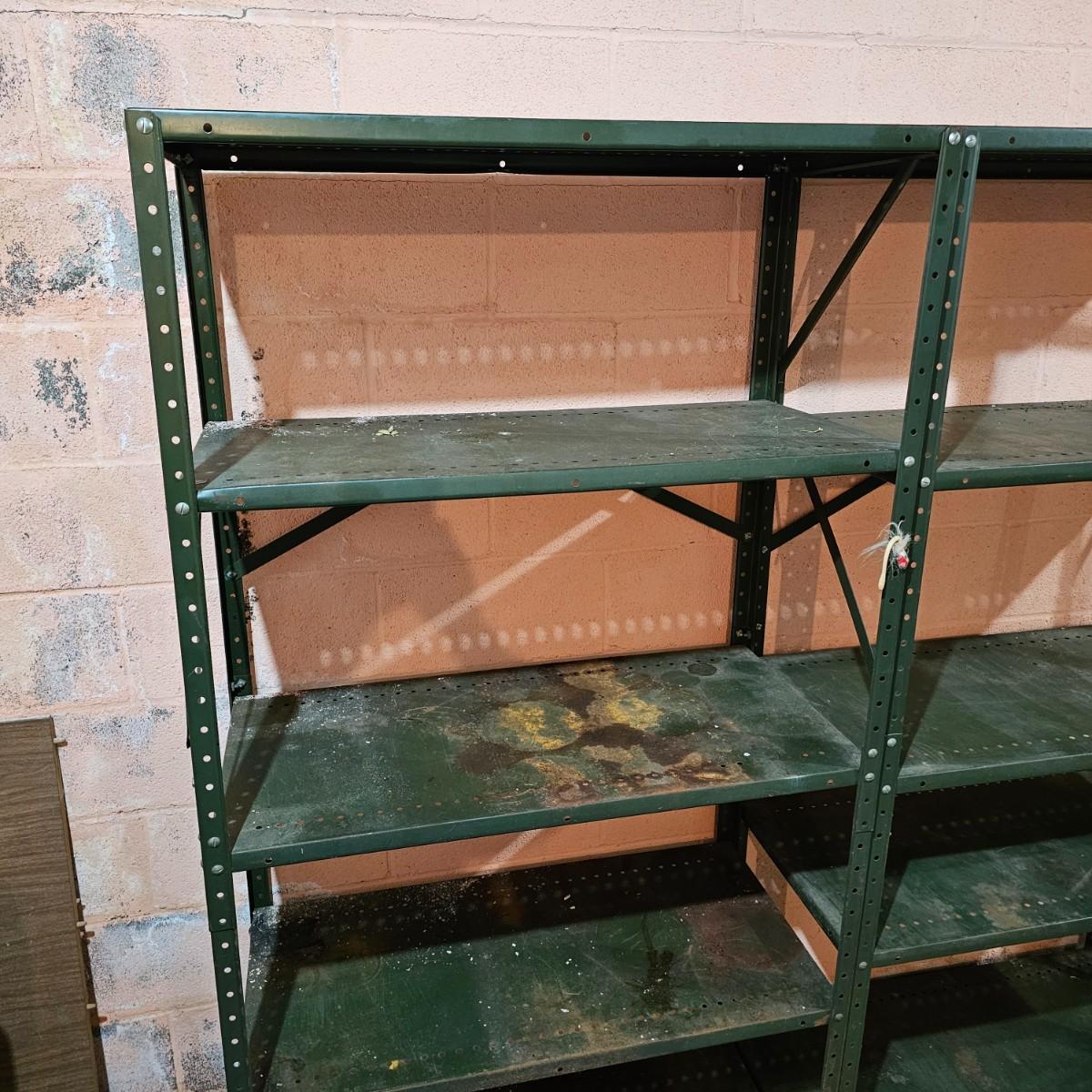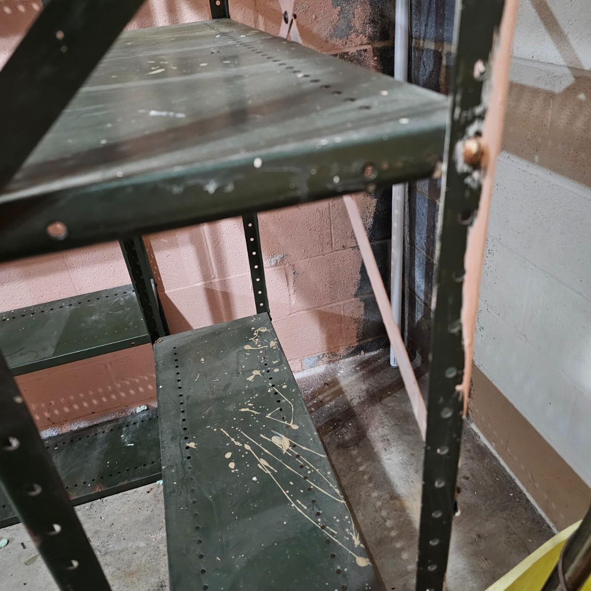 Five sets of five shelves each steel storage shelves. All green in color. Two units measure 36" x 18" x 69"H, other three are 36" x 12" x 75"H. Some rust and corrosion, spilled paint and such on units. See photos for details. Local pickup only. Items are in basement level but near outside exit.