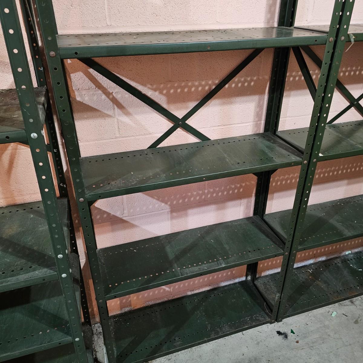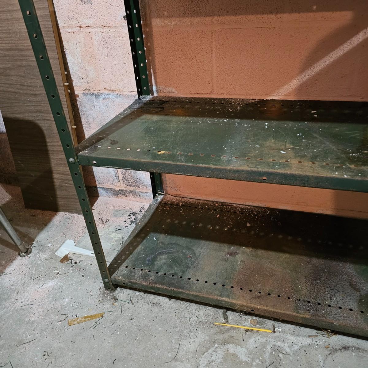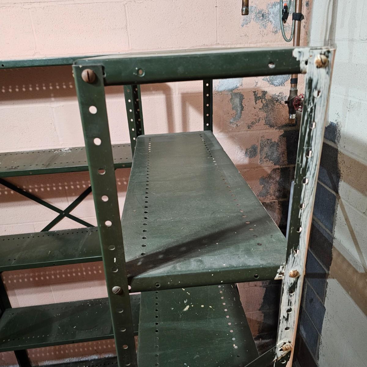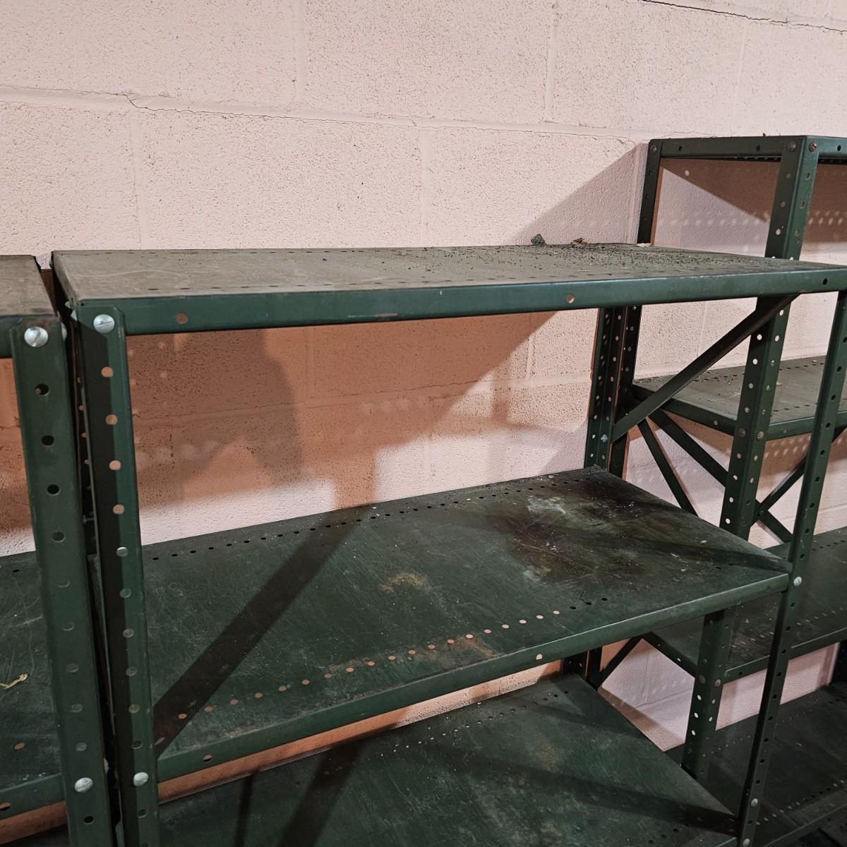 Five sets of five shelves each steel storage shelves. All green in color. Two units measure 36" x 18" x 69"H, other three are 36" x 12" x 75"H. Some rust and corrosion, spilled paint and such on units. See photos for details. Local pickup only. Items are in basement level but near outside exit.