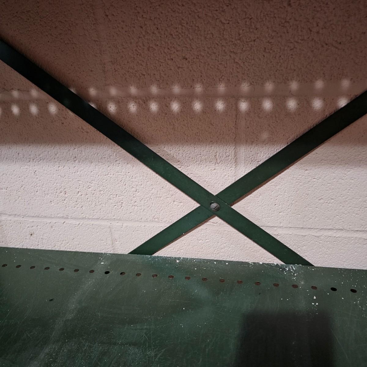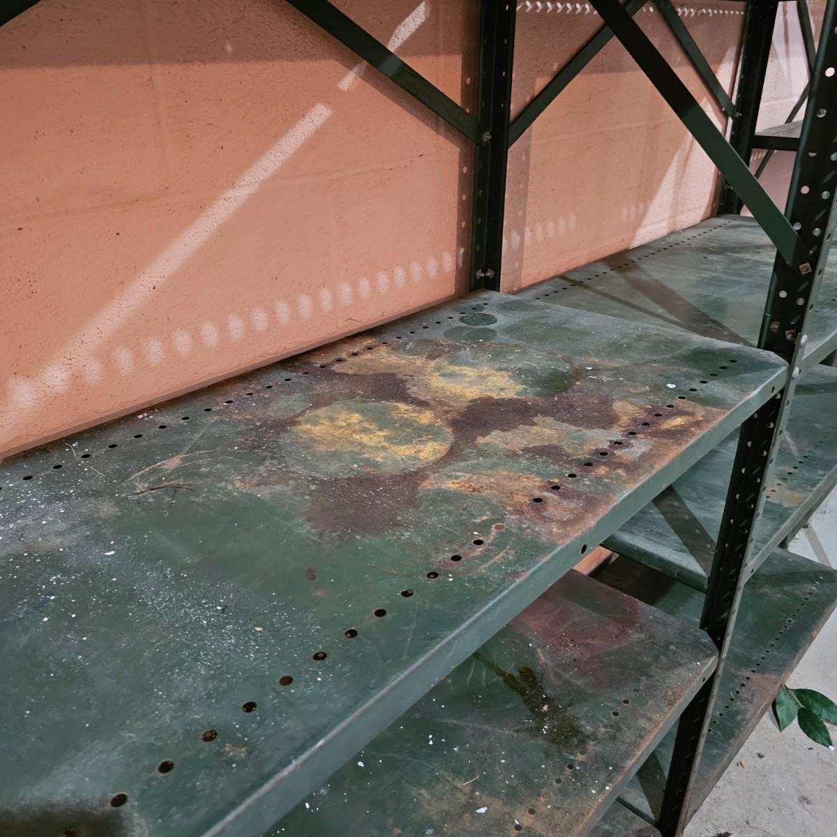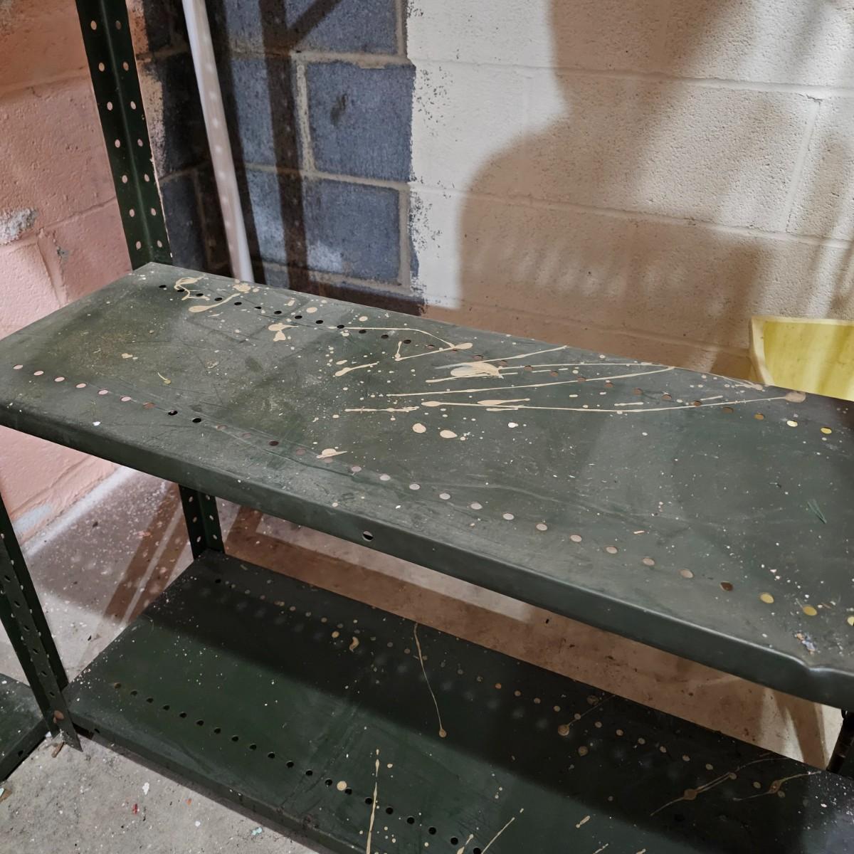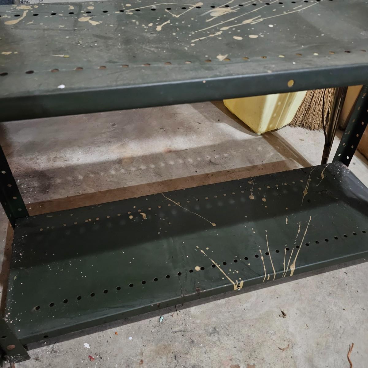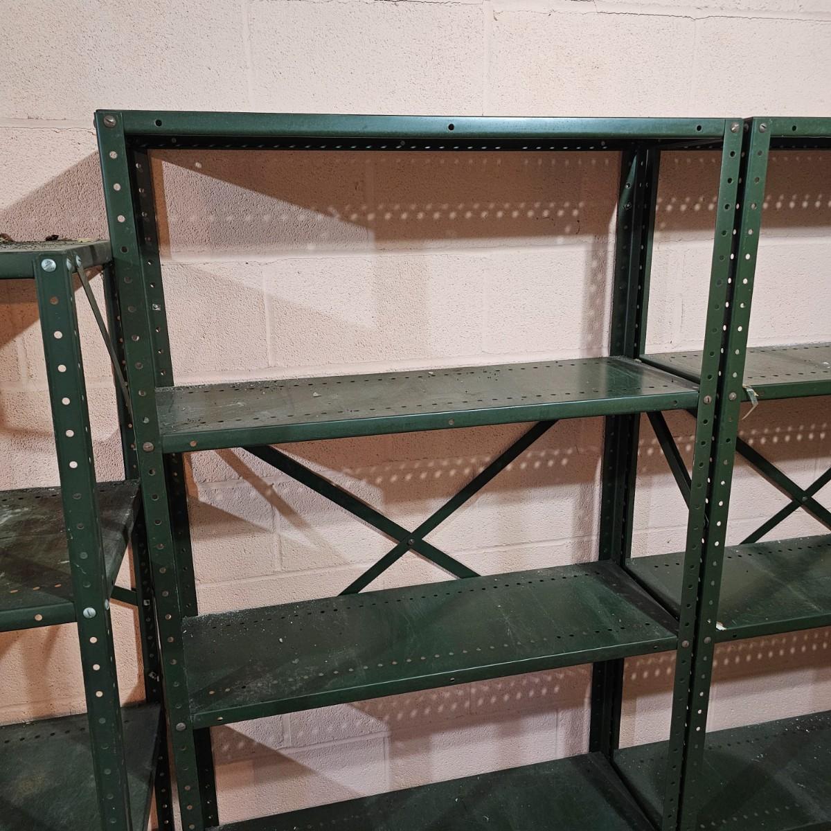 Five sets of five shelves each steel storage shelves. All green in color. Two units measure 36" x 18" x 69"H, other three are 36" x 12" x 75"H. Some rust and corrosion, spilled paint and such on units. See photos for details. Local pickup only. Items are in basement level but near outside exit.