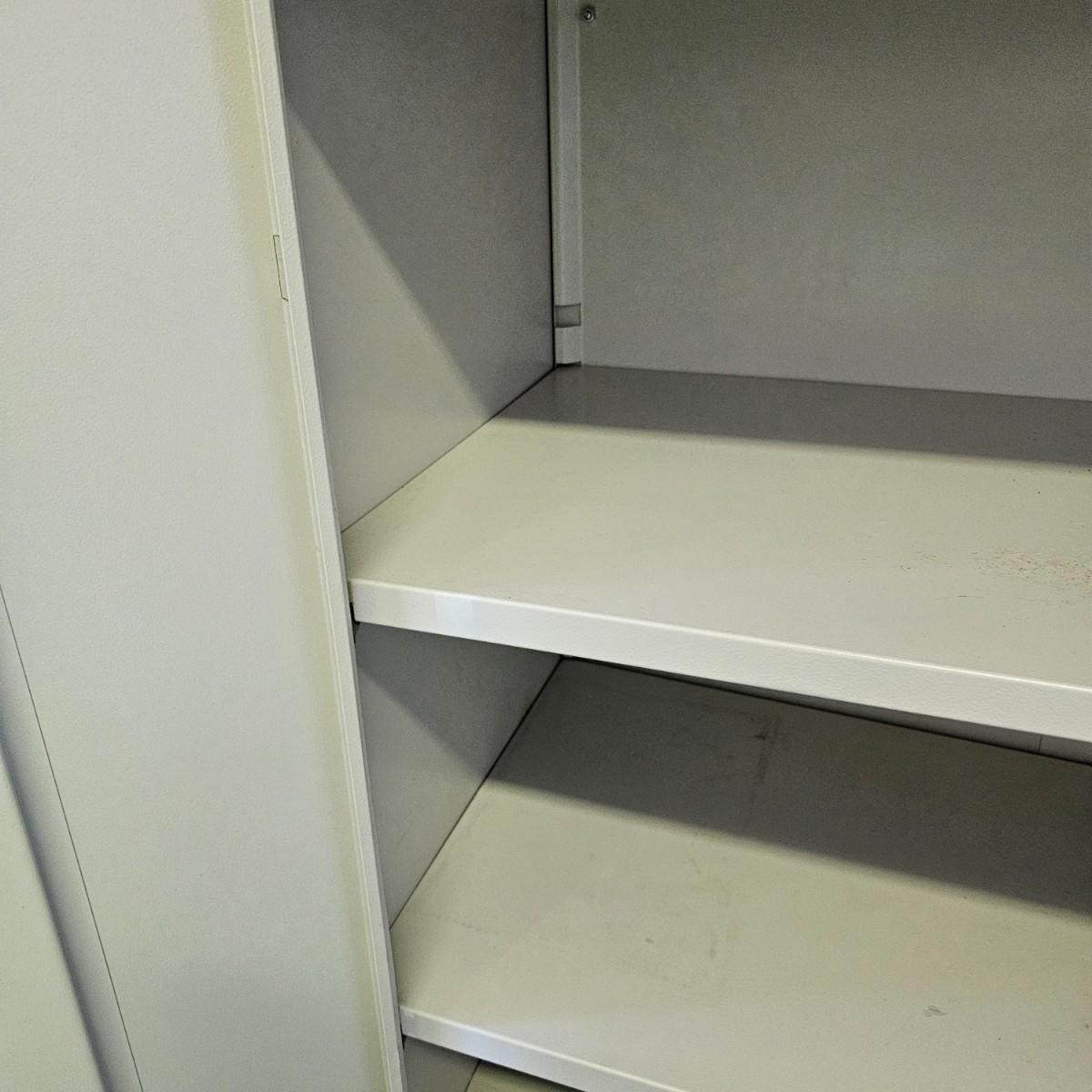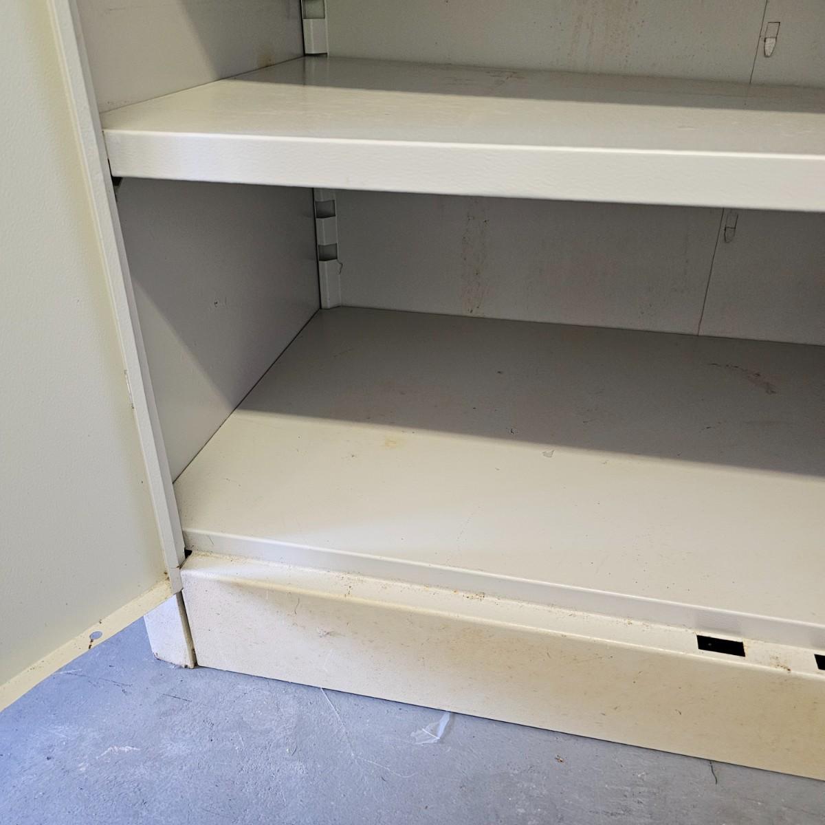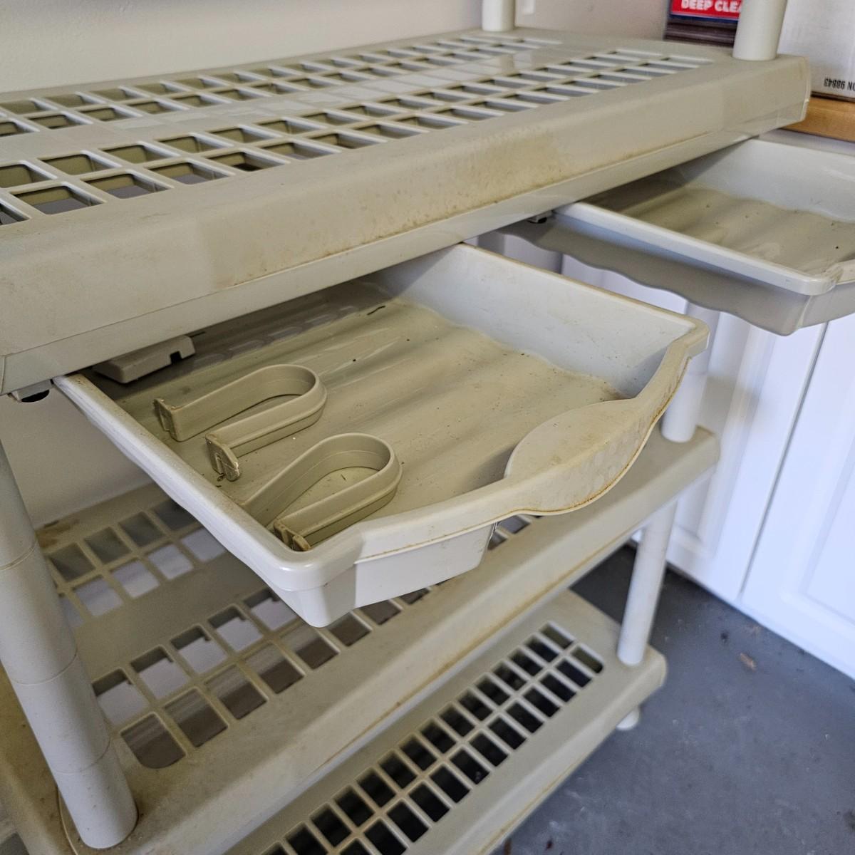 Plastic five shelf storage rack with two pull out drawers. Rack has feet, measures 17" xc33" x 73"H. Metal storage bin has double doors, two inside shelves and measures 18" x 36" x 41"H. Both items have some discoloration and dings. See photos for details. Local pickup only.