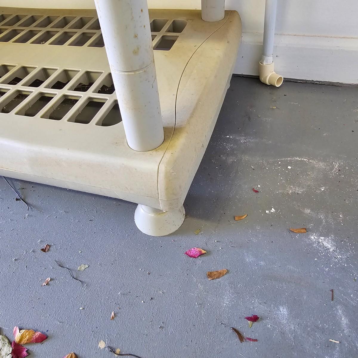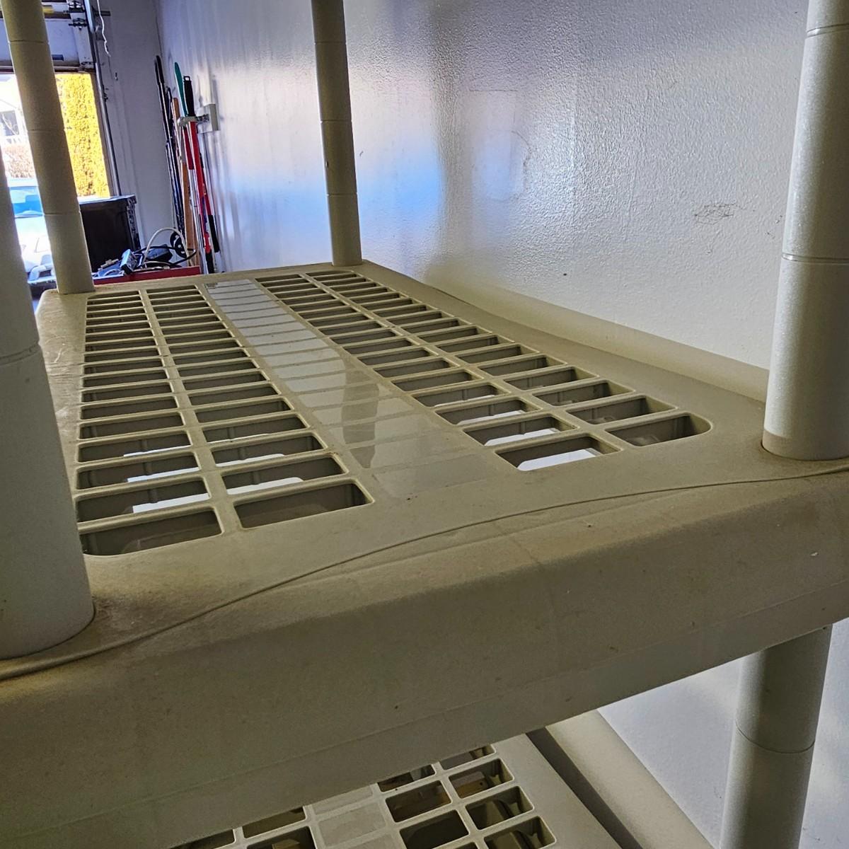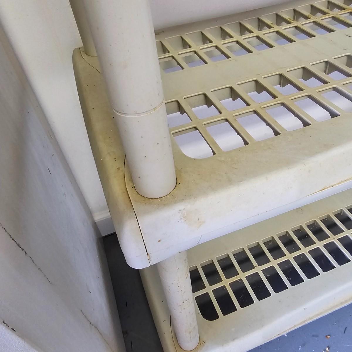 Plastic five shelf storage rack with two pull out drawers. Rack has feet, measures 17" xc33" x 73"H. Metal storage bin has double doors, two inside shelves and measures 18" x 36" x 41"H. Both items have some discoloration and dings. See photos for details. Local pickup only.