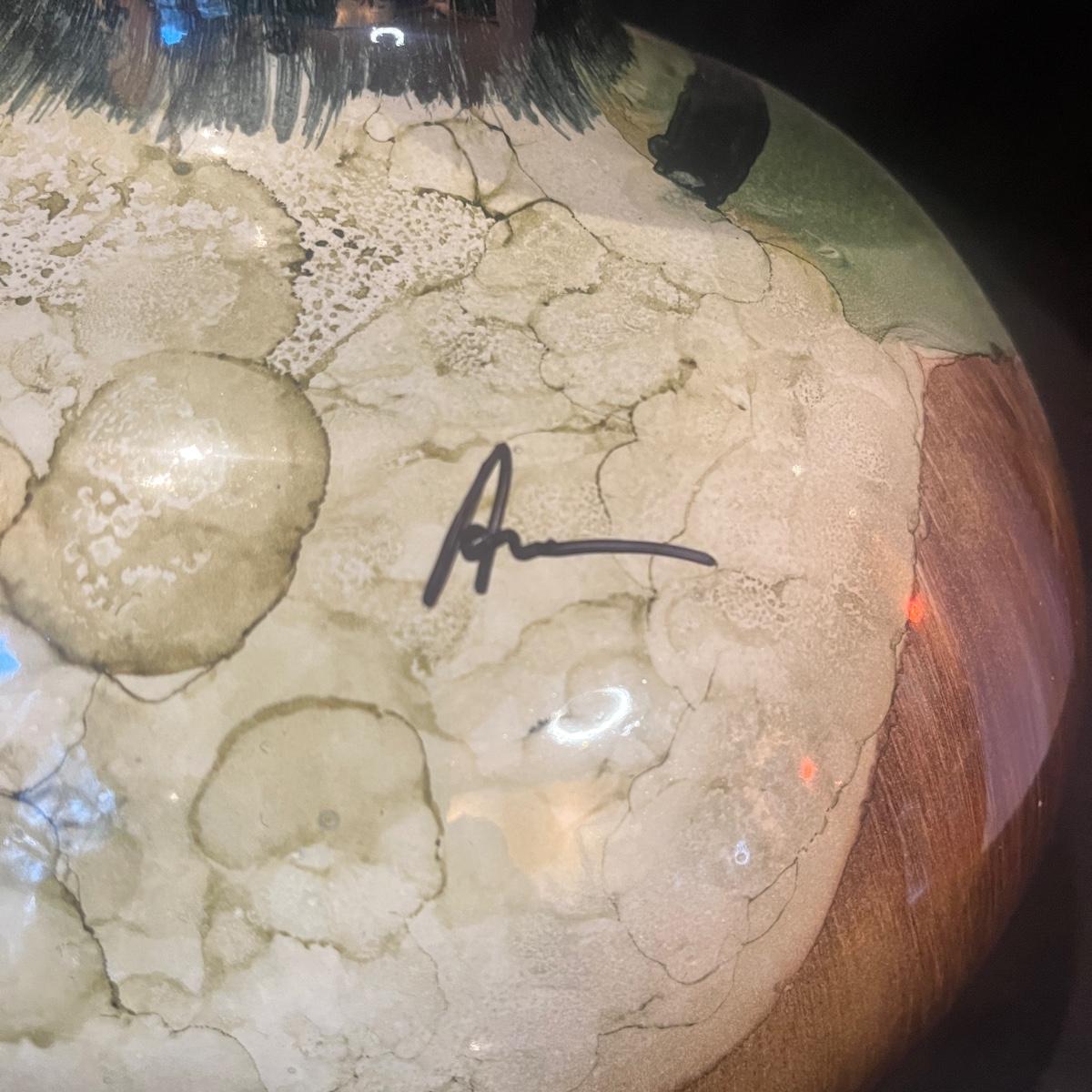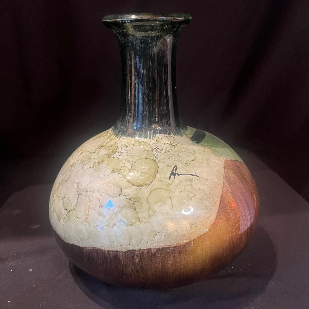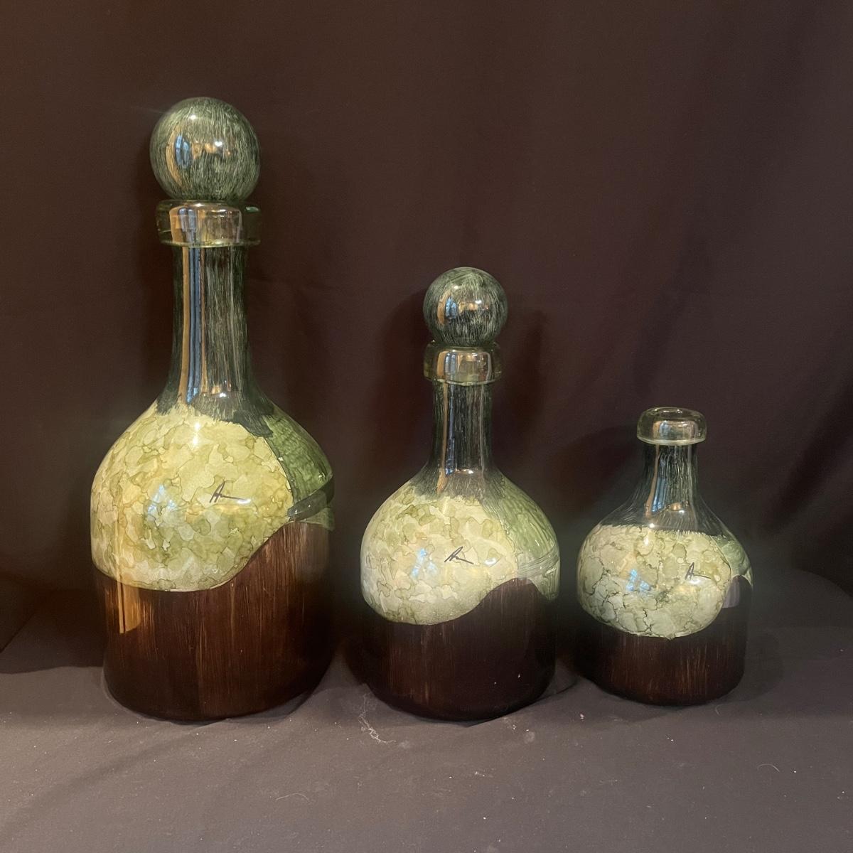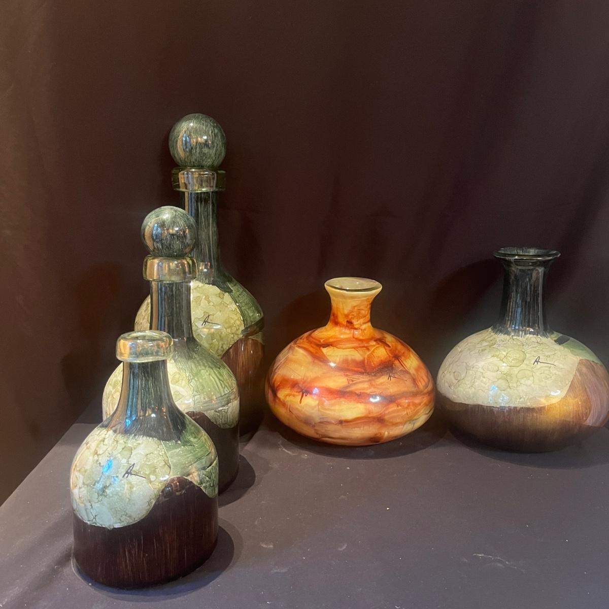 Lot includes five signed bottles that appear to be hand blown. Two bottles have glass stoppers. Tallest bottle with stopper mead 8”D x 19.5”H. One has a "Made in Mexico" sticker.