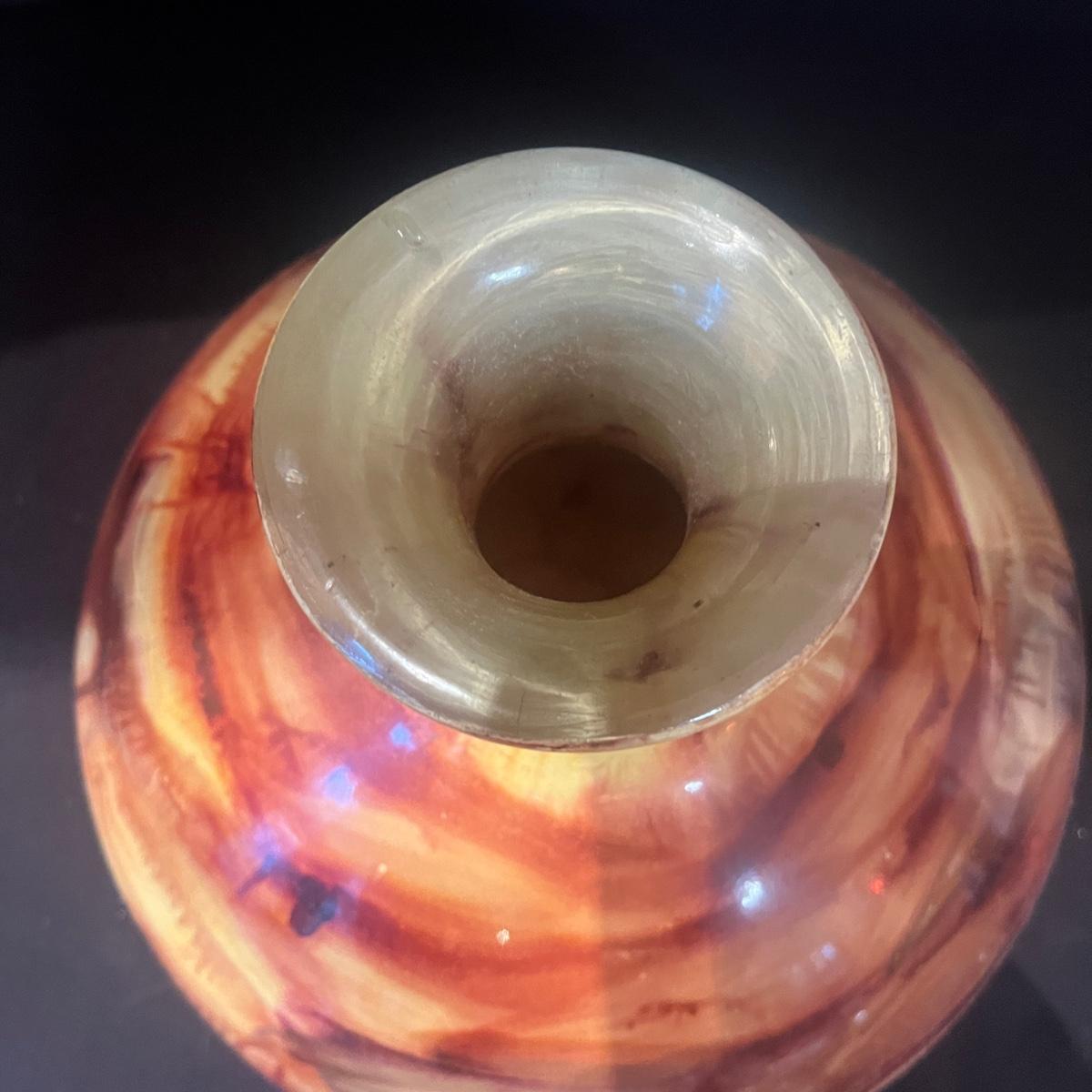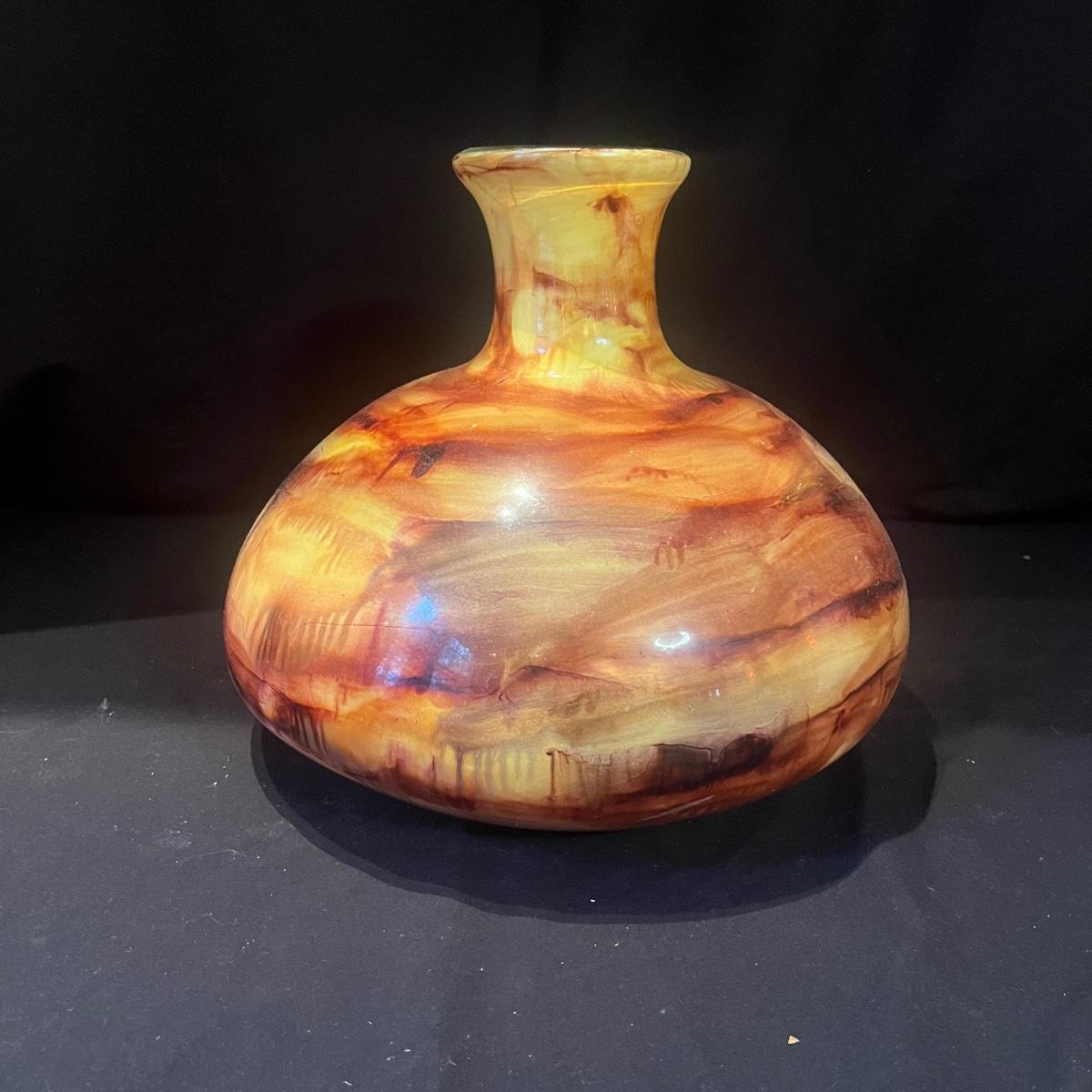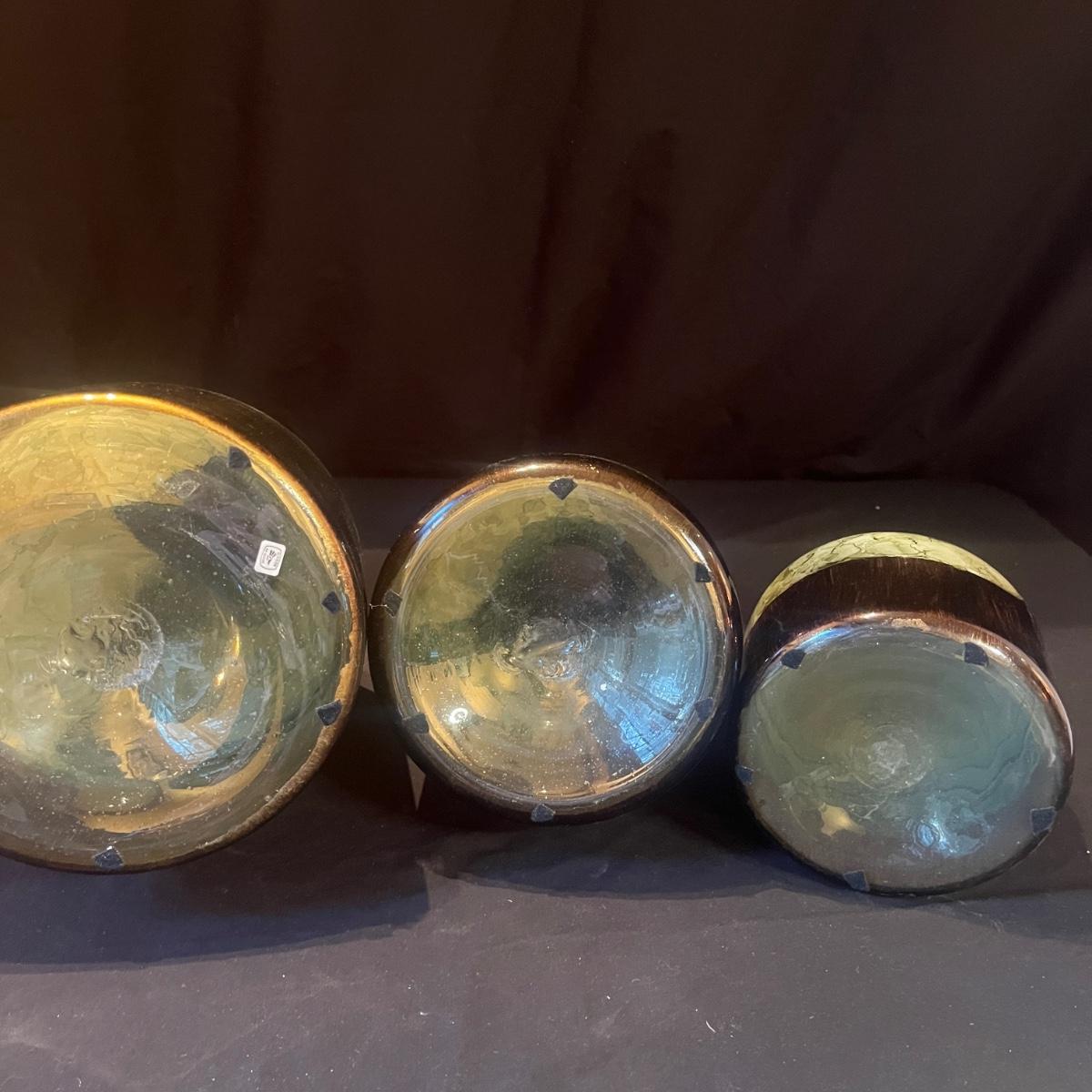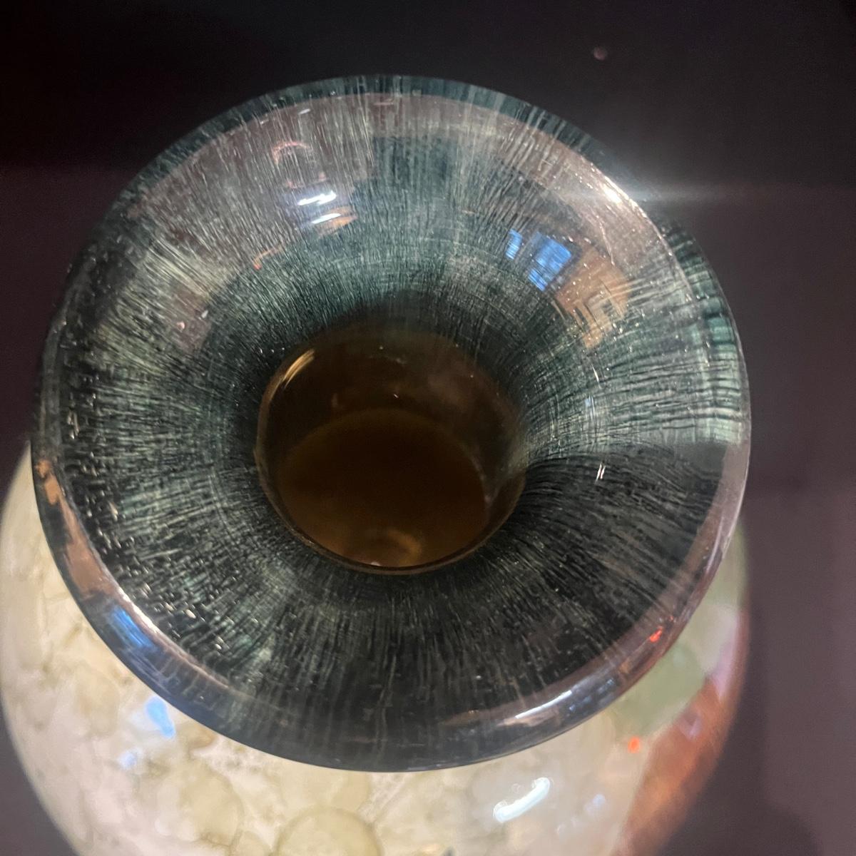 Lot includes five signed bottles that appear to be hand blown. Two bottles have glass stoppers. Tallest bottle with stopper mead 8”D x 19.5”H. One has a "Made in Mexico" sticker.