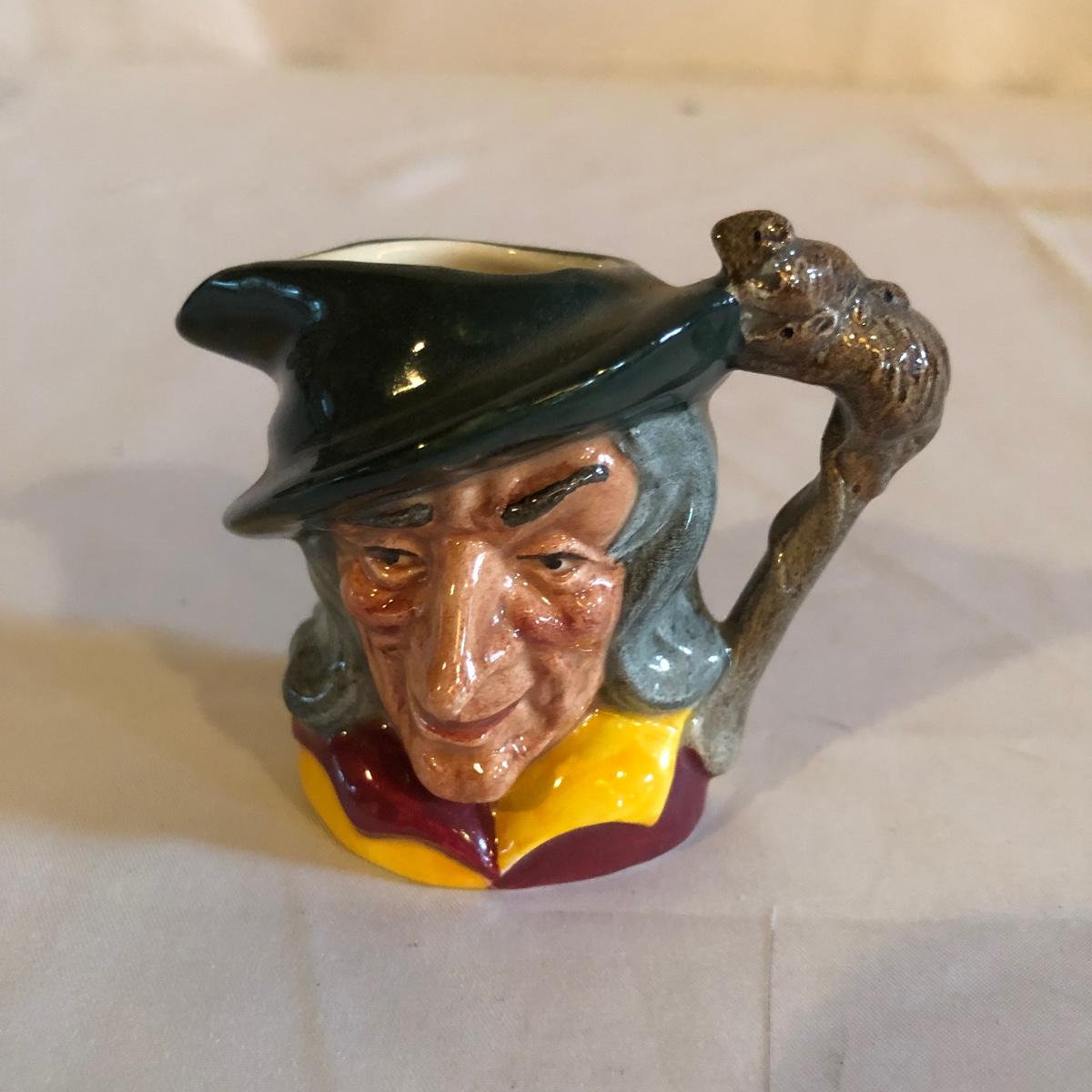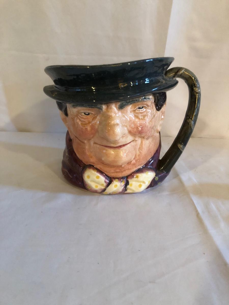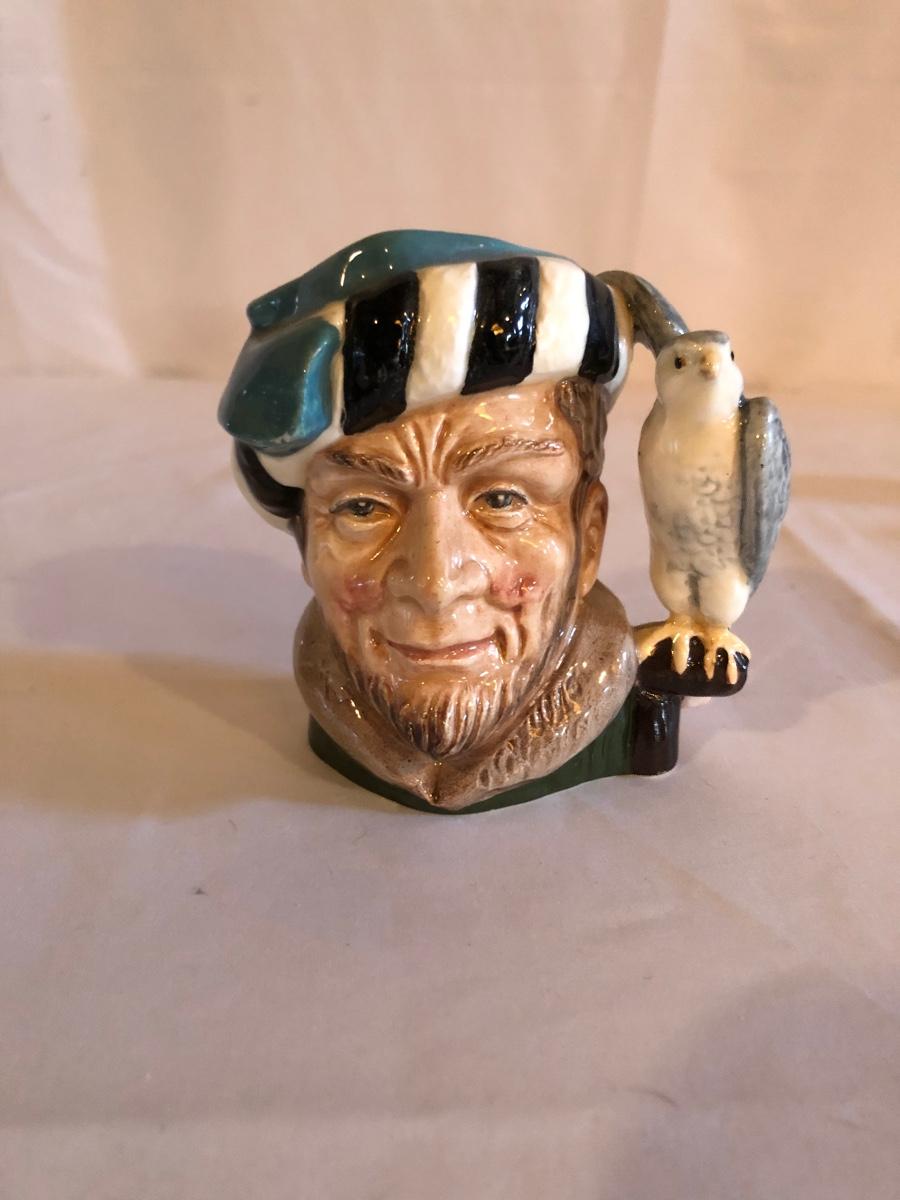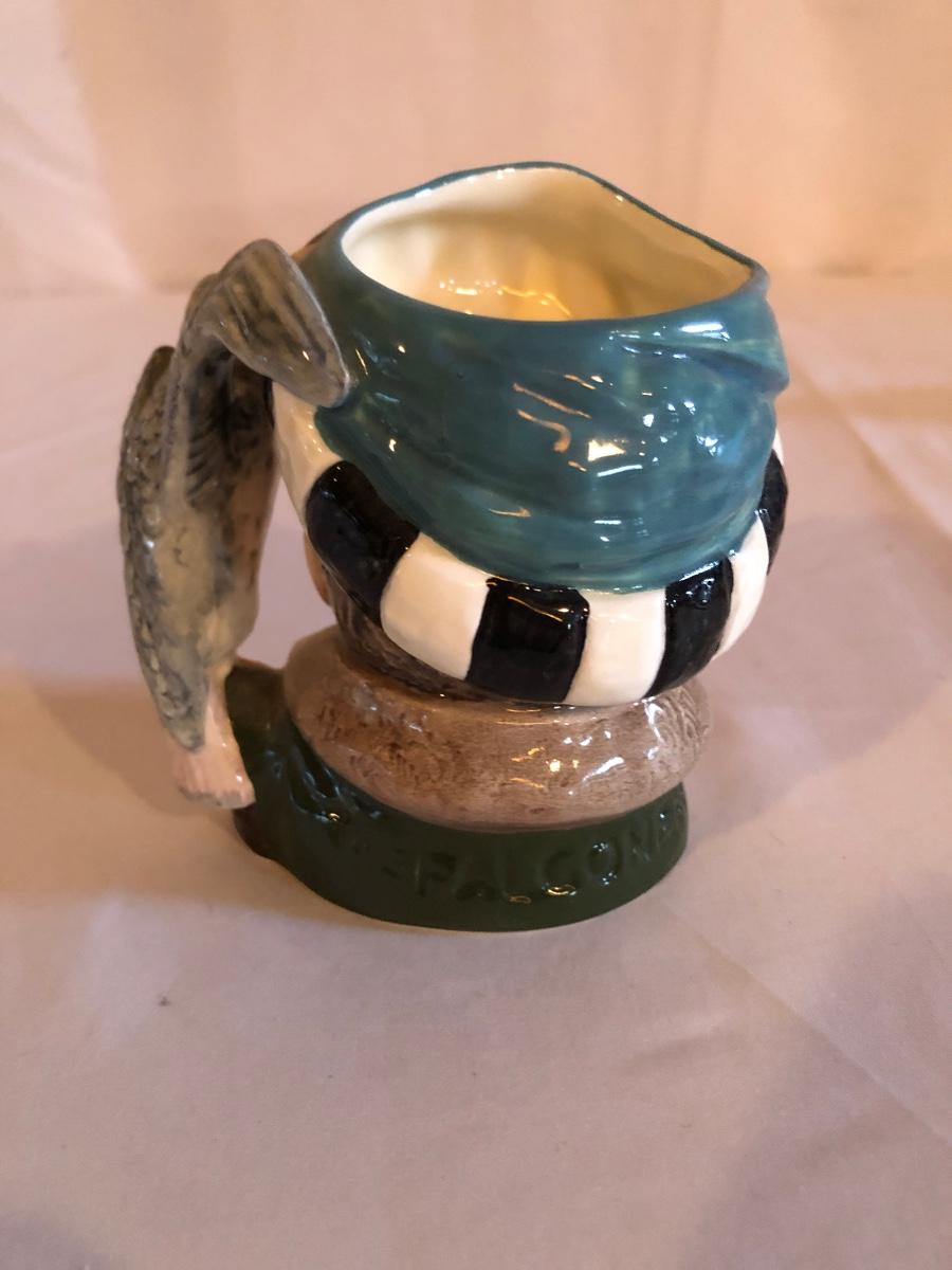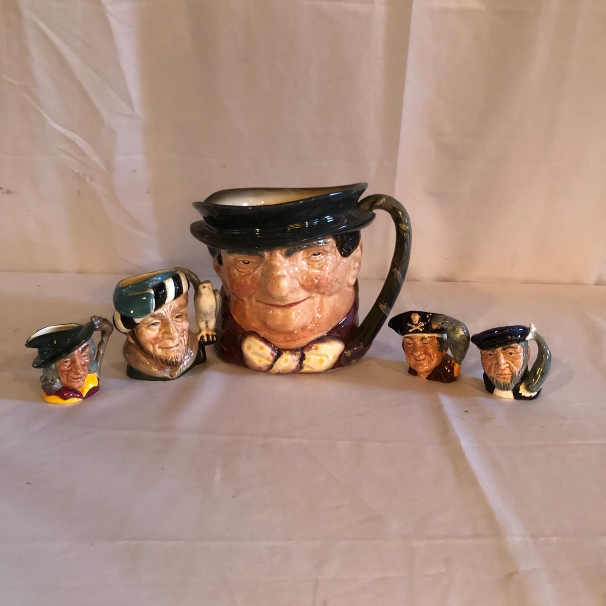Lot includes Tony Weller mug, The Falconer mug, Pied Piper mug, Captain Ahab mug and Long John Silver Mug. All are Marked Royal Doulton. Largest mug measures 7” x 8” x 6.5”.