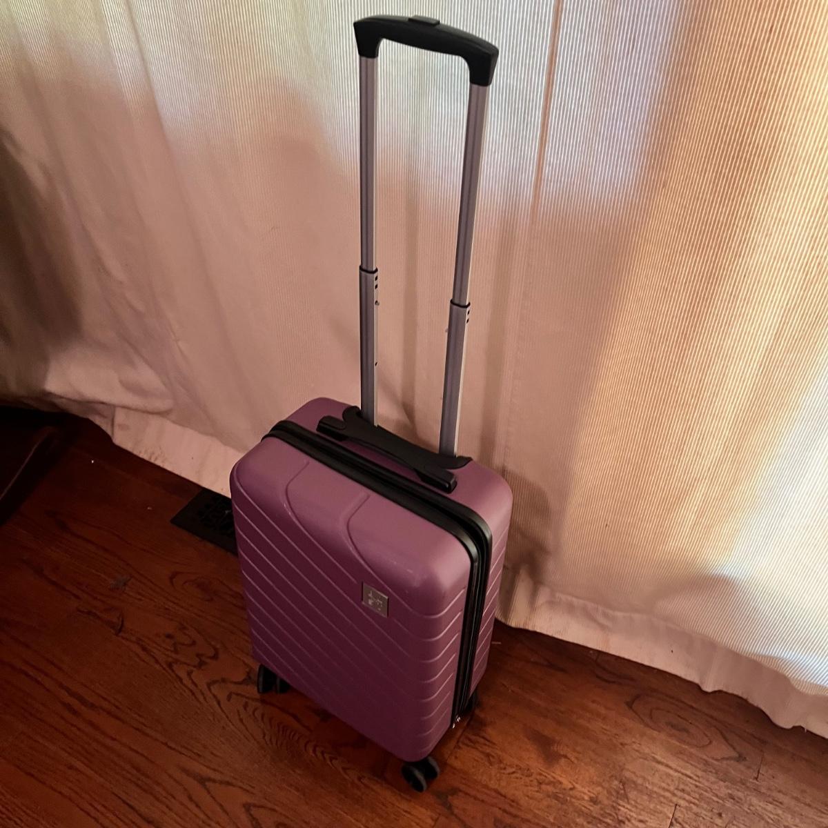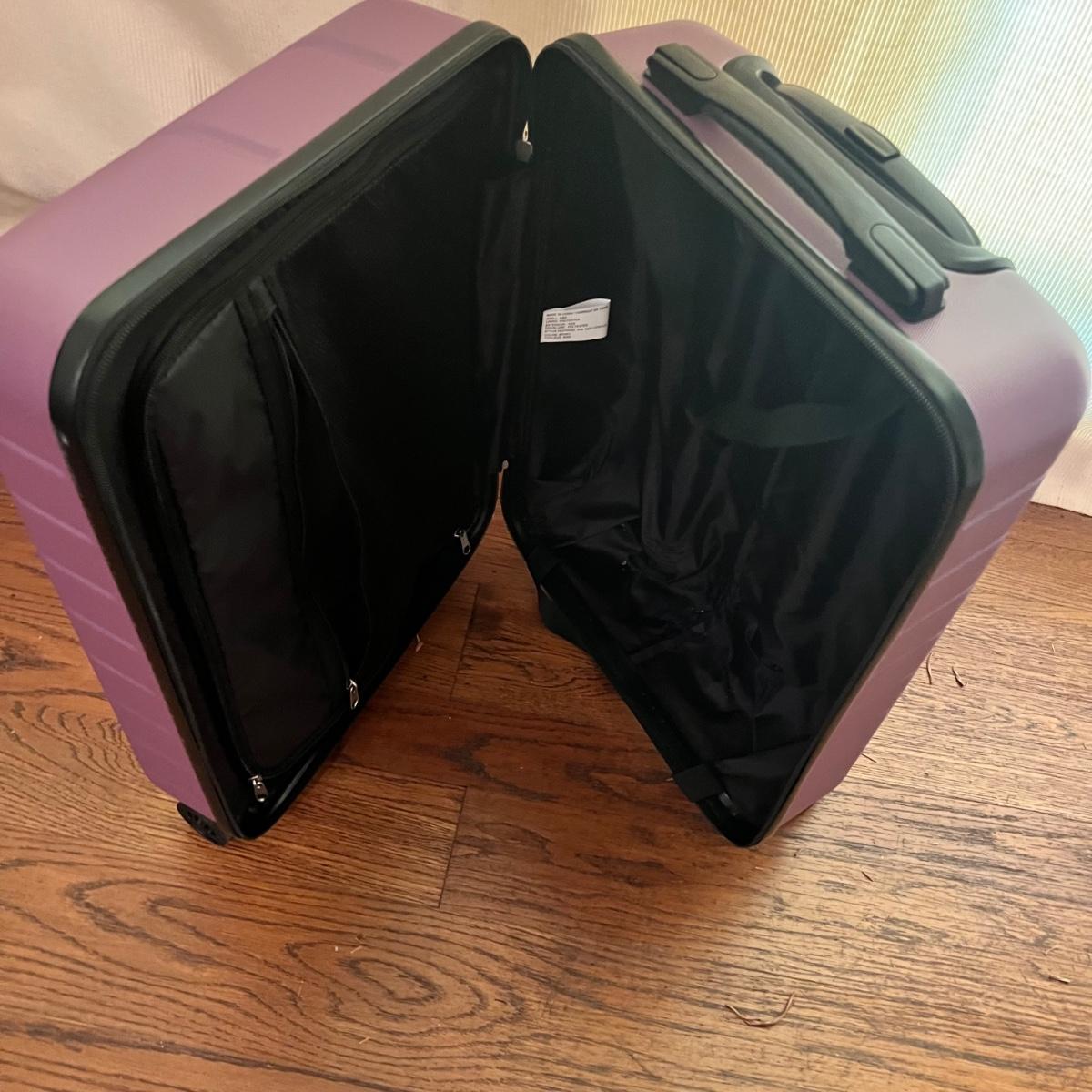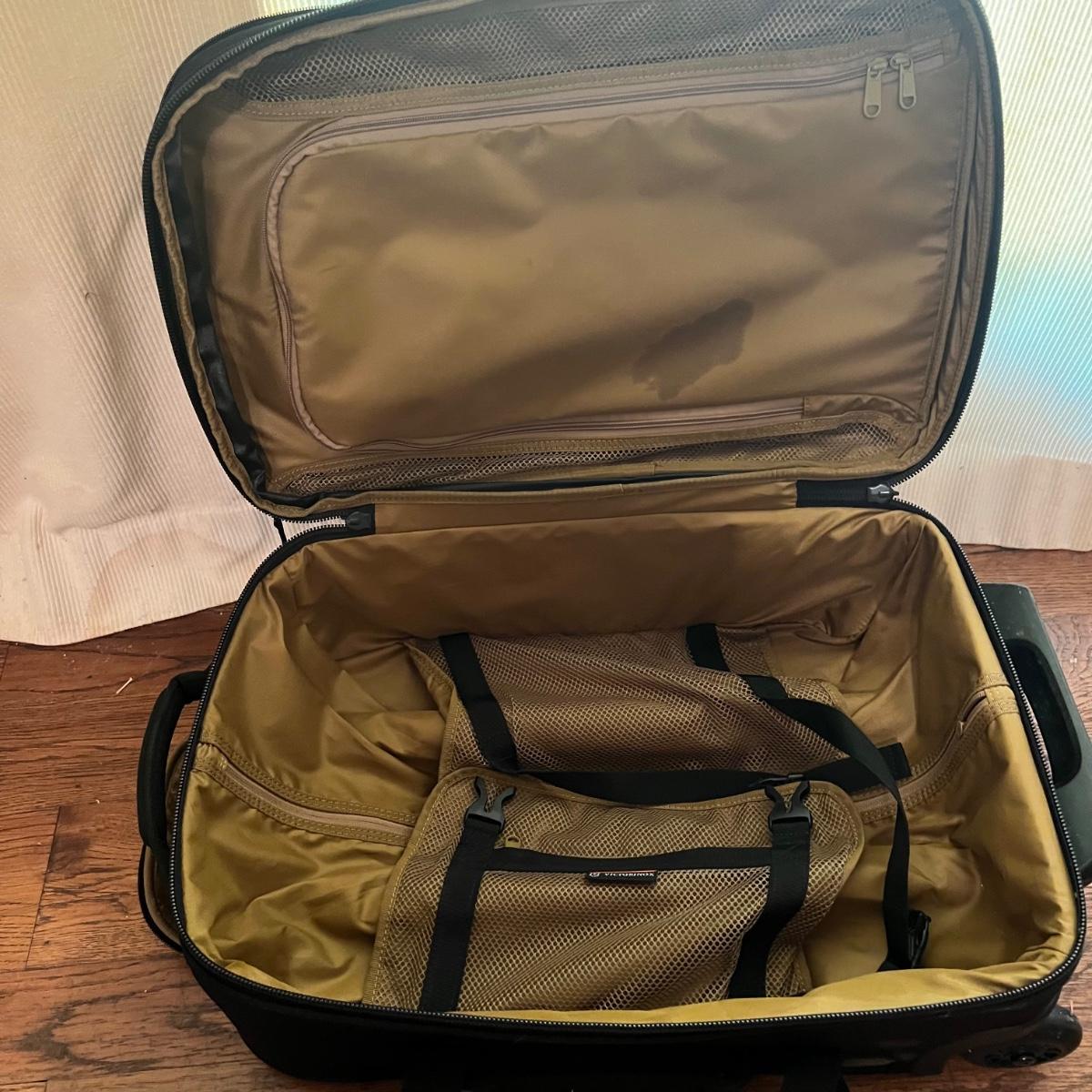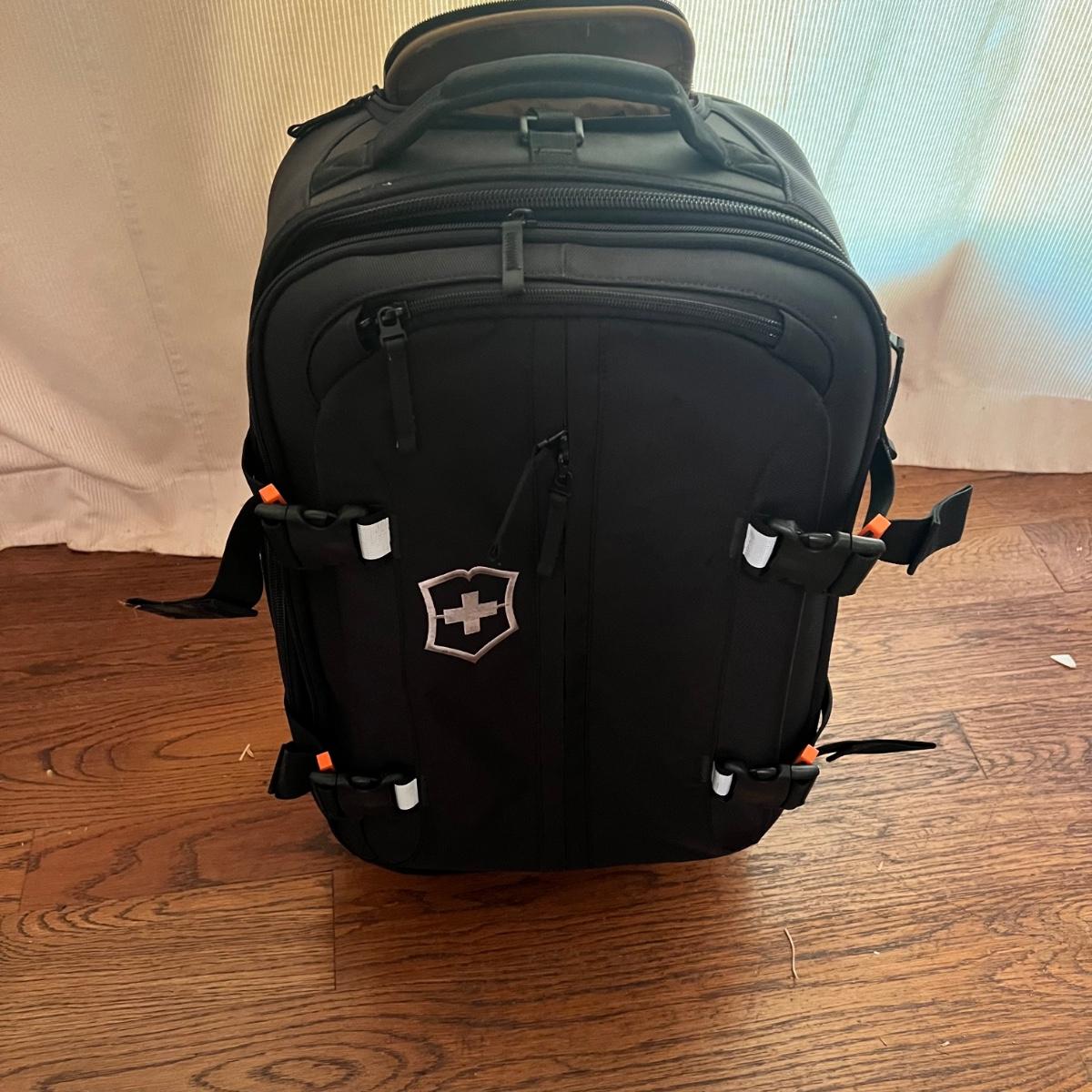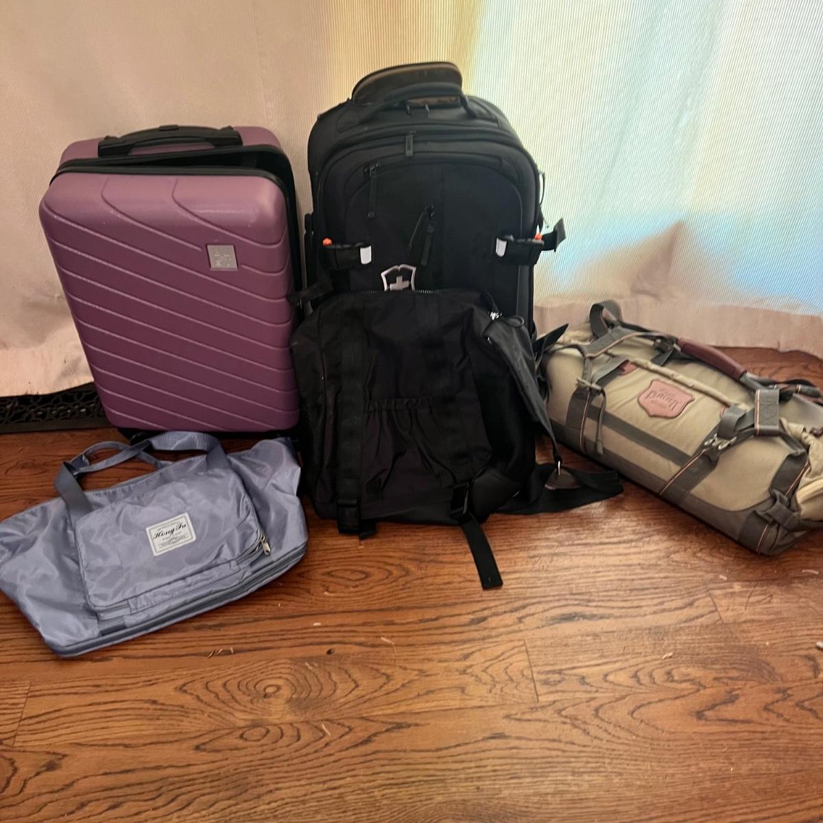 A black Victorinox roll a board suit case measures 15” x 9” x 22”H. The bag has an expandable zipper option (to make the bag wider) and an internal mesh garment holder. A green Eddie Bauer over the shoulder bag (no wheels) measures approximately 24” x 15” x 11”H. While this bag is not in a package, it appears to have never been used. A hard-sided purple Bond Street measures approximately 14” x 9” x 21”H. There are two similarly sized smaller carry bags (blue and black) that both measure appropriately 15” x 5” x 14”H.