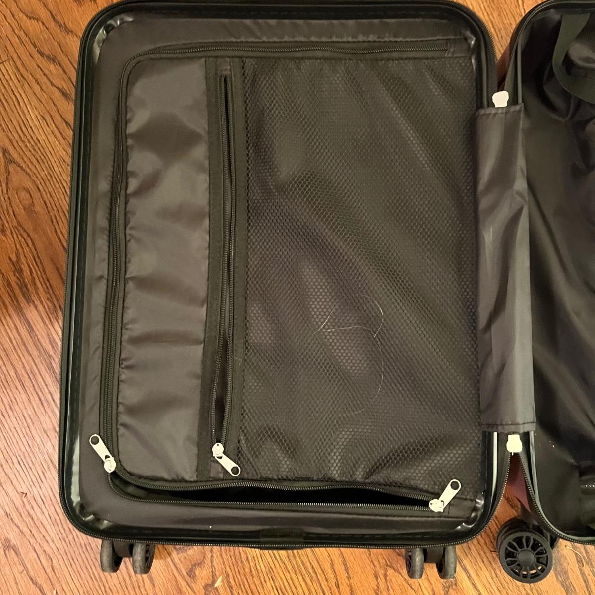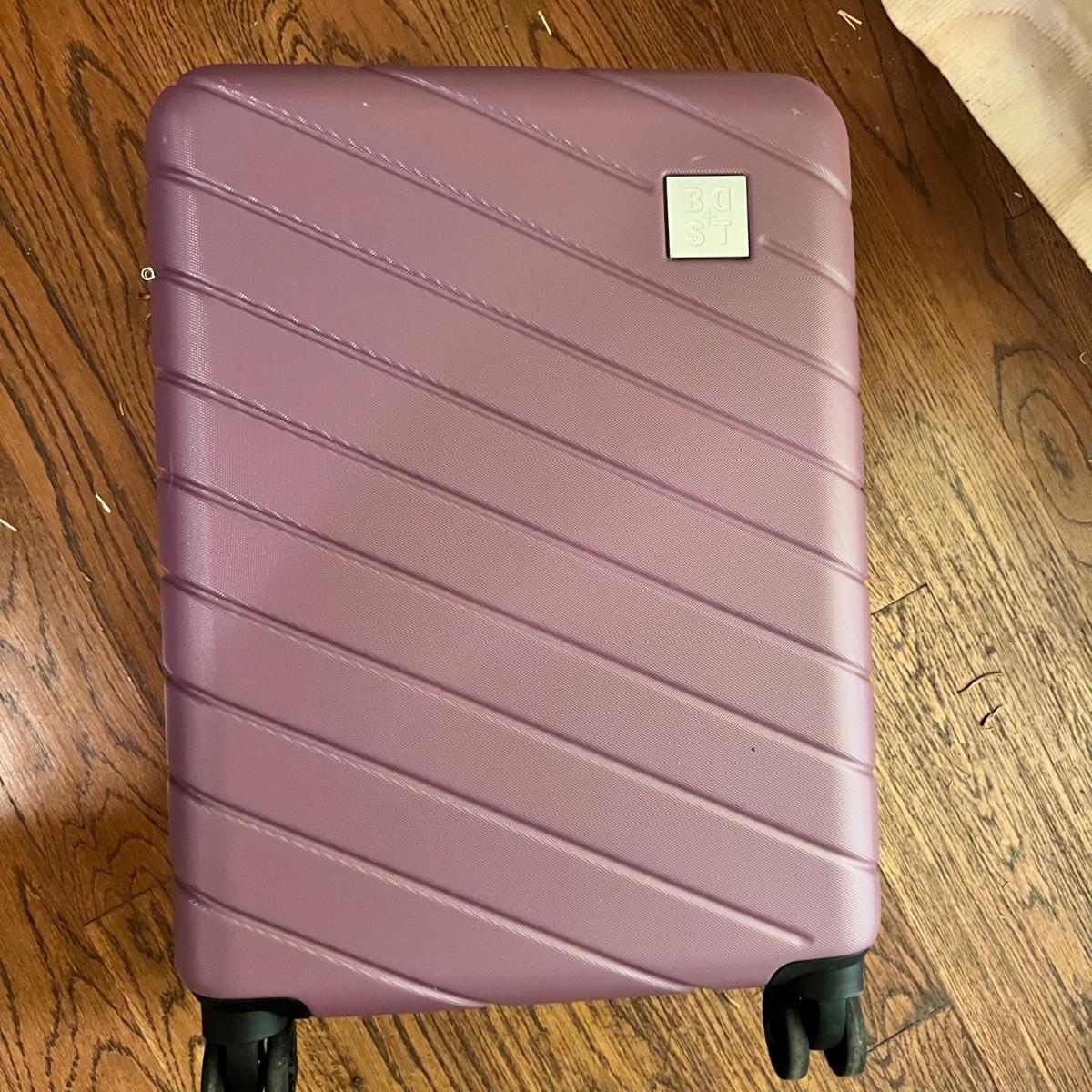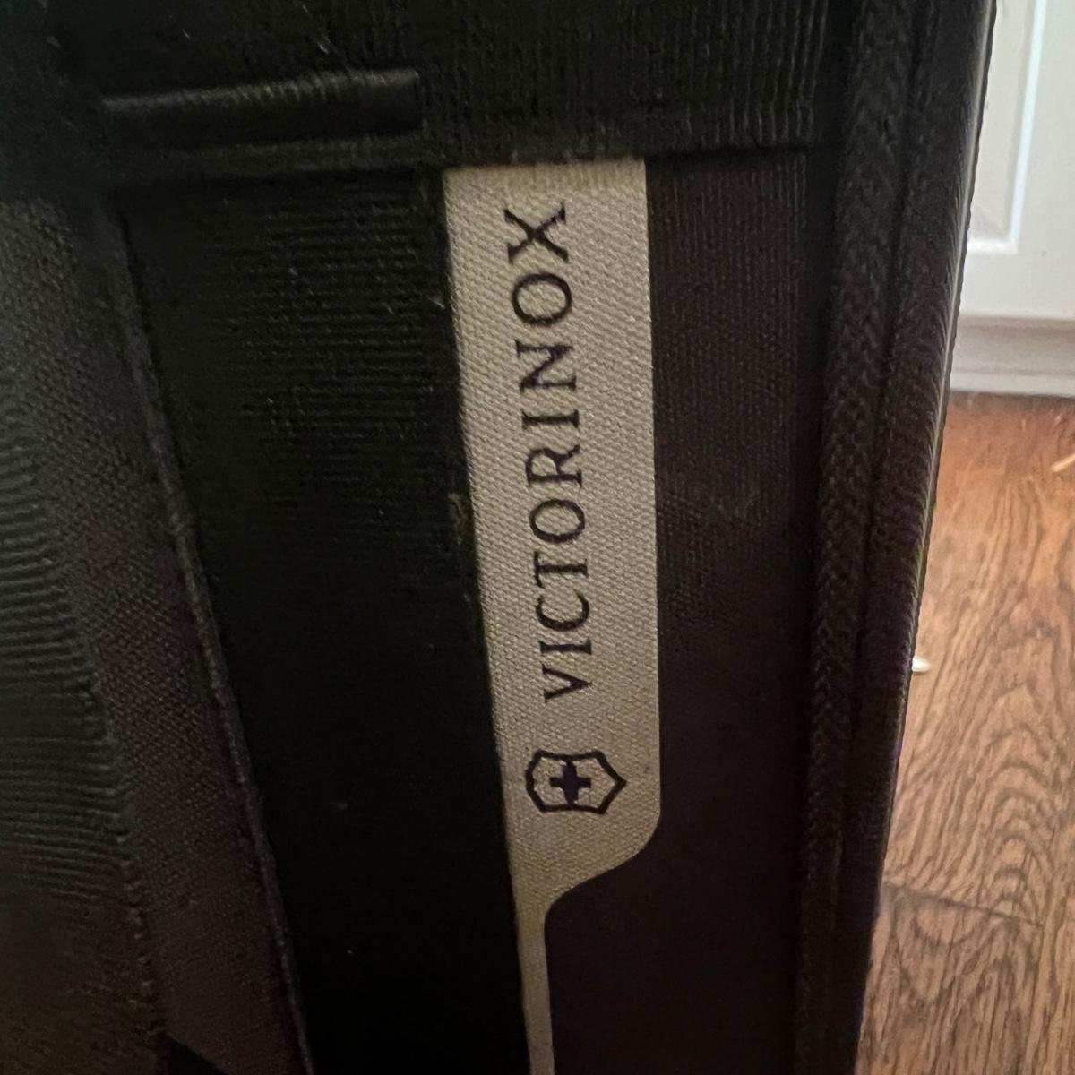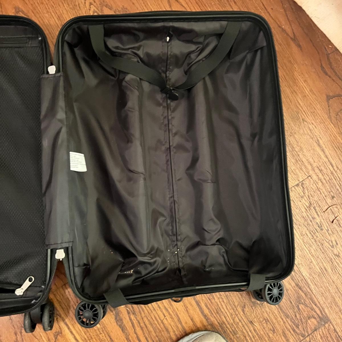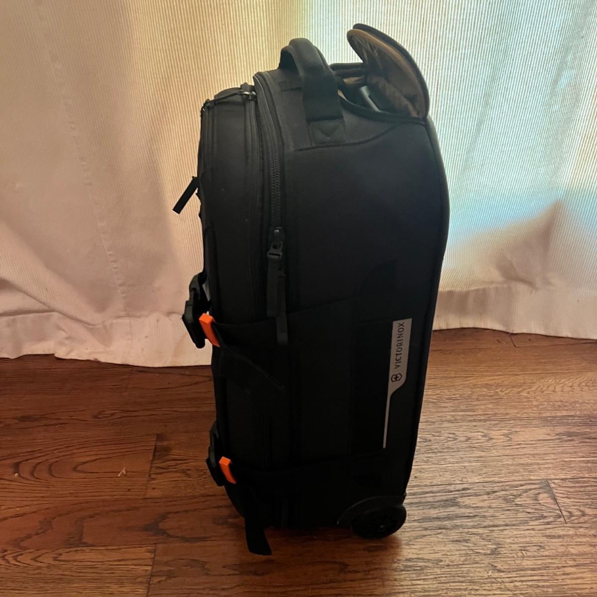 A black Victorinox roll a board suit case measures 15” x 9” x 22”H. The bag has an expandable zipper option (to make the bag wider) and an internal mesh garment holder. A green Eddie Bauer over the shoulder bag (no wheels) measures approximately 24” x 15” x 11”H. While this bag is not in a package, it appears to have never been used. A hard-sided purple Bond Street measures approximately 14” x 9” x 21”H. There are two similarly sized smaller carry bags (blue and black) that both measure appropriately 15” x 5” x 14”H.