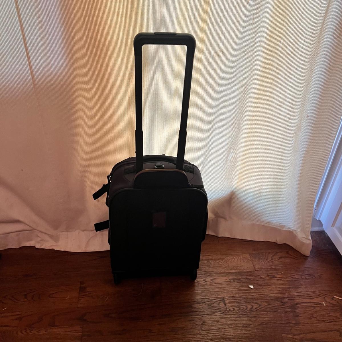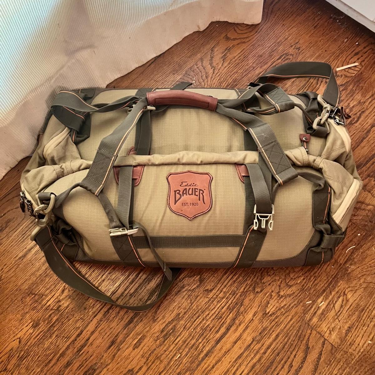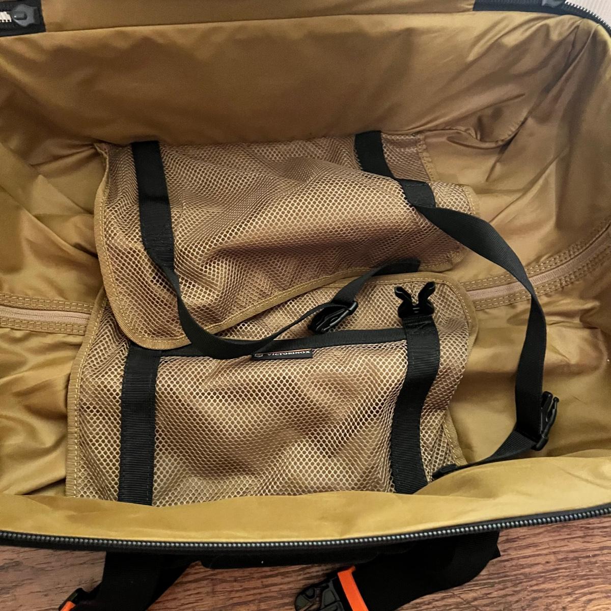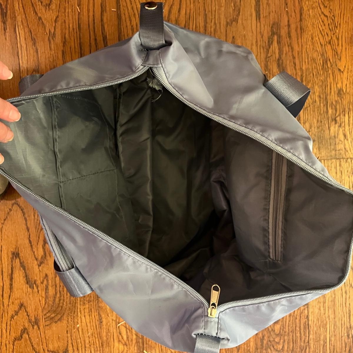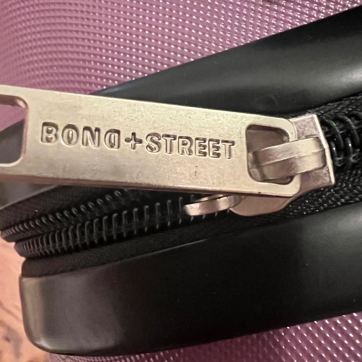 A black Victorinox roll a board suit case measures 15” x 9” x 22”H. The bag has an expandable zipper option (to make the bag wider) and an internal mesh garment holder. A green Eddie Bauer over the shoulder bag (no wheels) measures approximately 24” x 15” x 11”H. While this bag is not in a package, it appears to have never been used. A hard-sided purple Bond Street measures approximately 14” x 9” x 21”H. There are two similarly sized smaller carry bags (blue and black) that both measure appropriately 15” x 5” x 14”H.