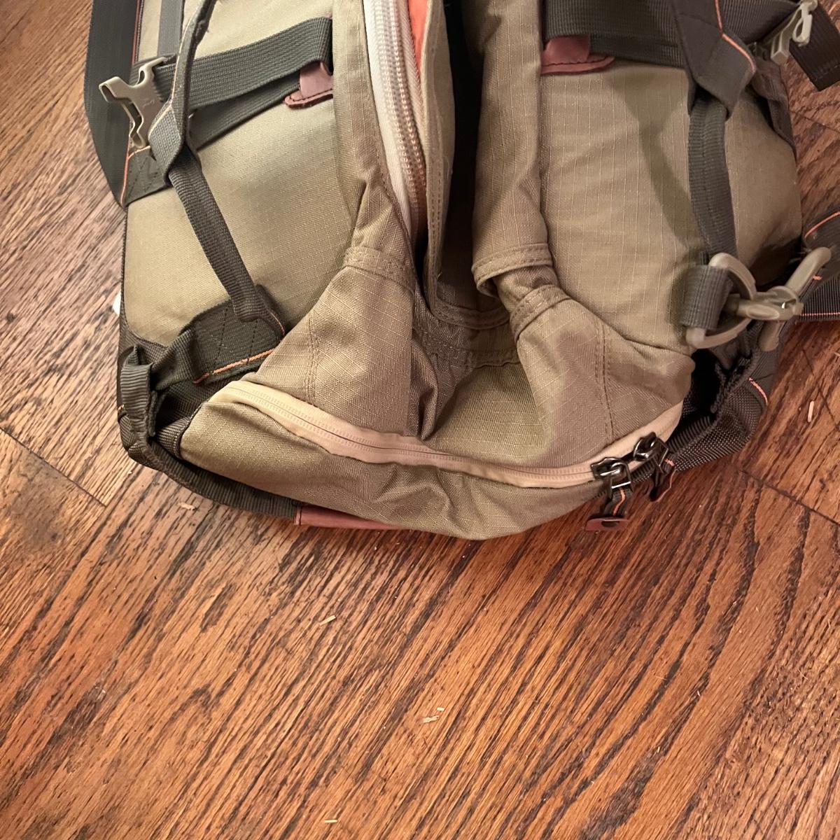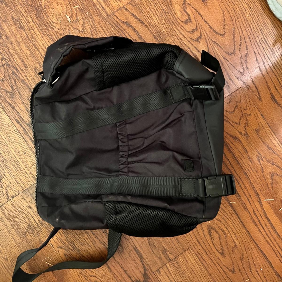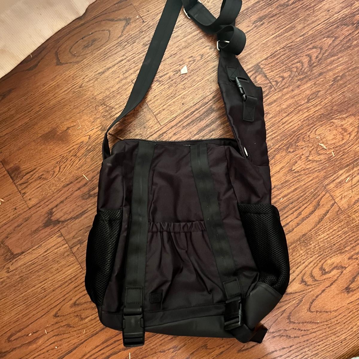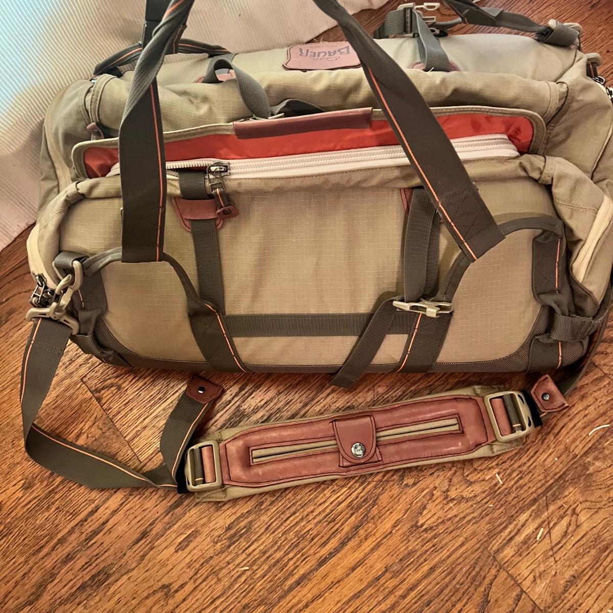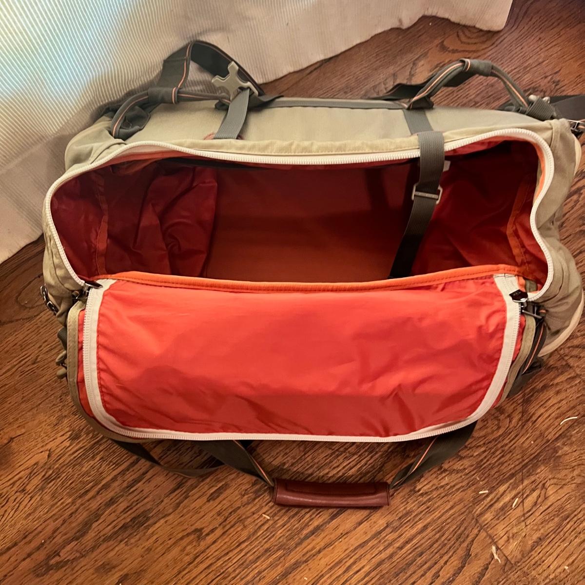 A black Victorinox roll a board suit case measures 15” x 9” x 22”H. The bag has an expandable zipper option (to make the bag wider) and an internal mesh garment holder. A green Eddie Bauer over the shoulder bag (no wheels) measures approximately 24” x 15” x 11”H. While this bag is not in a package, it appears to have never been used. A hard-sided purple Bond Street measures approximately 14” x 9” x 21”H. There are two similarly sized smaller carry bags (blue and black) that both measure appropriately 15” x 5” x 14”H.
