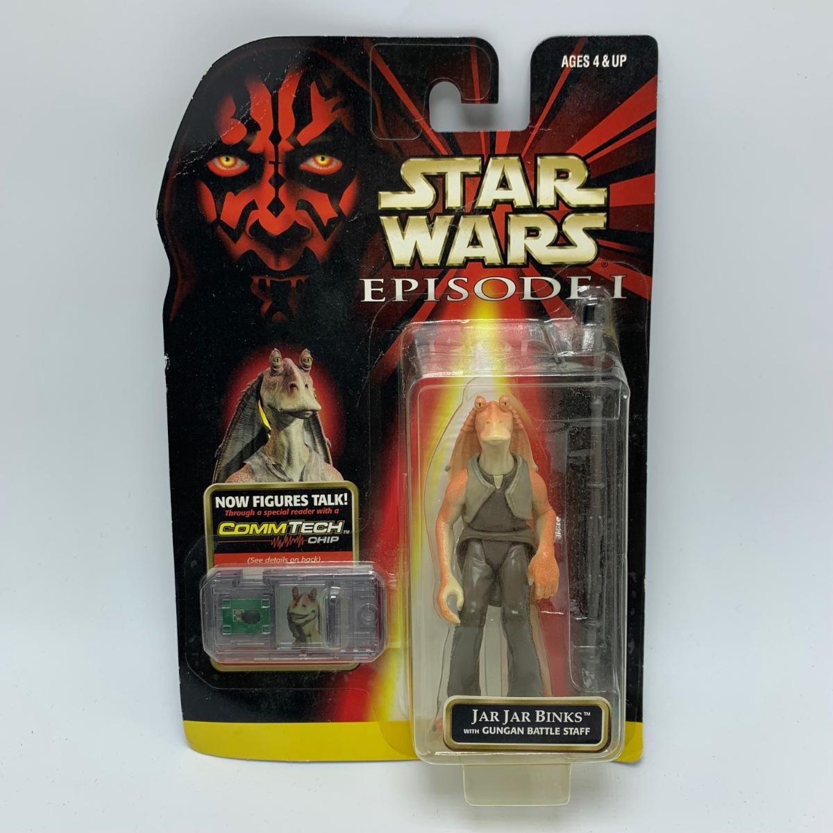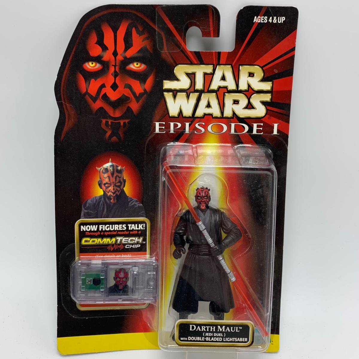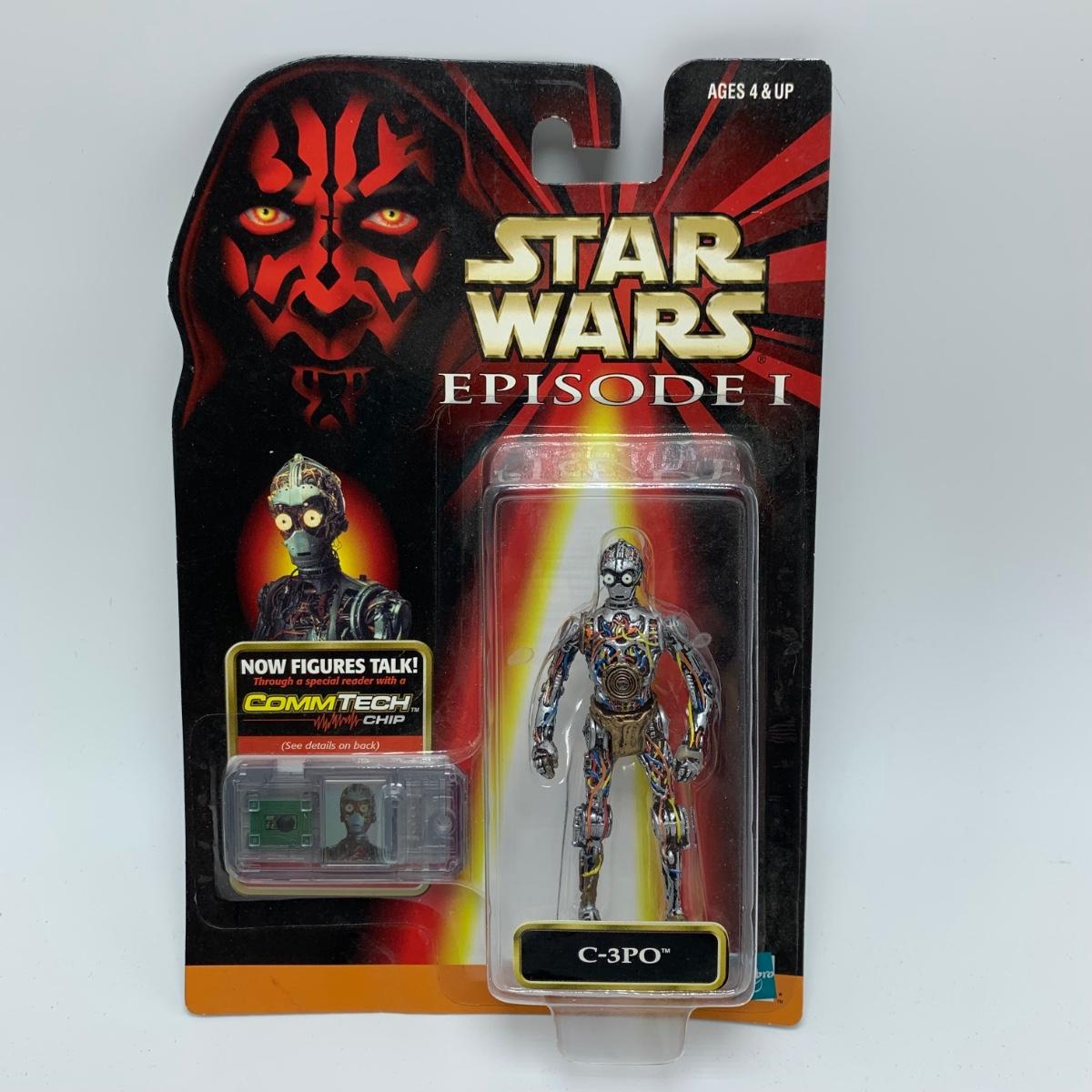 A collection of five unopened Star Wars Hasbro action figures. Four are from Star Wars Episode I and come with “CommTech Chips” that let the figures talk through a special reader. Each package measures approximately 6” x 9” and the figures are approximately 4”H.