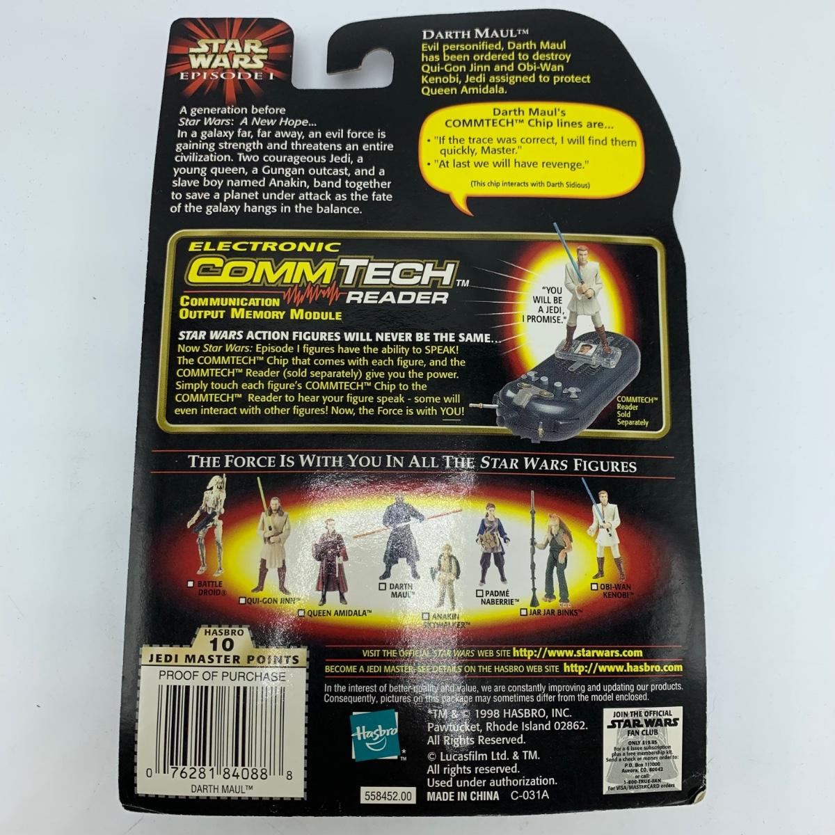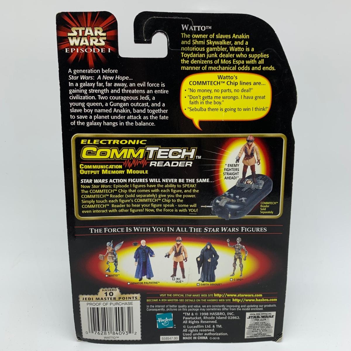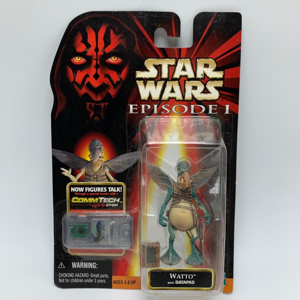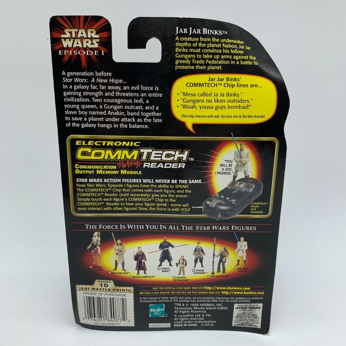 A collection of five unopened Star Wars Hasbro action figures. Four are from Star Wars Episode I and come with “CommTech Chips” that let the figures talk through a special reader. Each package measures approximately 6” x 9” and the figures are approximately 4”H.