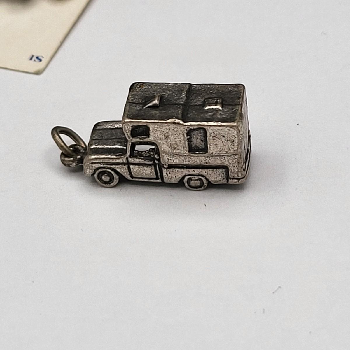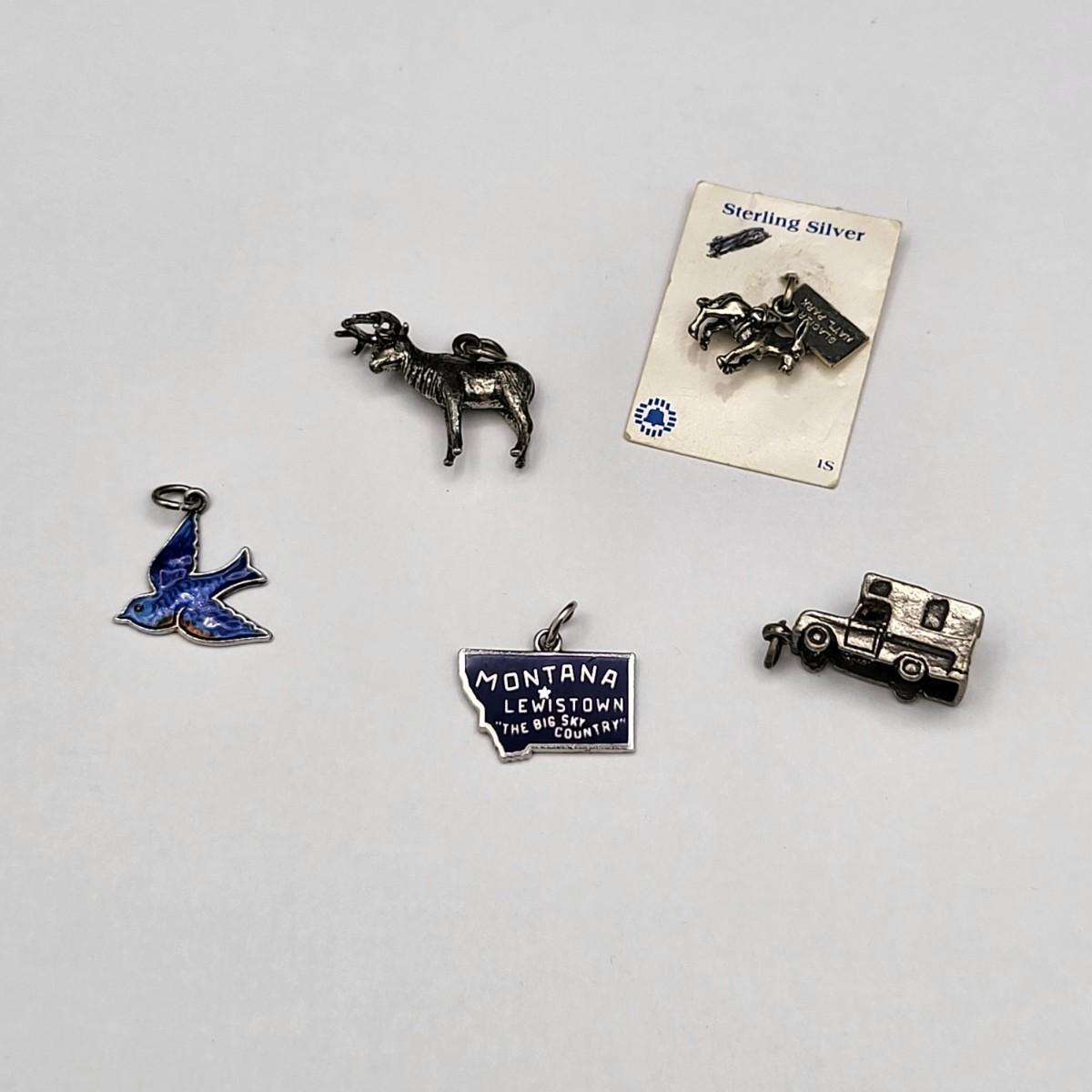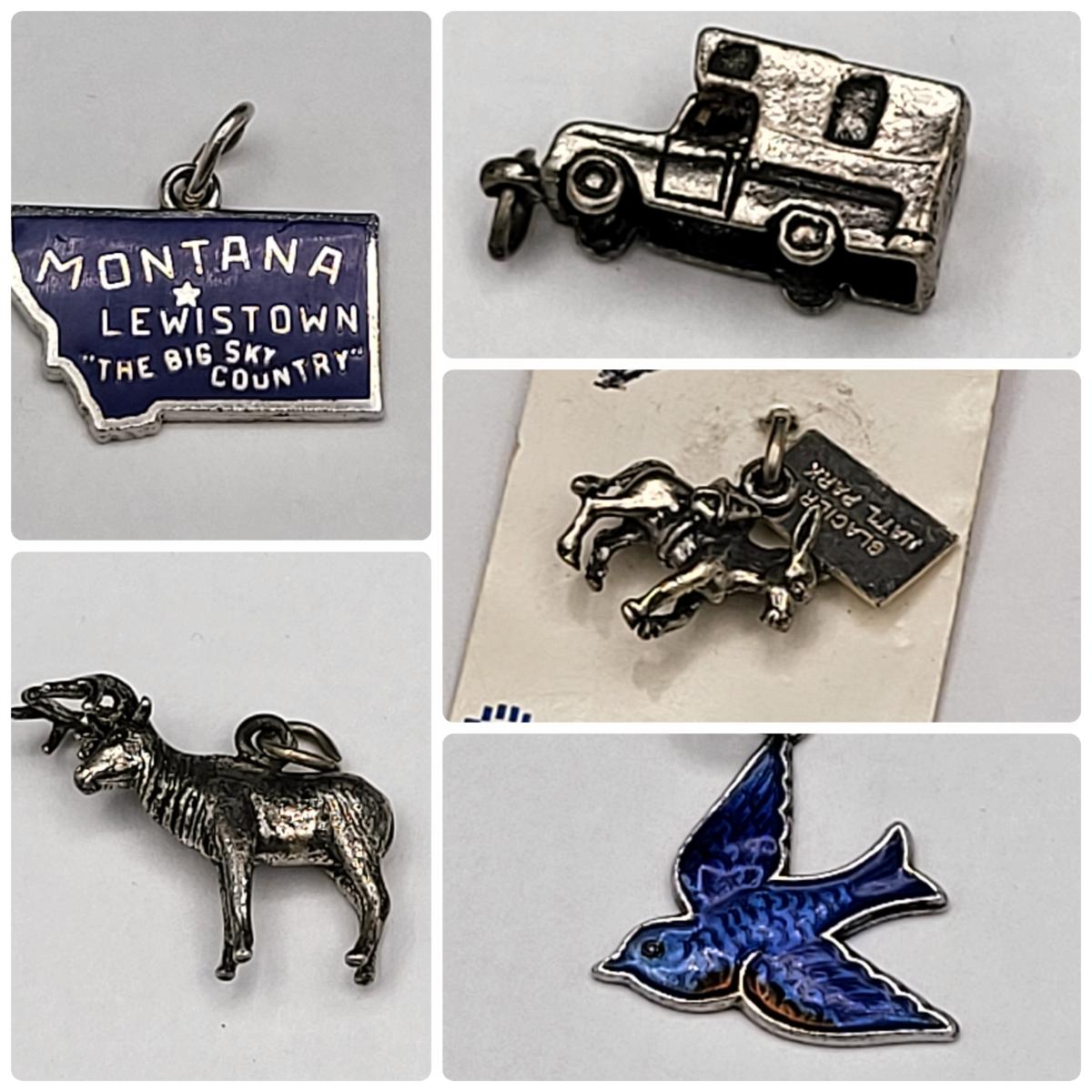 Five vintage souvenir charms: Blue enameled bird, blue ebameled Montana, Glacier National Park donkey, Stag and RV Truck. Three are sterling, two are unmarked but appear to be sterling.