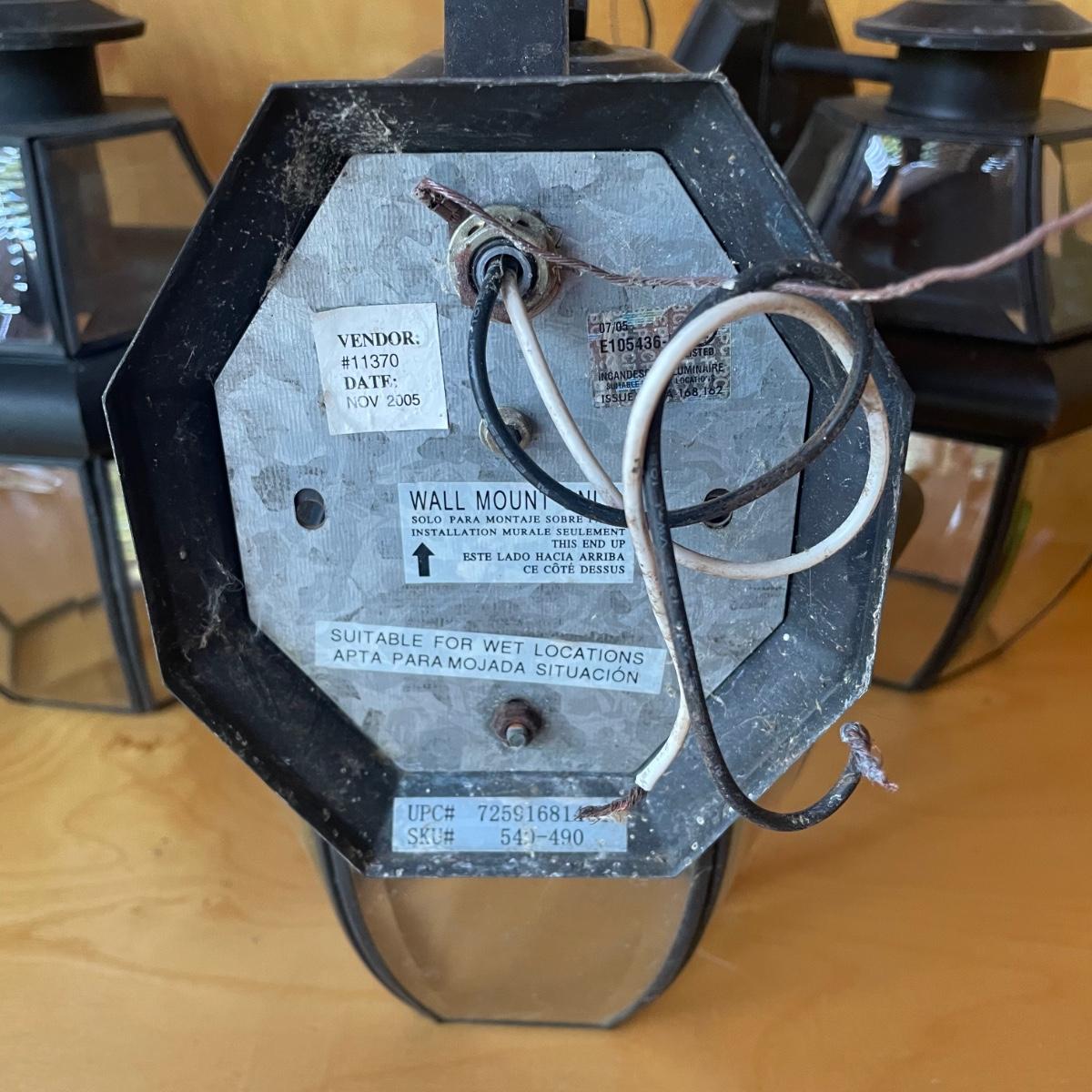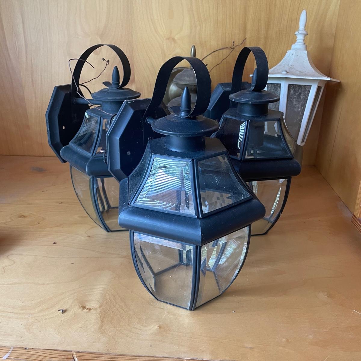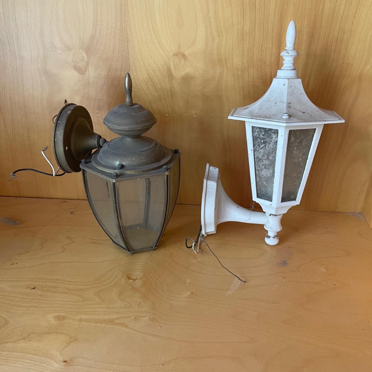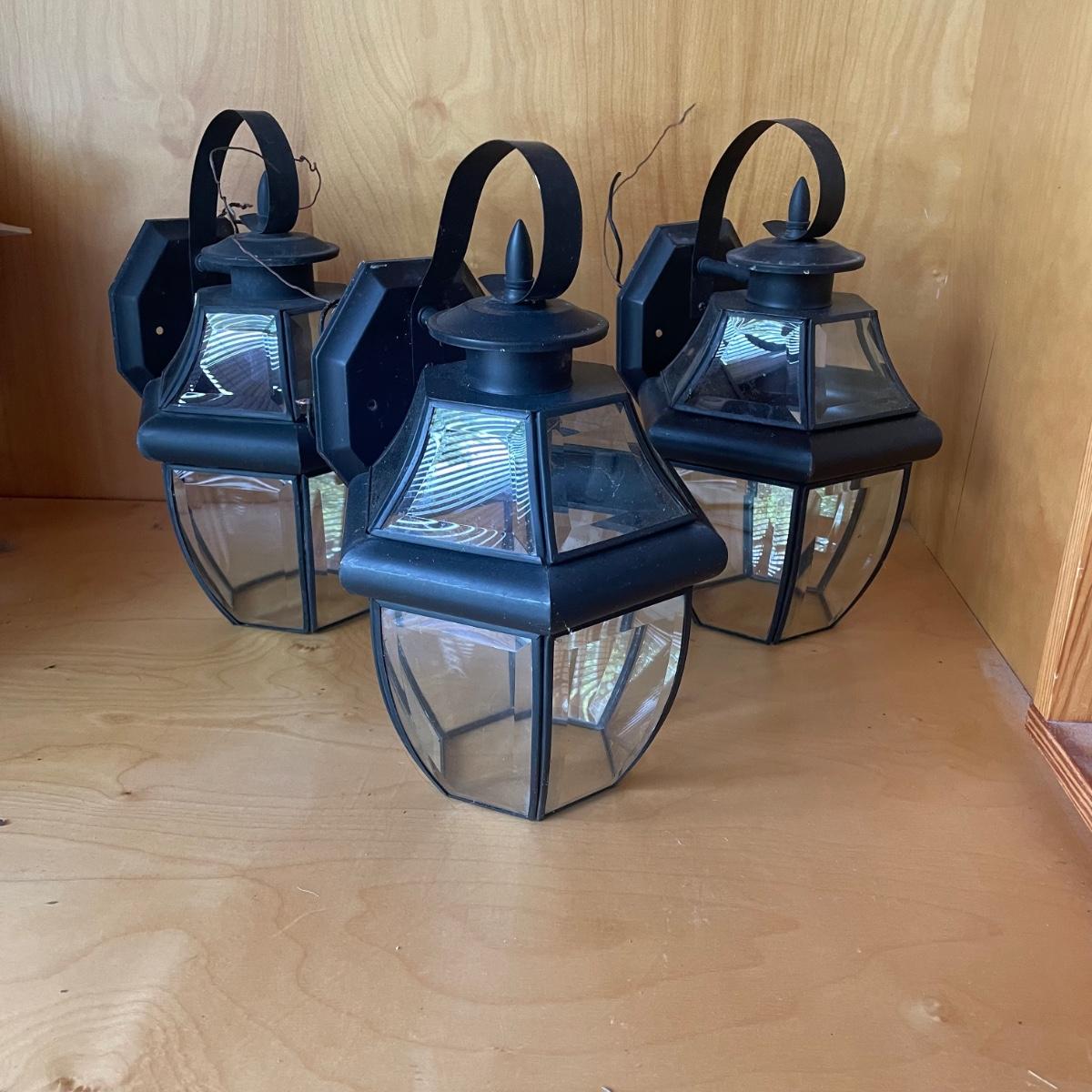 All 5 lights are metal and wall mount lights. The 3 that match are black metal with clear plastic sides and are the newest looking; they measure approximately 10” x 8” x 14”.