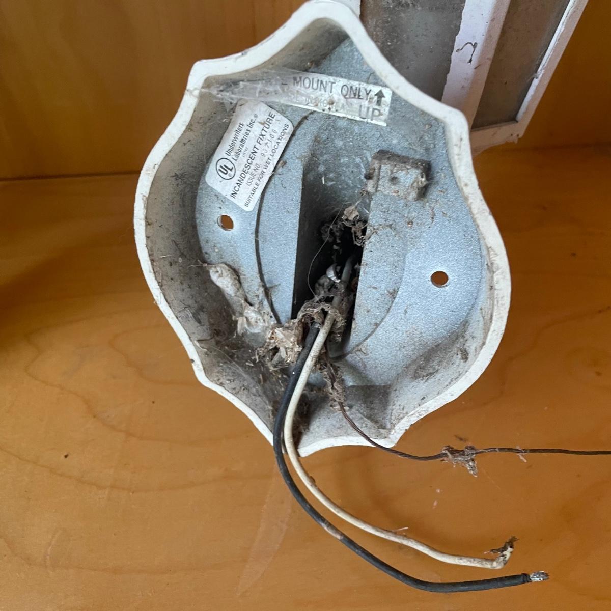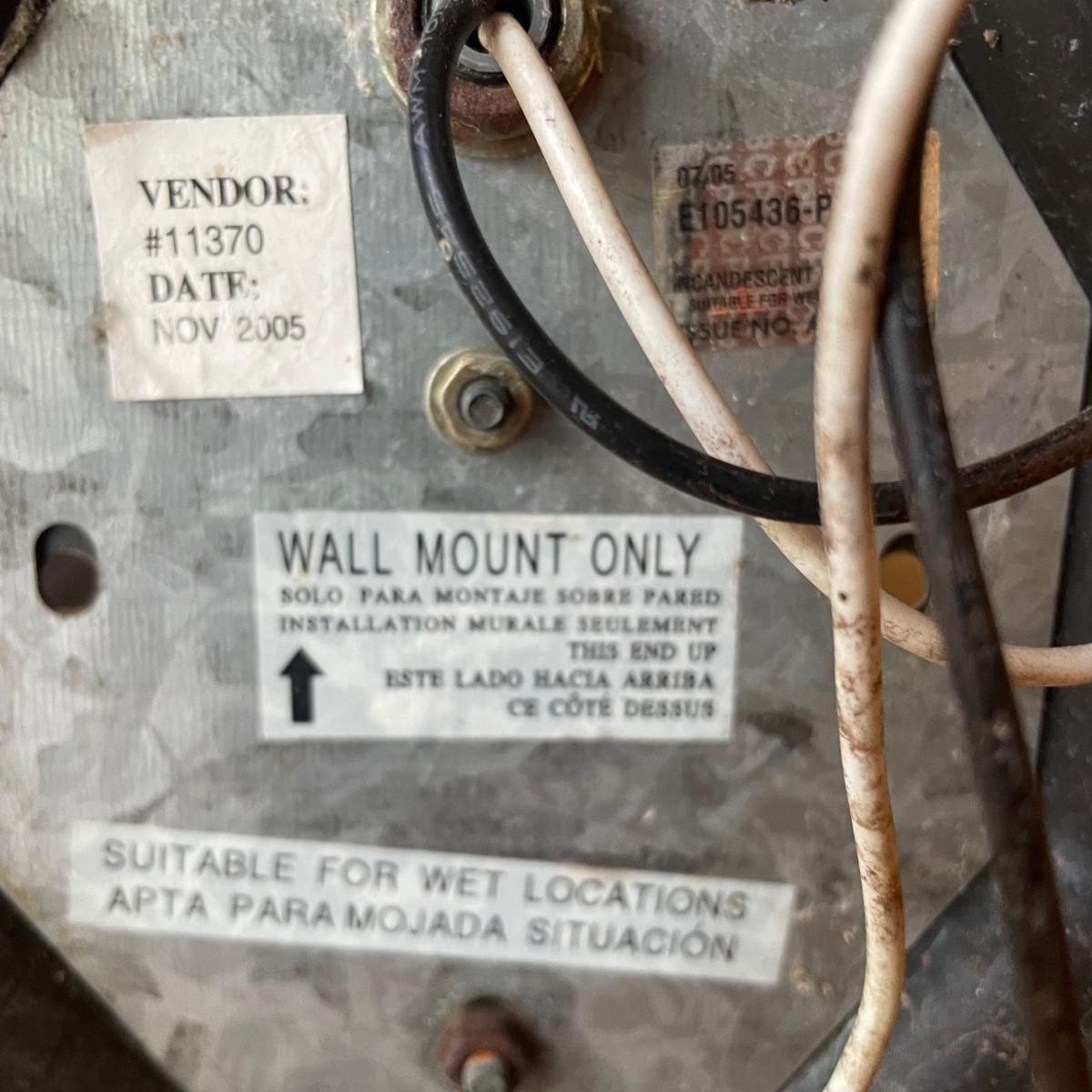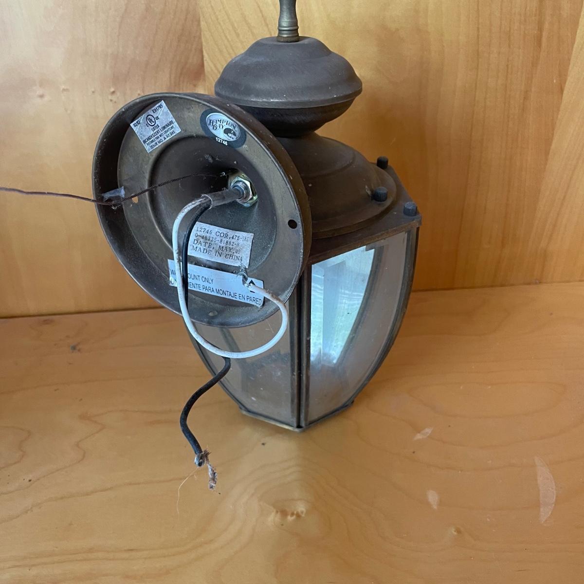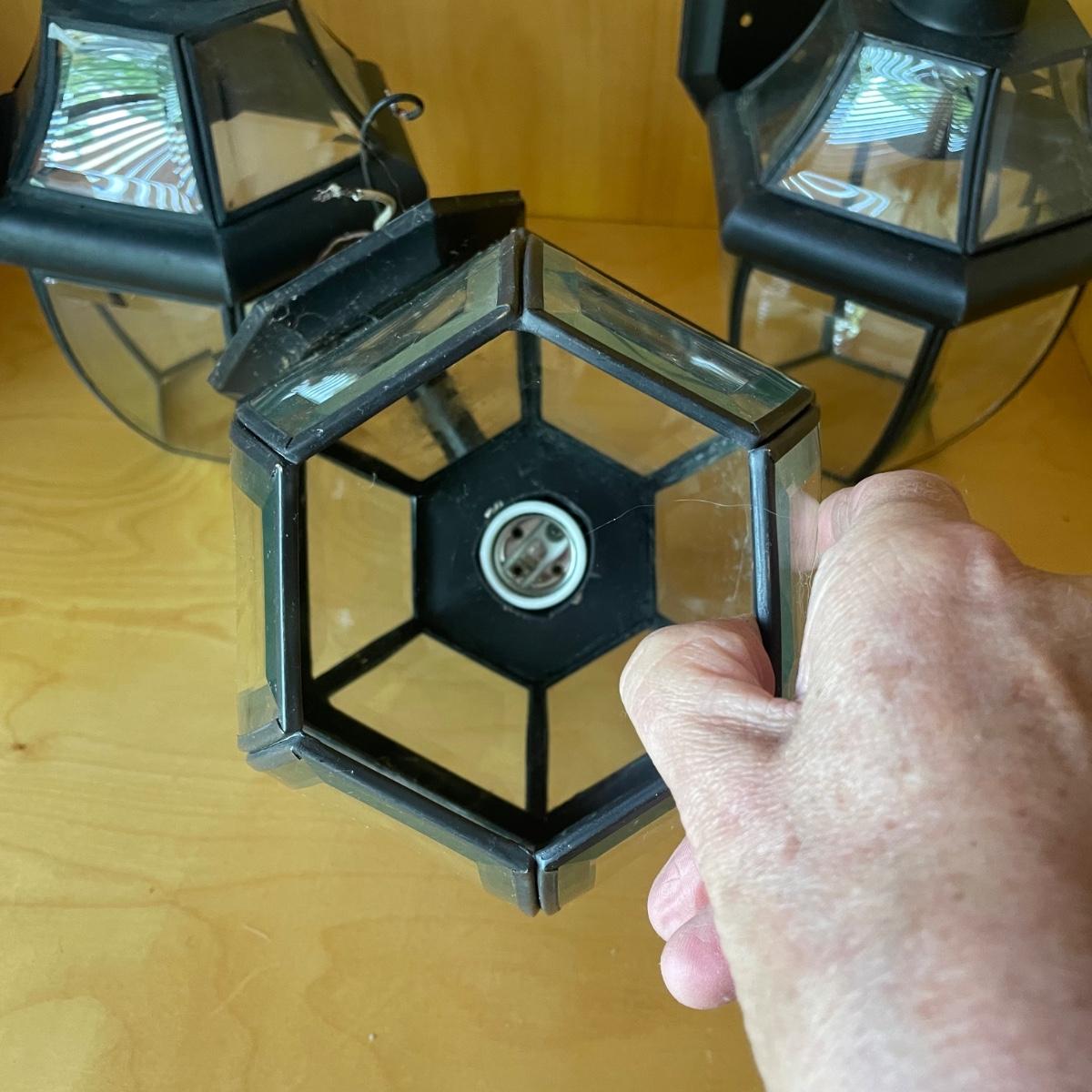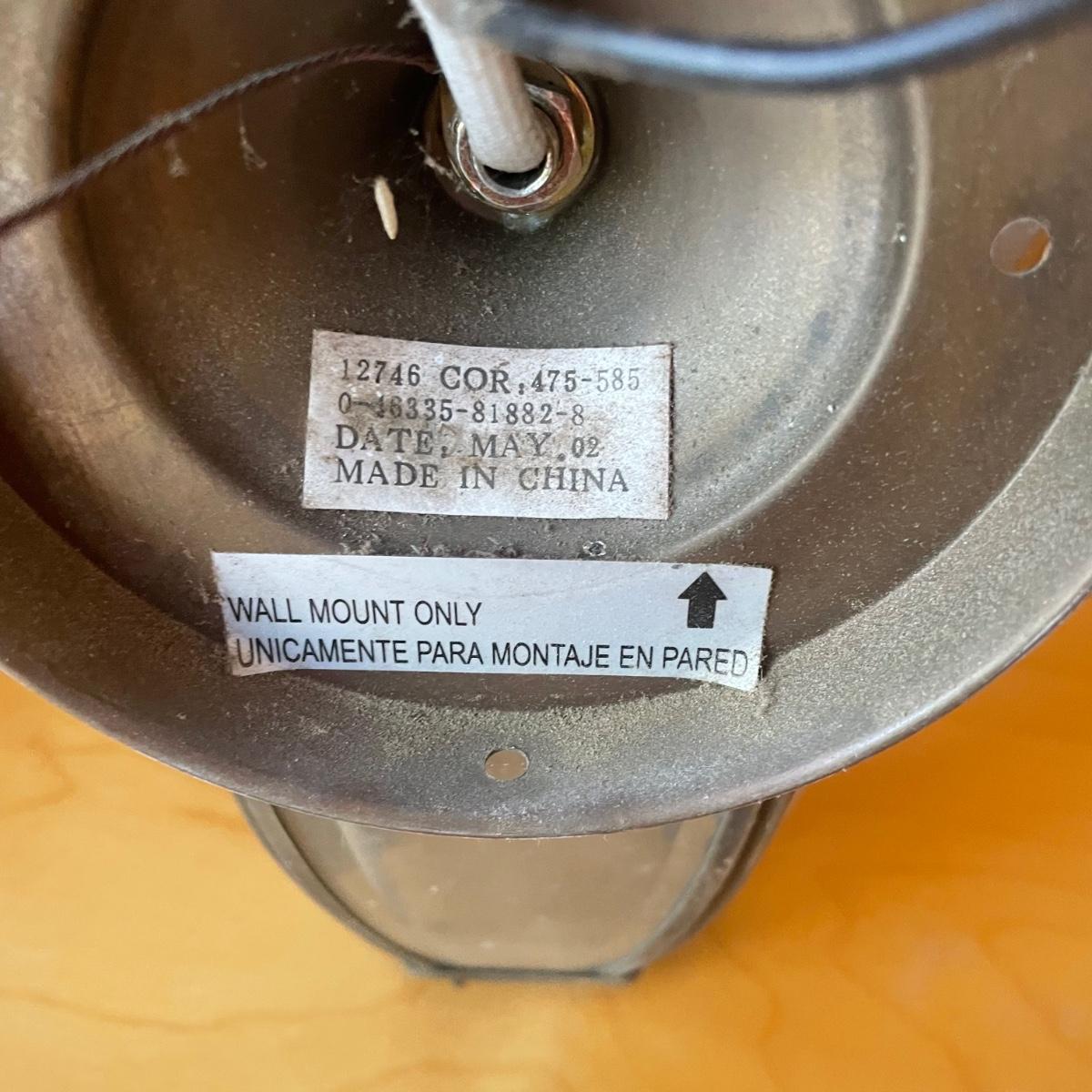All 5 lights are metal and wall mount lights. The 3 that match are black metal with clear plastic sides and are the newest looking; they measure approximately 10” x 8” x 14”.