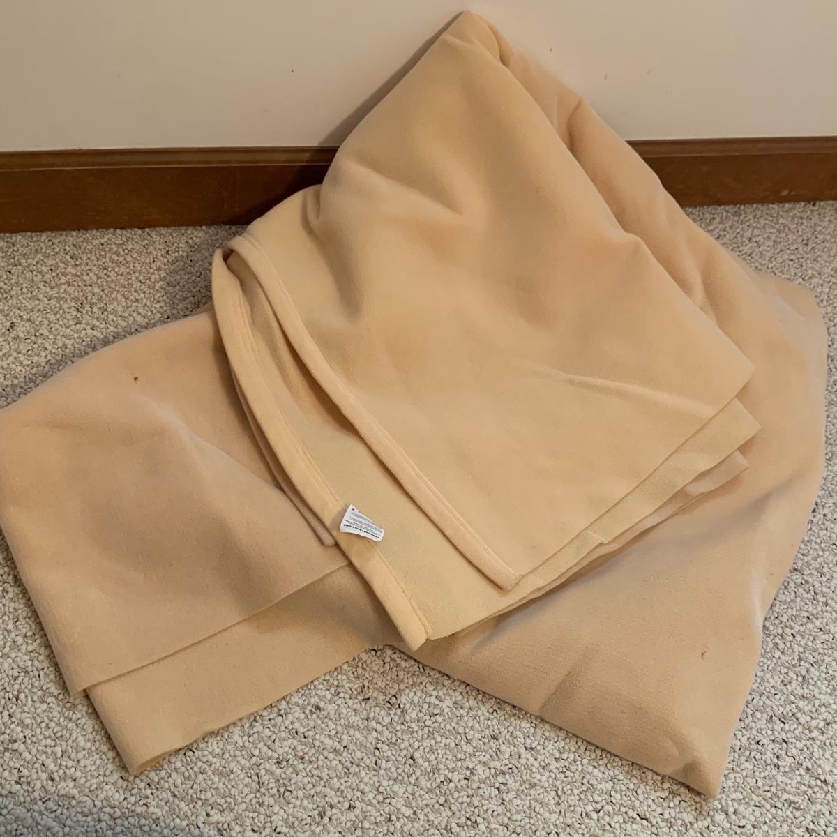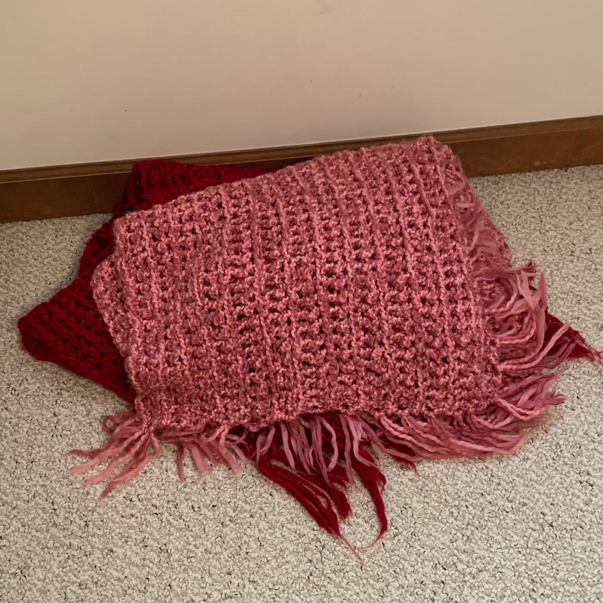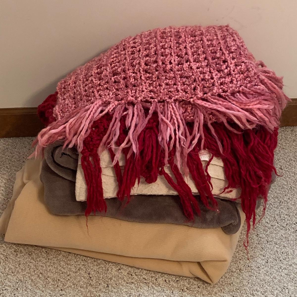 This lot includes five blankets. There is one pink and one red crocheted blanket with fringed edges. There is one off-white 100% cotton blanket. There is one plush gray blanket that is 100% polyester. It is a premium quality Berkshire Blanket and it is very soft and cozy. The last blanket is a queen size camel colored Vellux Blanket that is 100% nylon on an insulating base. It has a few small tears. It is very soft to the touch. Local pickup only.