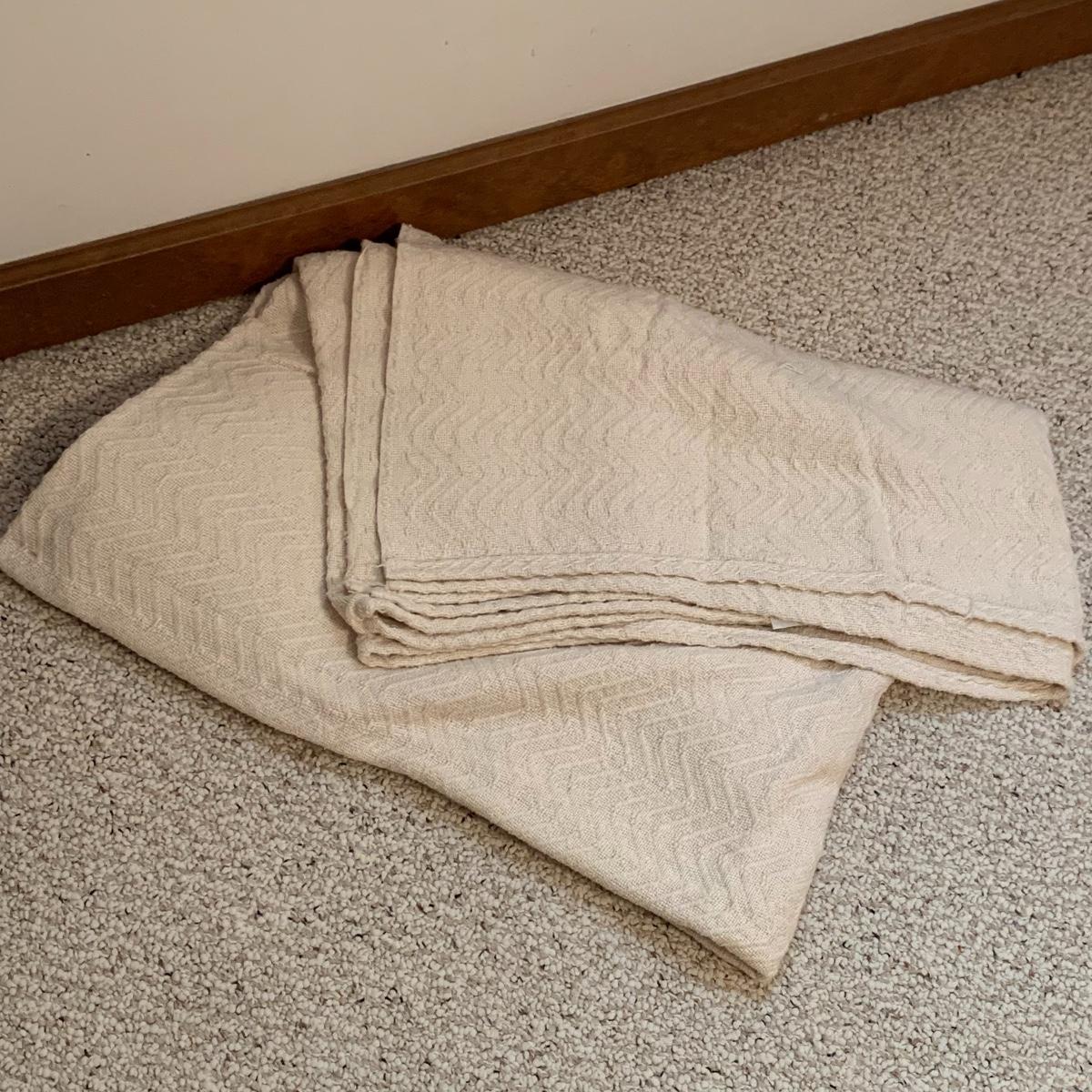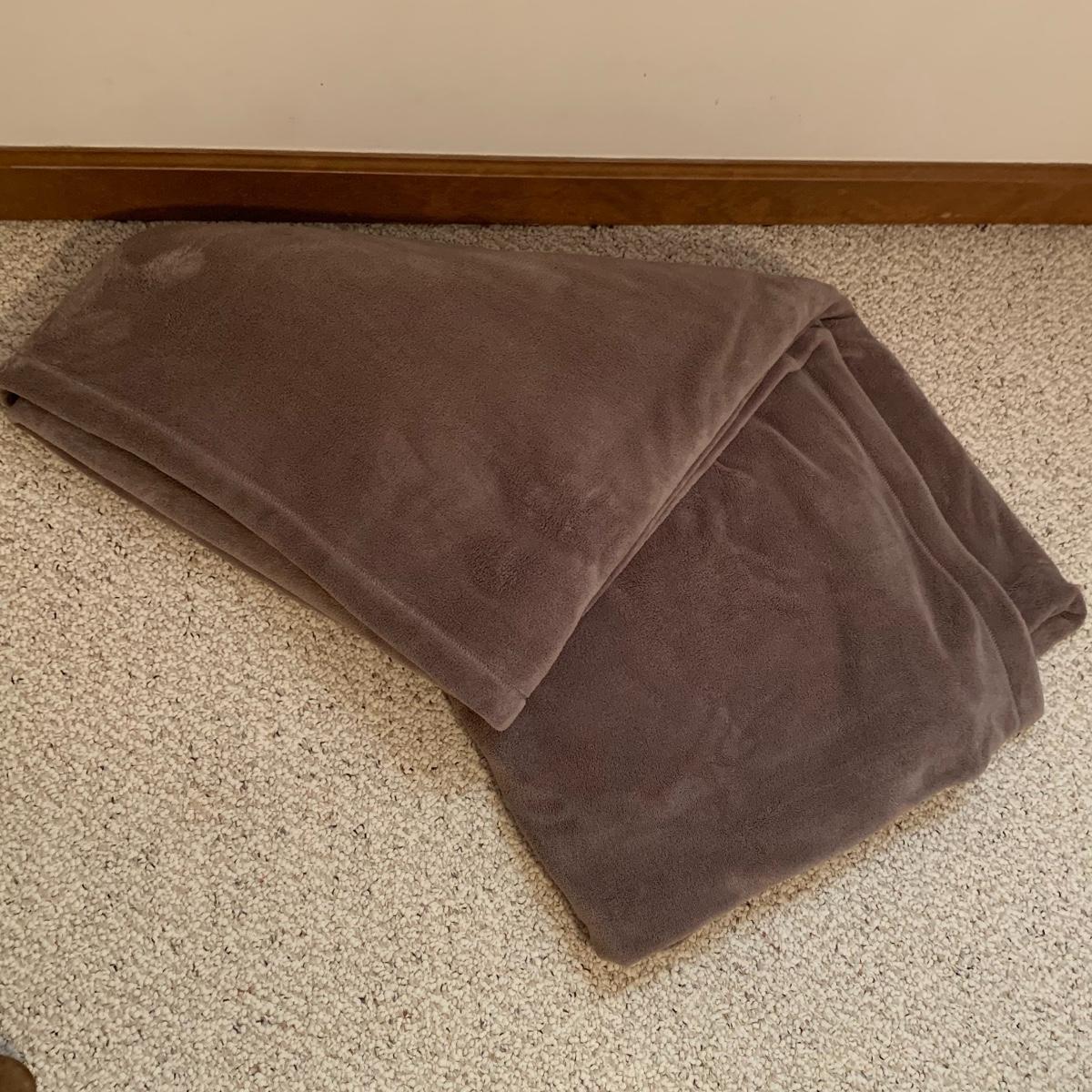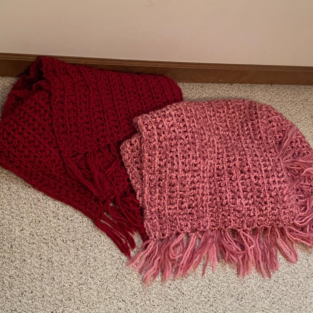 This lot includes five blankets. There is one pink and one red crocheted blanket with fringed edges. There is one off-white 100% cotton blanket. There is one plush gray blanket that is 100% polyester. It is a premium quality Berkshire Blanket and it is very soft and cozy. The last blanket is a queen size camel colored Vellux Blanket that is 100% nylon on an insulating base. It has a few small tears. It is very soft to the touch. Local pickup only.