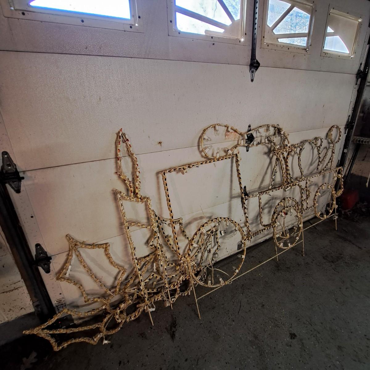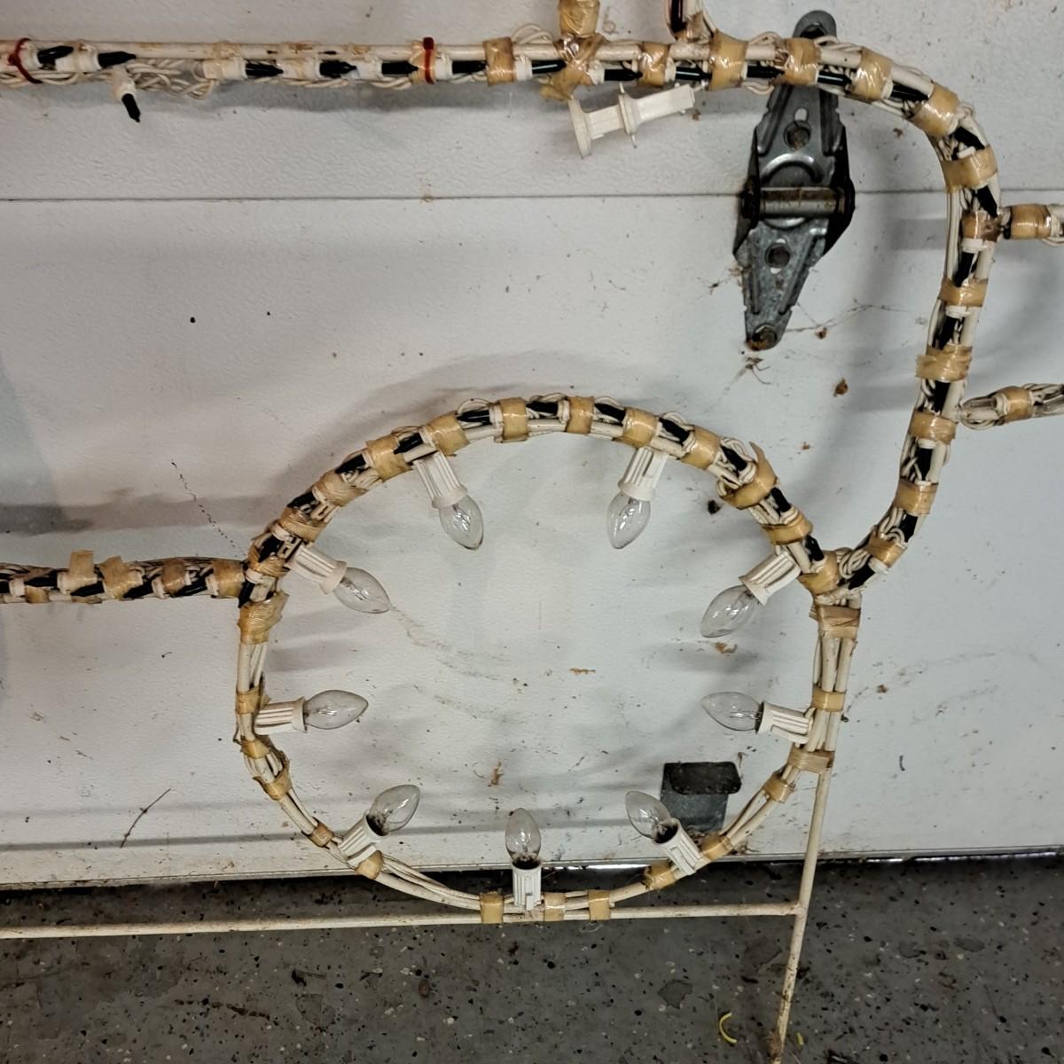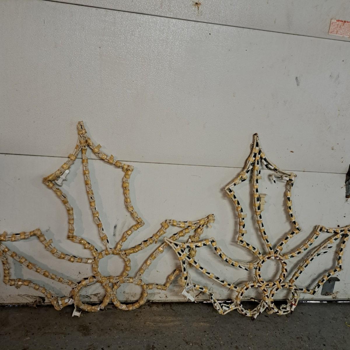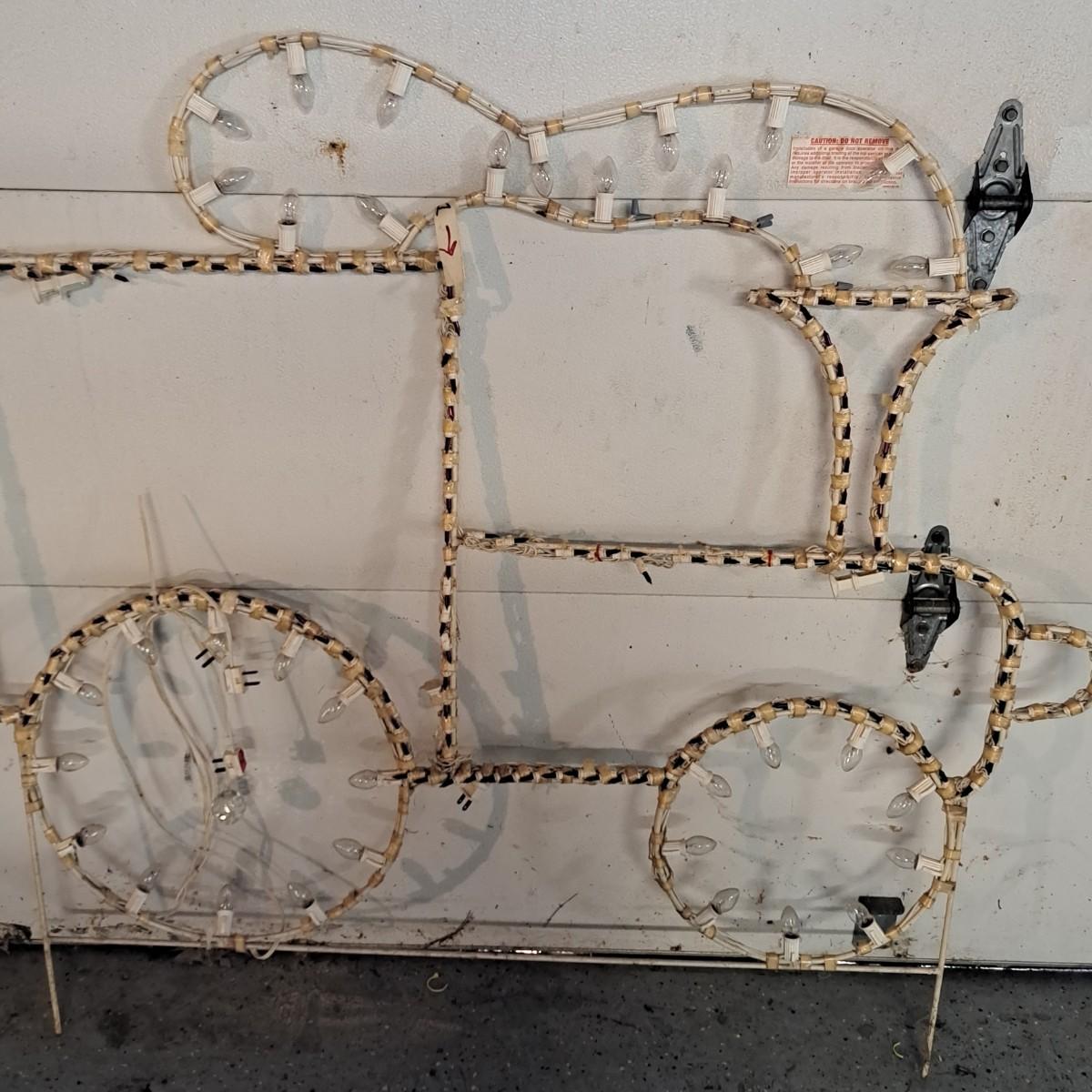 Each of these five outdoor decorative holiday pieces is made of wrought iron and meticulously wrapped with colorful mini-lights - and two pieces actually have some larger clear bulbs as shown. The smallest pieces are a pair of poinsettia leaves 27"H. The larger pieces include a burning candle with flame, a train locomotive blowing smoke and a Christmas tree topped with a star on a train car while a bear peeps over the edge of the car, each approximately 42"-46"H. All pieces powered on when plugged in - ready for next year! There are a few areas of loose tape as shown. Local pickup only.