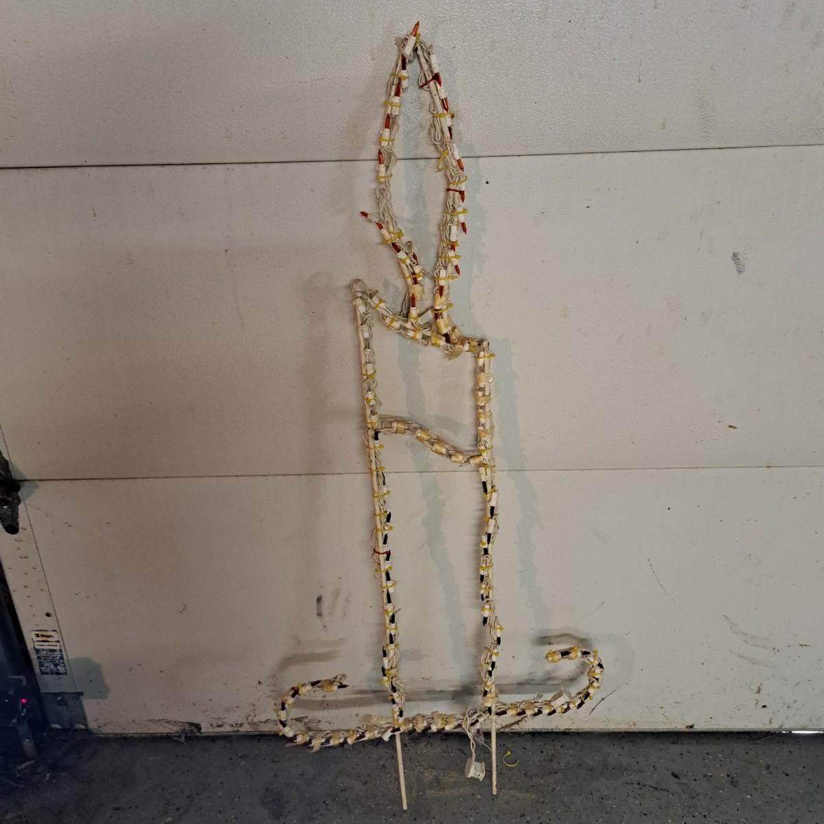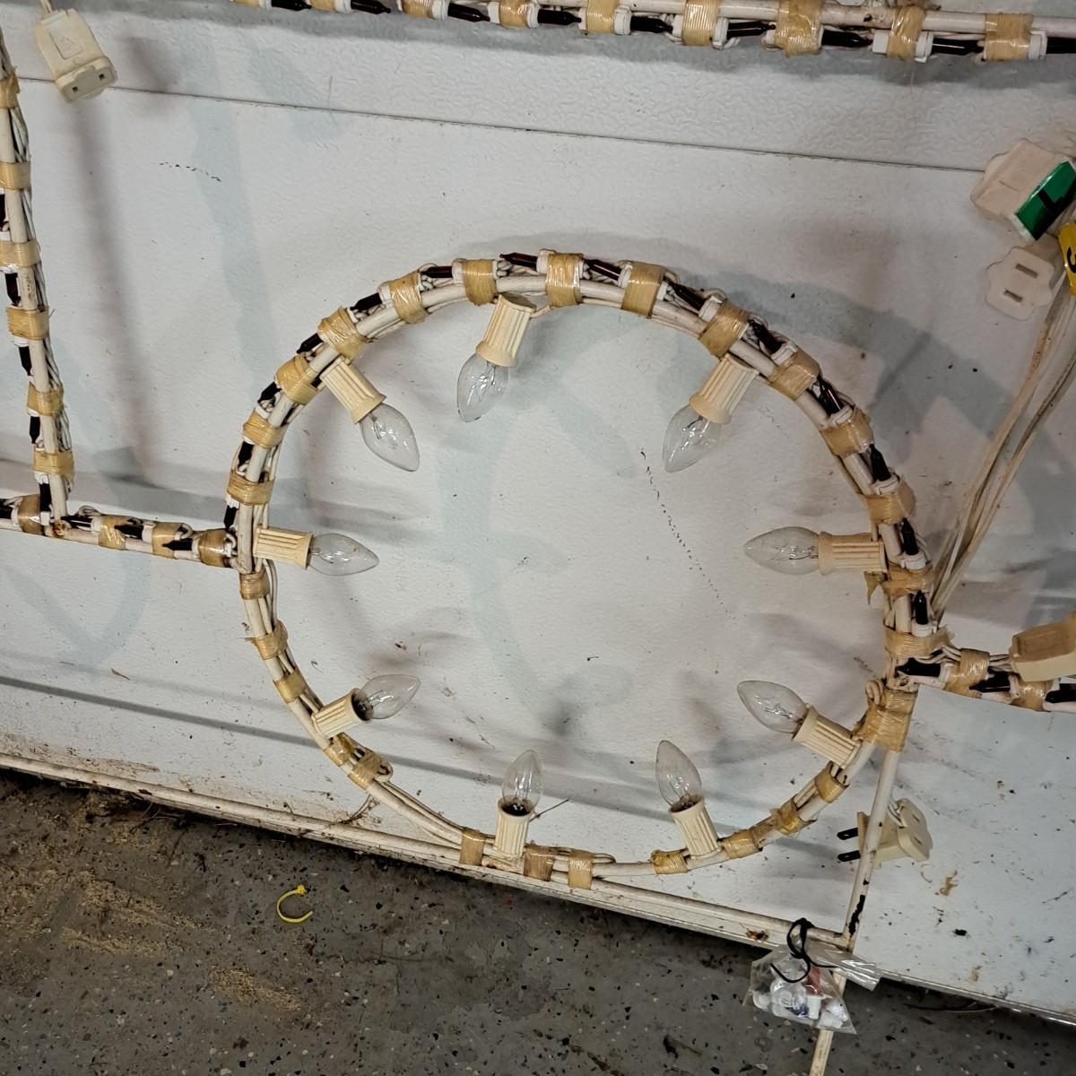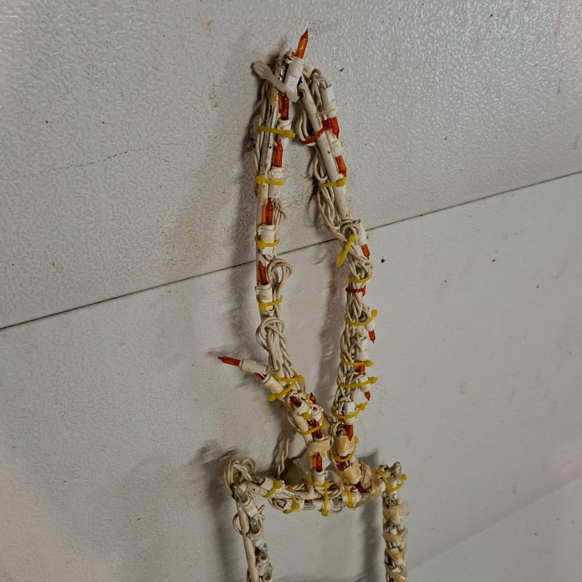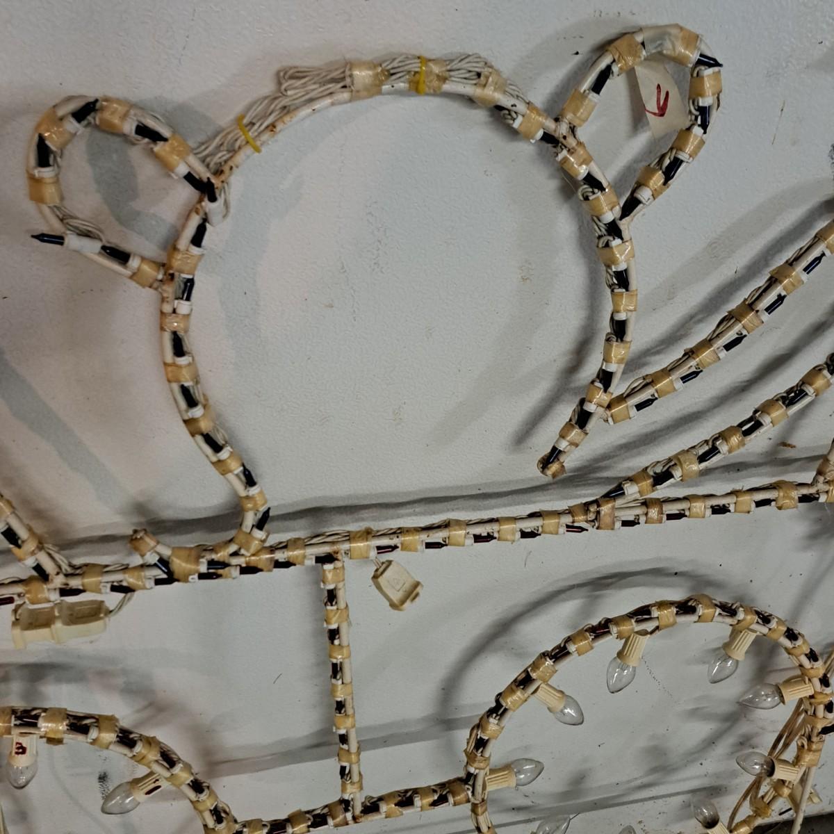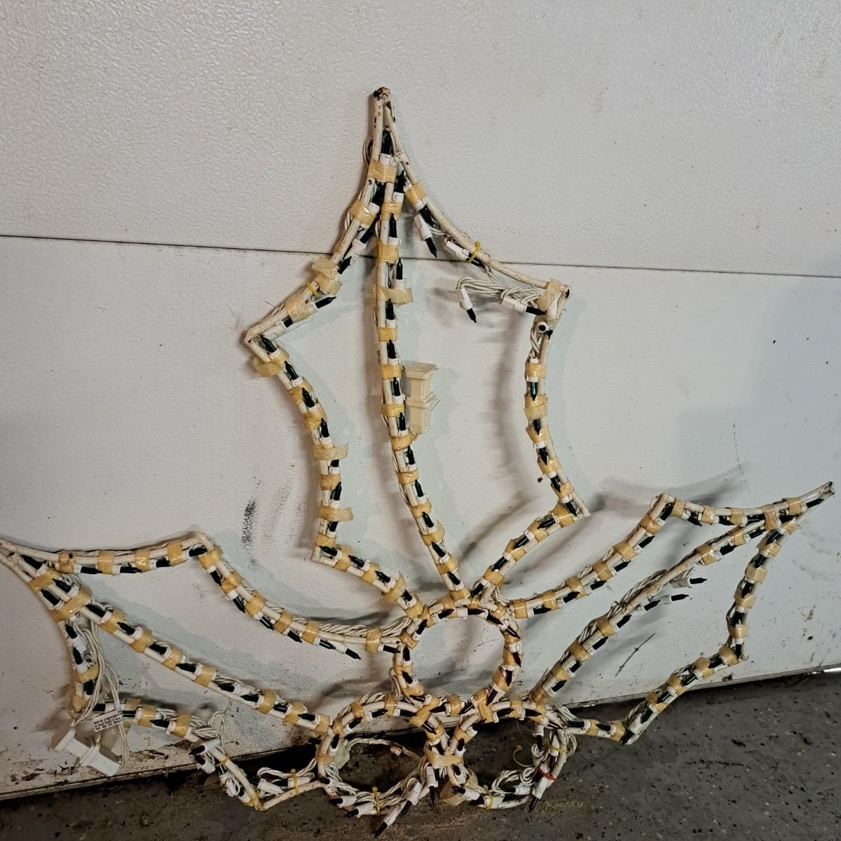 Each of these five outdoor decorative holiday pieces is made of wrought iron and meticulously wrapped with colorful mini-lights - and two pieces actually have some larger clear bulbs as shown. The smallest pieces are a pair of poinsettia leaves 27"H. The larger pieces include a burning candle with flame, a train locomotive blowing smoke and a Christmas tree topped with a star on a train car while a bear peeps over the edge of the car, each approximately 42"-46"H. All pieces powered on when plugged in - ready for next year! There are a few areas of loose tape as shown. Local pickup only.