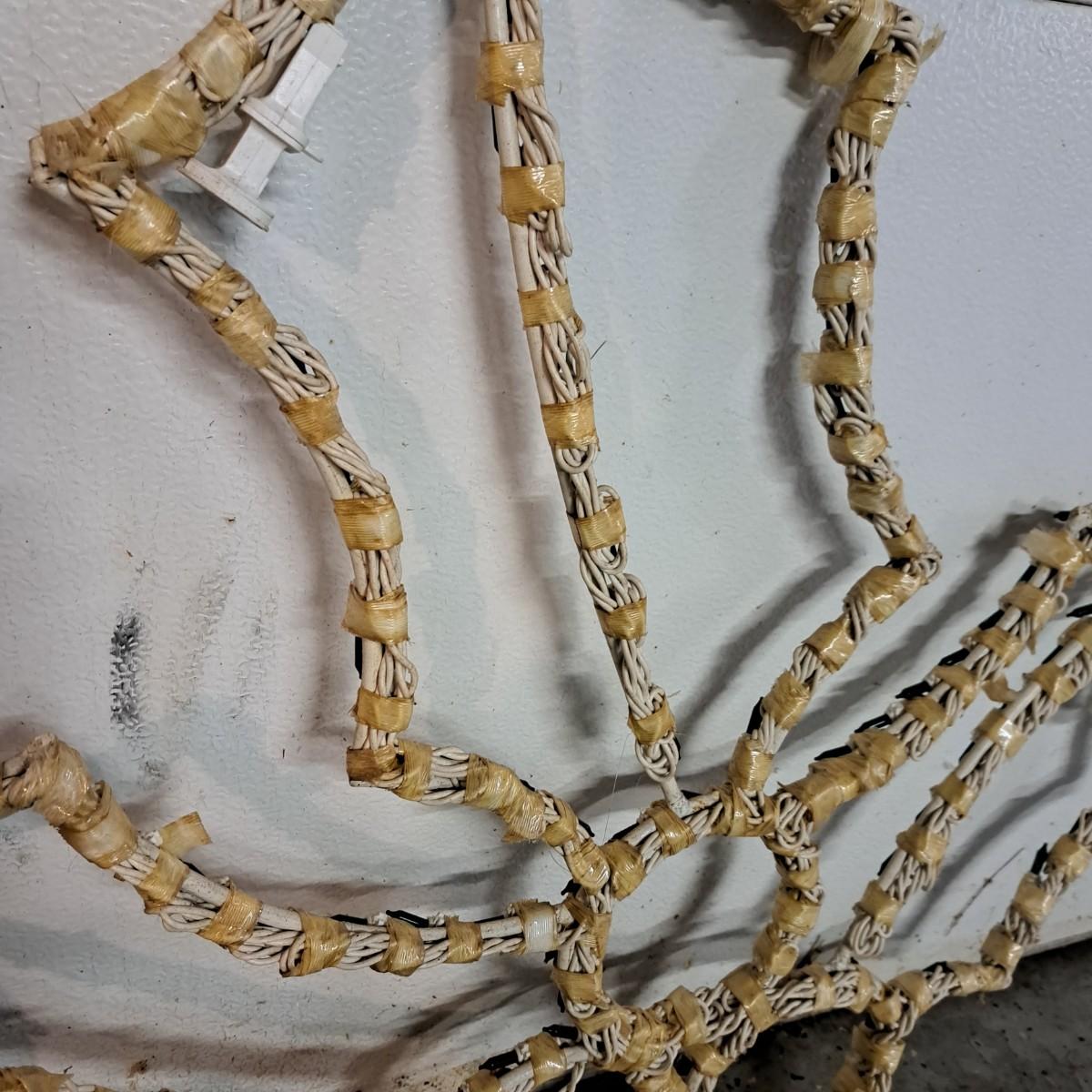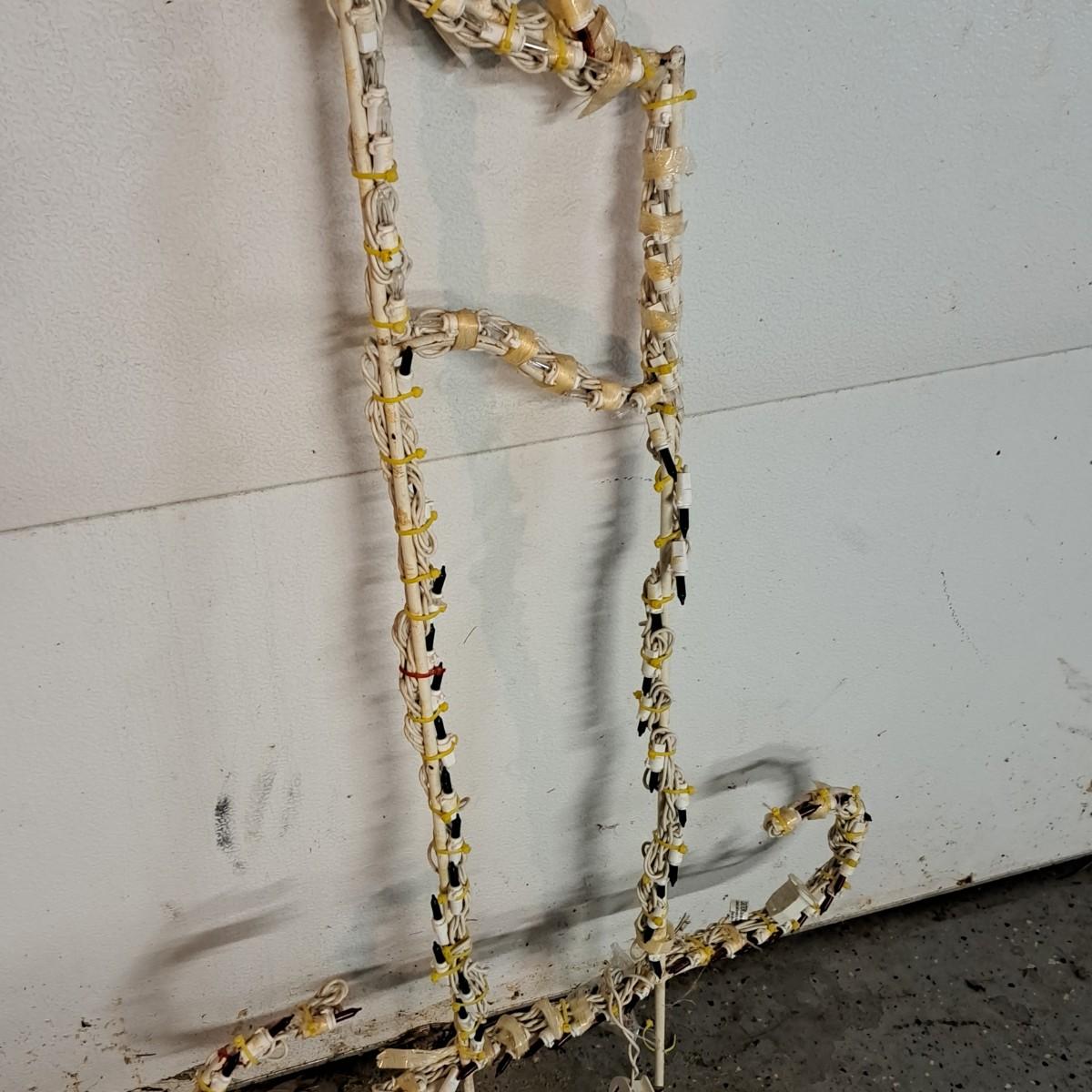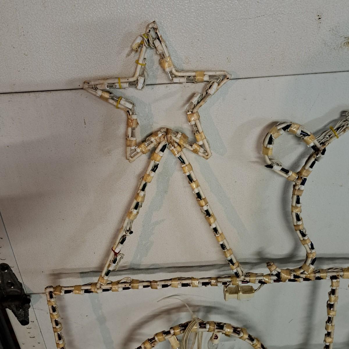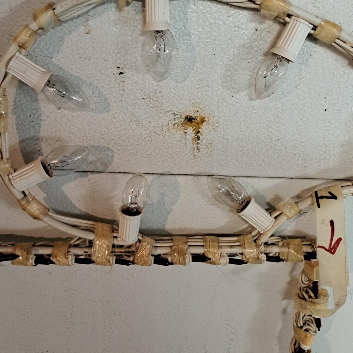 Each of these five outdoor decorative holiday pieces is made of wrought iron and meticulously wrapped with colorful mini-lights - and two pieces actually have some larger clear bulbs as shown. The smallest pieces are a pair of poinsettia leaves 27"H. The larger pieces include a burning candle with flame, a train locomotive blowing smoke and a Christmas tree topped with a star on a train car while a bear peeps over the edge of the car, each approximately 42"-46"H. All pieces powered on when plugged in - ready for next year! There are a few areas of loose tape as shown. Local pickup only.